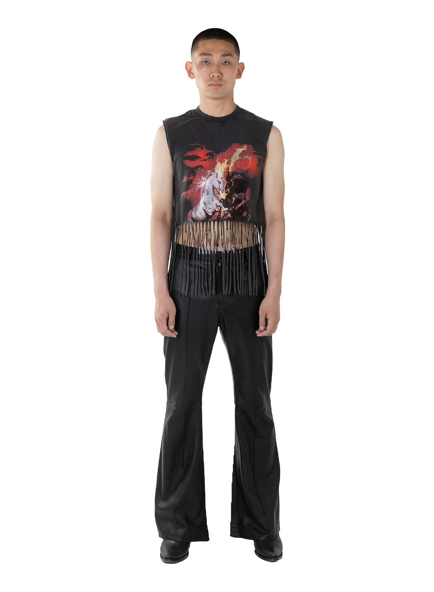 BUILT LIKE A UNIFORM FOR WILD RIDES AND BROKEN FENCES, THE BRONCO TEE SITS CLOSE WITH STRETCH COMFORT AND A FADED VINTAGE BLACK FINISH. DESIGNED TO FEEL FAST, RECKLESS, AND UNCONTROLLED, LIKE A STALLION THAT REFUSES THE HARNESS. MODEL WEARS SIZE M.