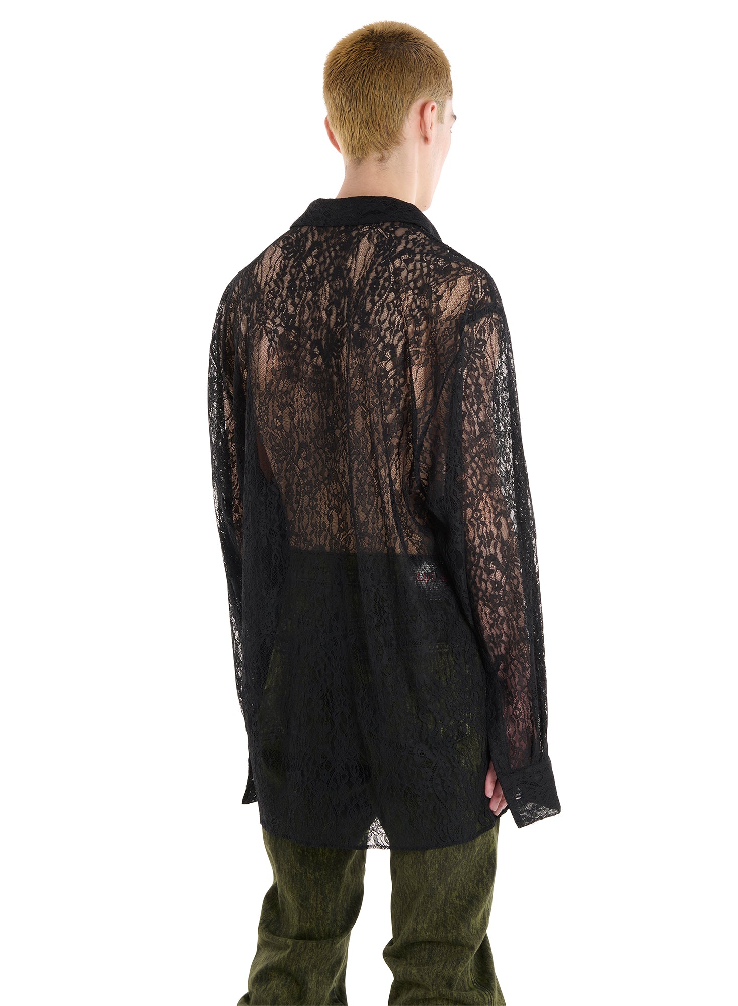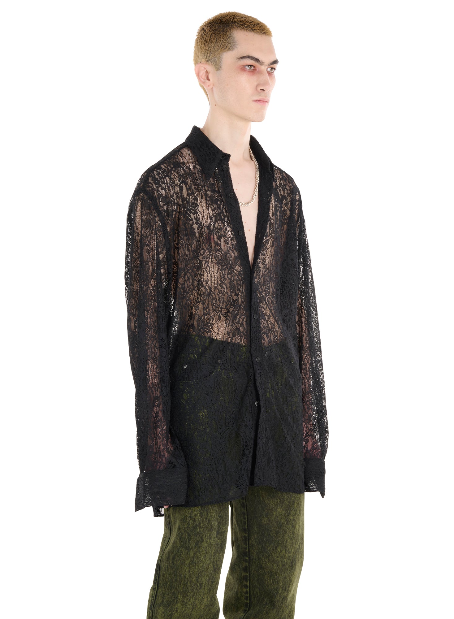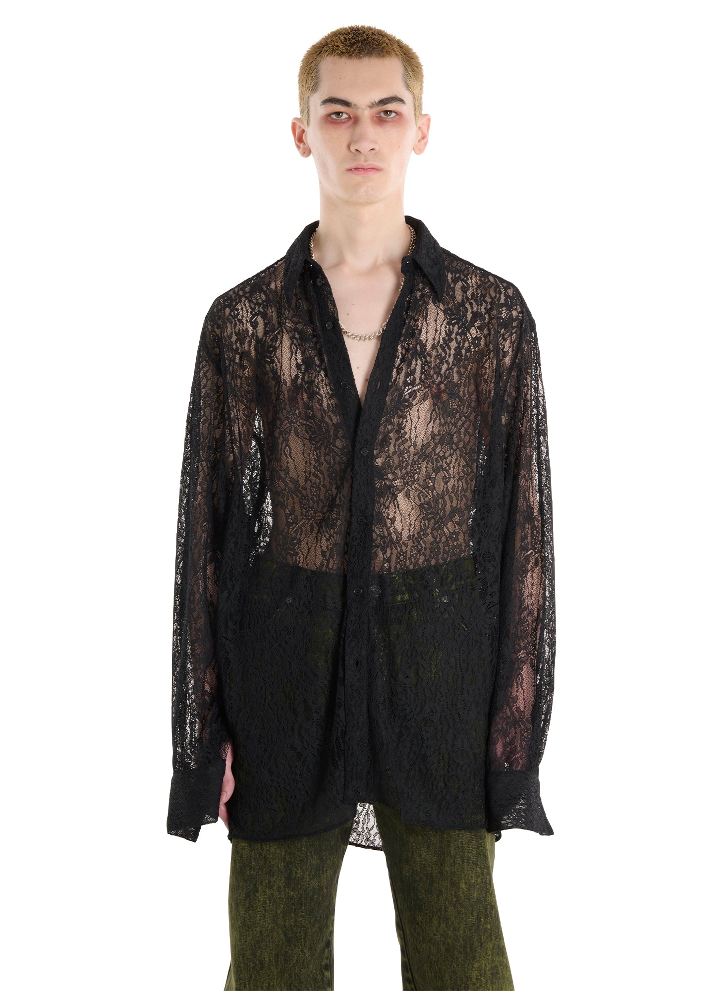 TAKING IT BACK TO THE 80'S TO FORM THE CLASSIC SHAPE OF OUR CLUB SHIRT, CUT IN A SHEER LACE THAT VEILS THE BODY JUST ENOUGH TO BE BOTH ELEGANT AND ALLURING. MODEL WEARS A SIZE M.