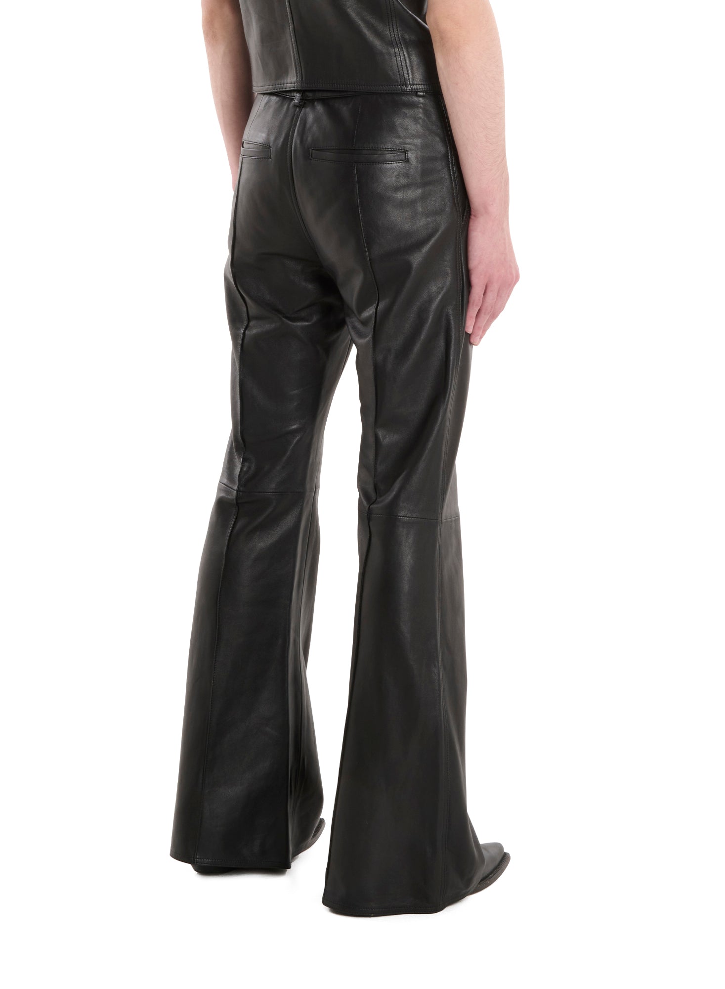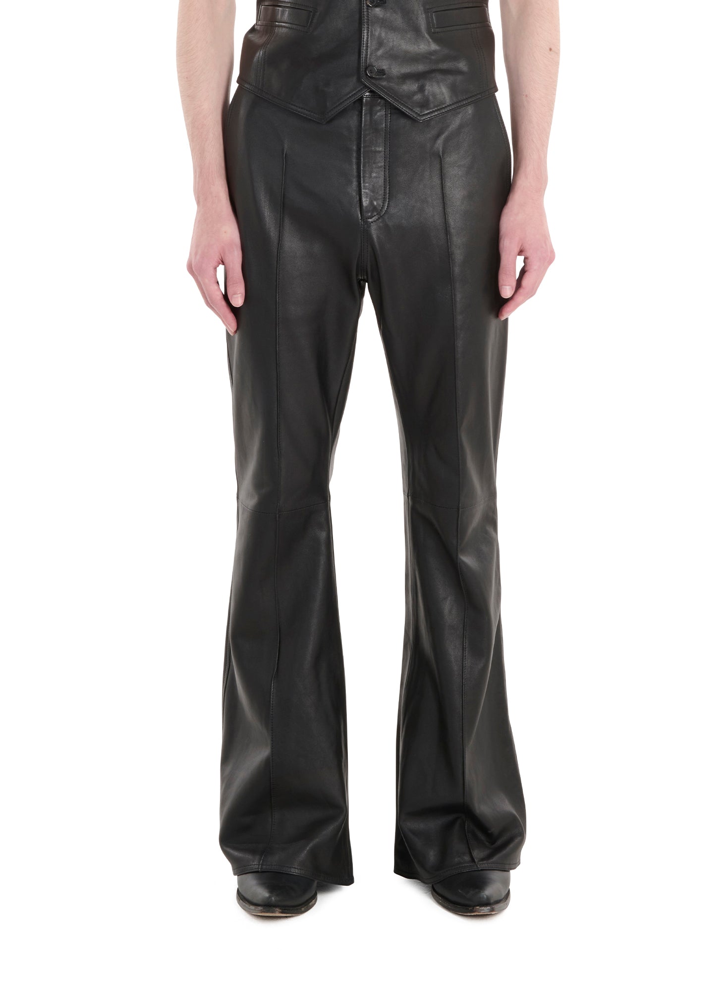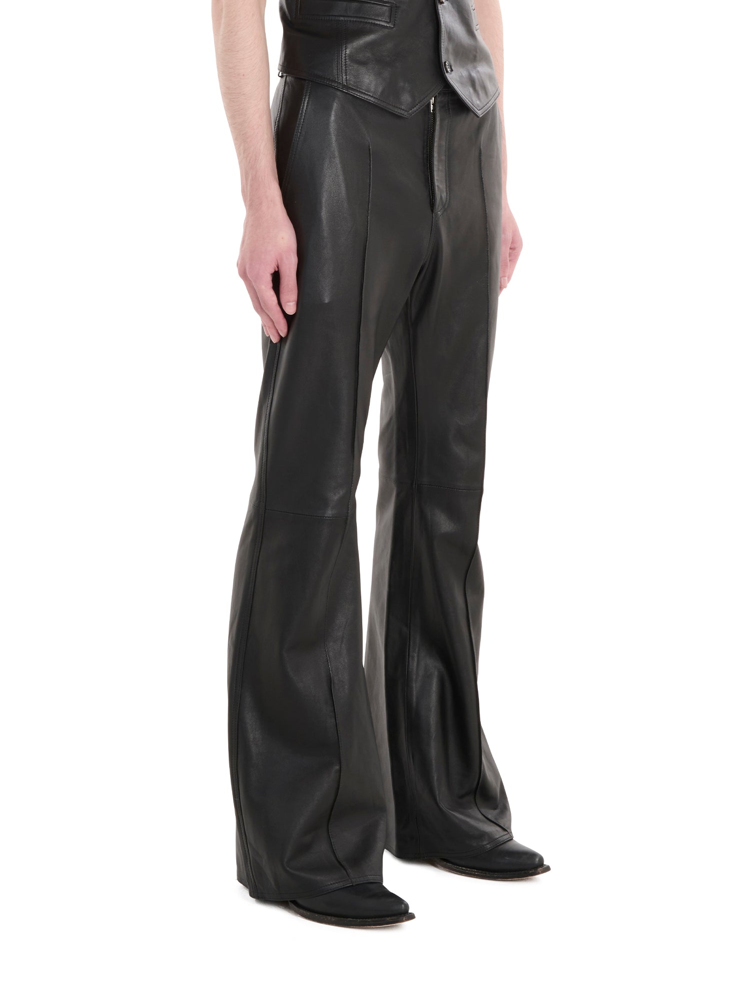 TIGHTLY FITTED AND CUT IN A SUPPLE NAPPA LEATHER, THESE TROUSERS FALL AWAY TO A BELL BOTTOM LEG IN A SILHOUETTE SEEN THROUGHOUT THE COLLECTION, SKETCHING OUT A GLIMPSE OF THE MYSTERY AND ALLURE OF THE LU'U DAN MAN. MODEL WEARS A SIZE 48.