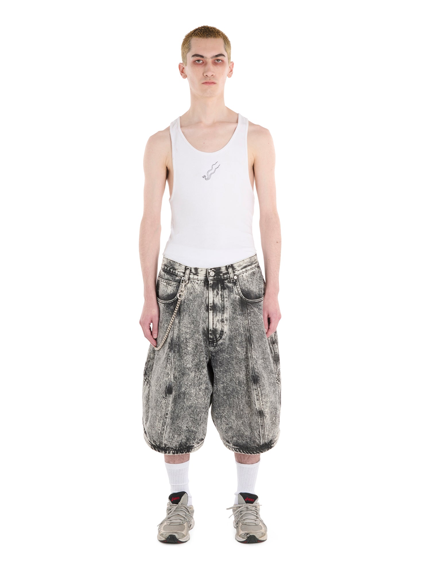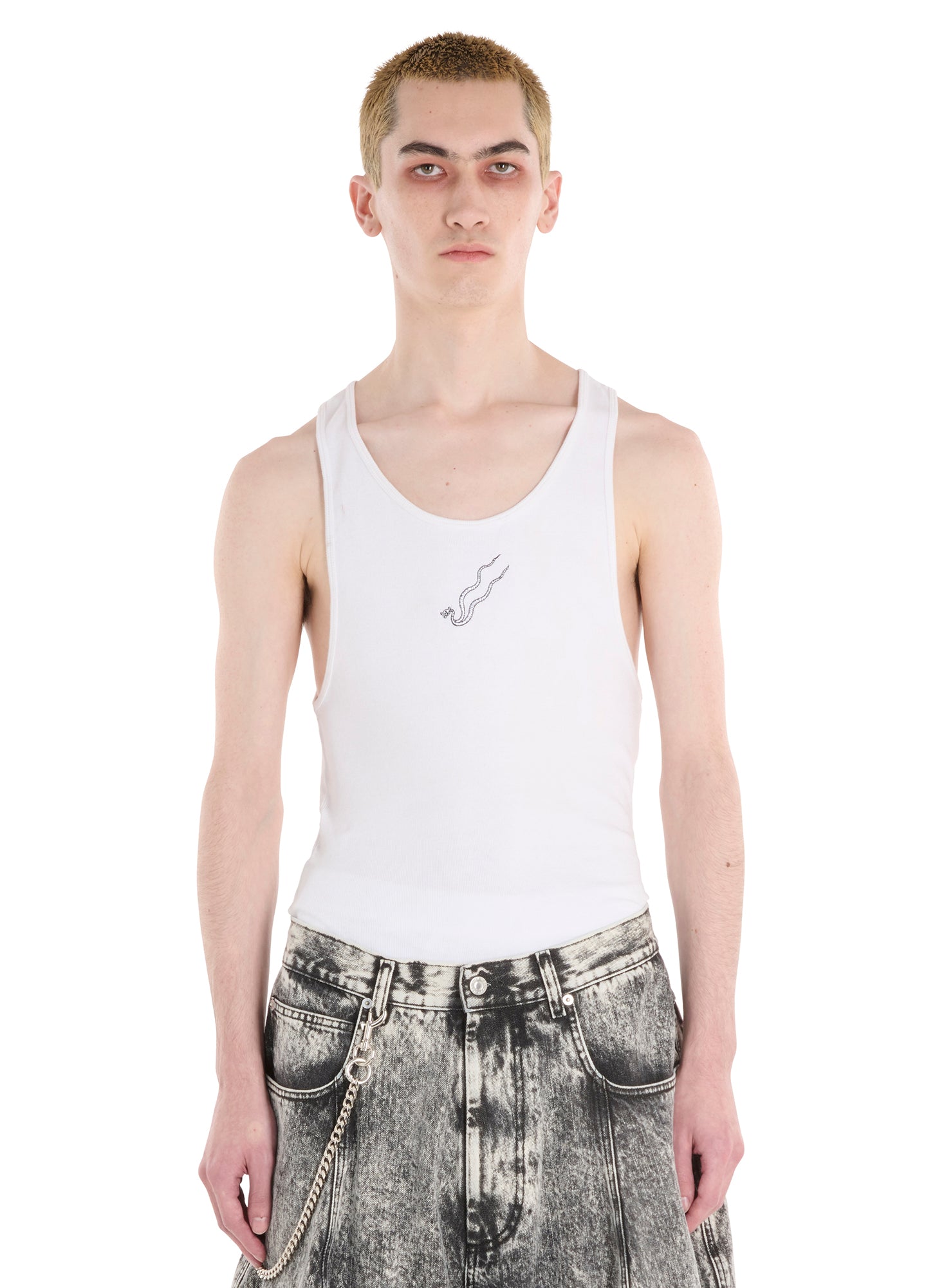 CUT IN LIGHTWEIGHT RIB COTTON JERSEY, THIS FITTED TANK IS A PERFECT BALANCE TO THE VOLUMINOUS JERSEY AND DENIM PIECES IN THE COLLECTION. FINISHED WITH AN EMBROIDERY OF THE BRAND'S LOGO, THE DOUBLE BODIED SNAKE. MODEL WEARS A SIZE M.