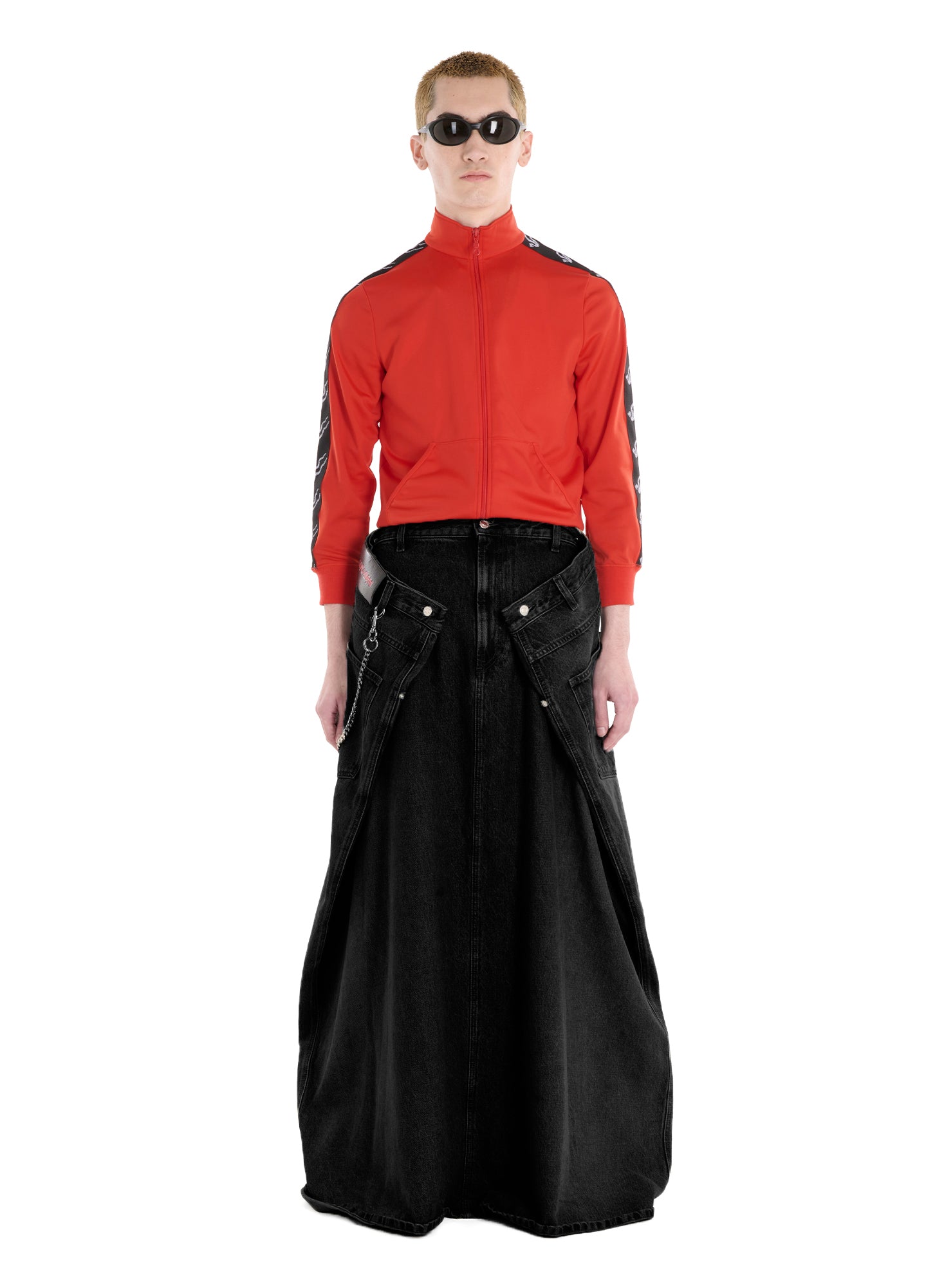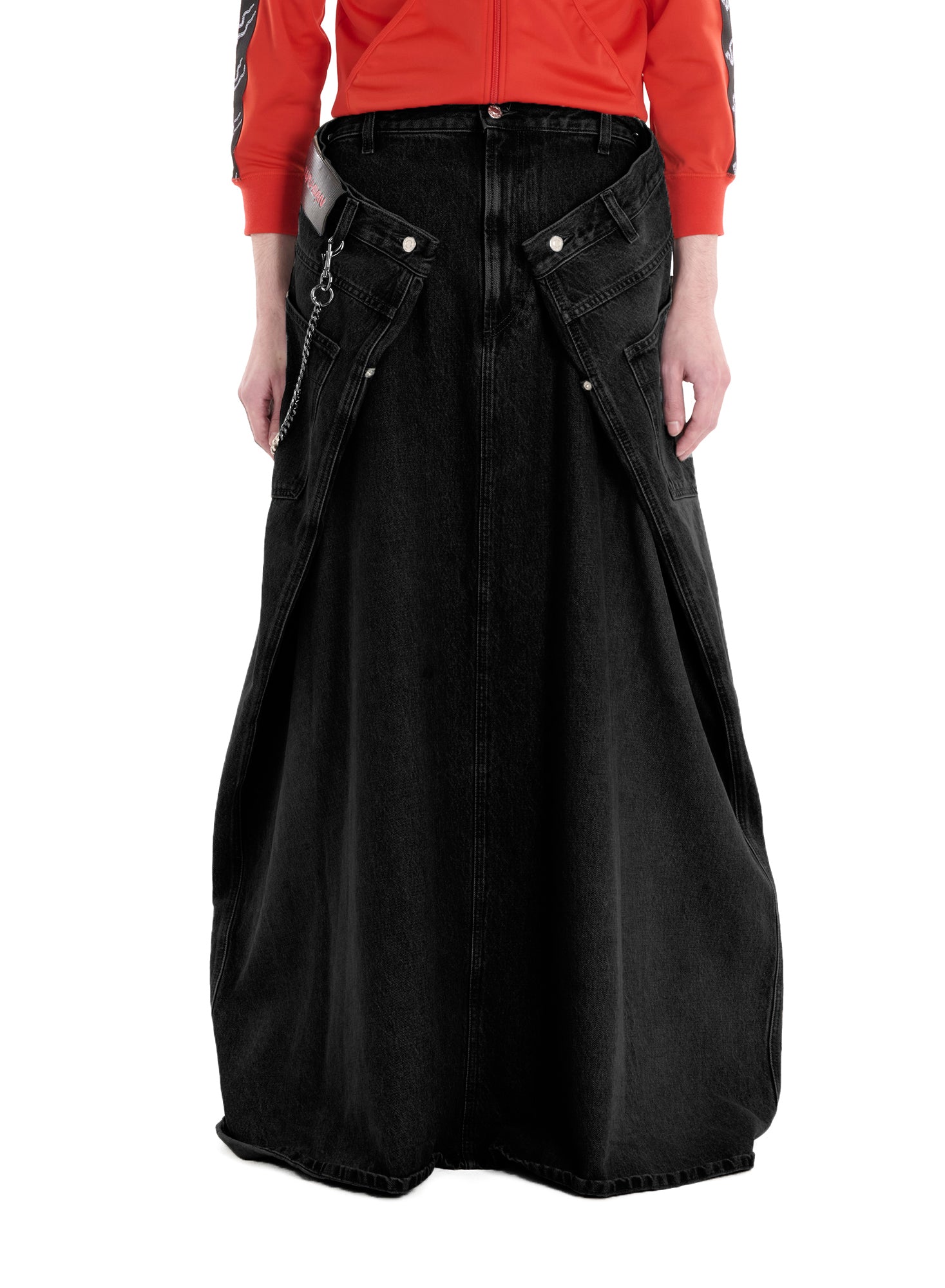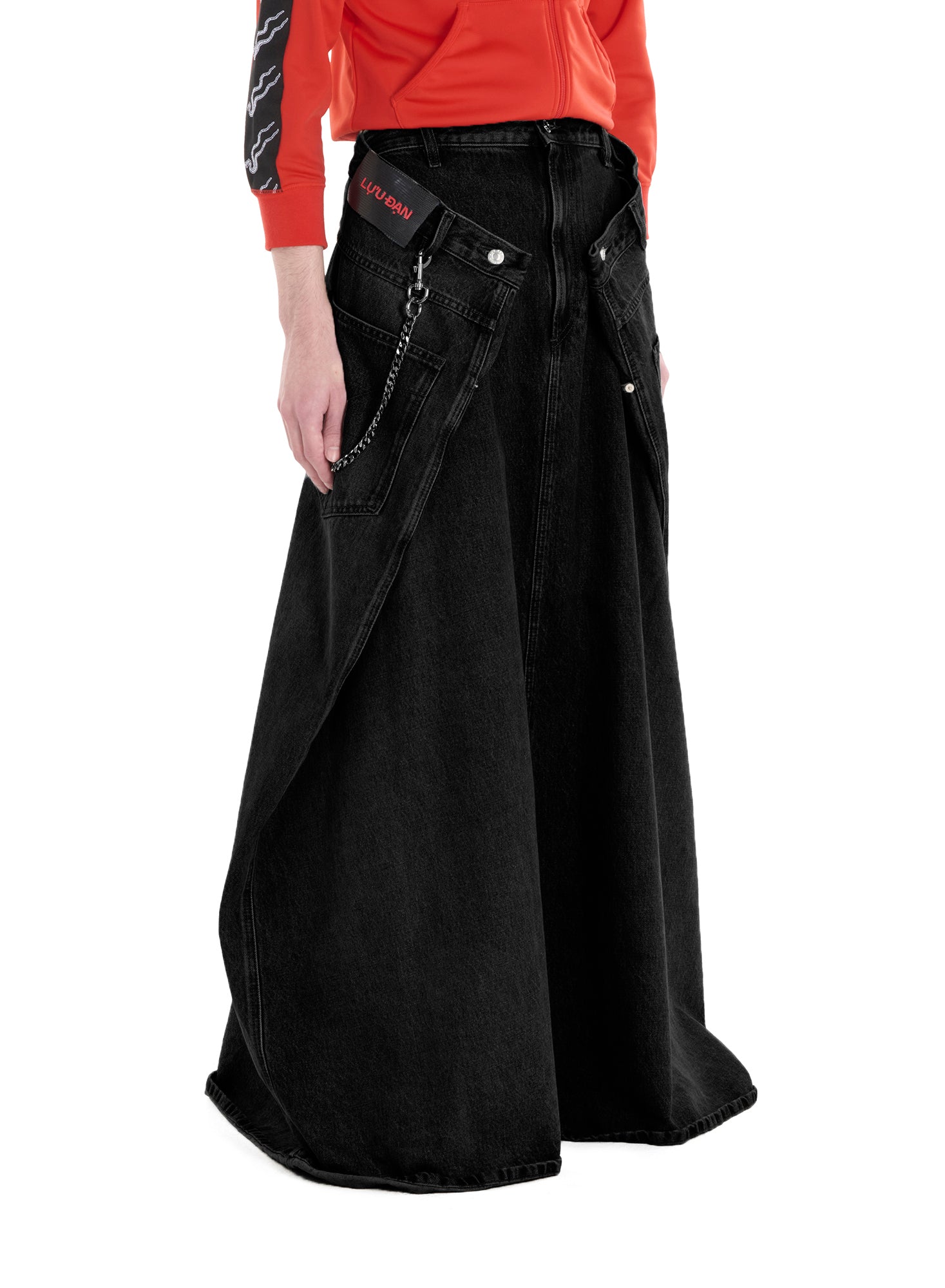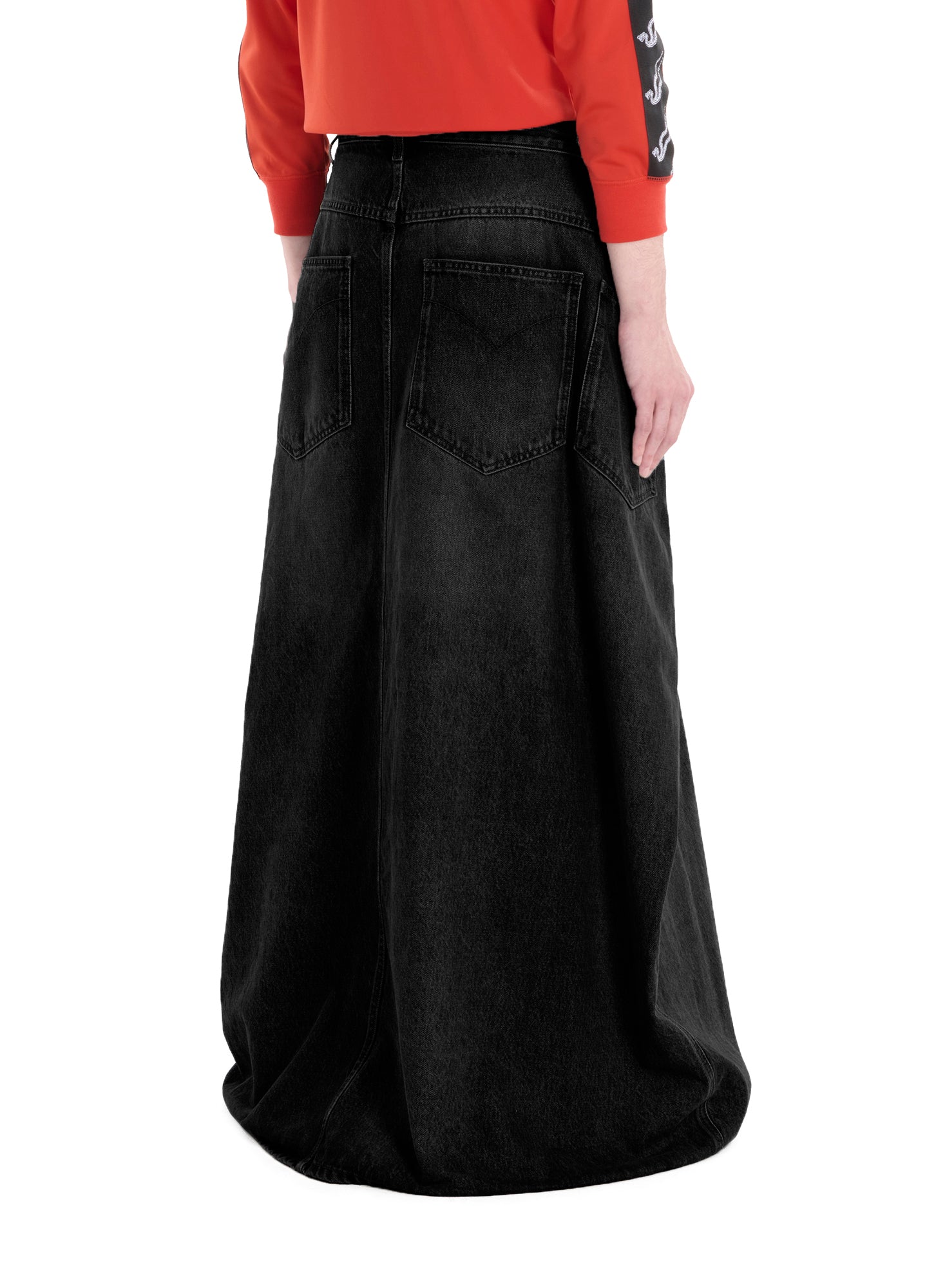 LỰU ĐẠN'S ICONIC 'MAXI X MAXI X MAXI DENIM' REIMAGINED, CUT FROM A RINSE BLACK DENIM, THIS SKIRT SWEEPS OMINOUSLY AT THE FEET FOR A DRAMATIC, OVERSIZED LOOK. STYLE IT SIMPLY WITH A CLASSIC TANK, OR DRESS IT FOR DANGER WITH A BLAZER - THE SKIRT IS THE PERFECT STATEMENT FOR ANY LOOK. MODEL WEARS A SIZE M.