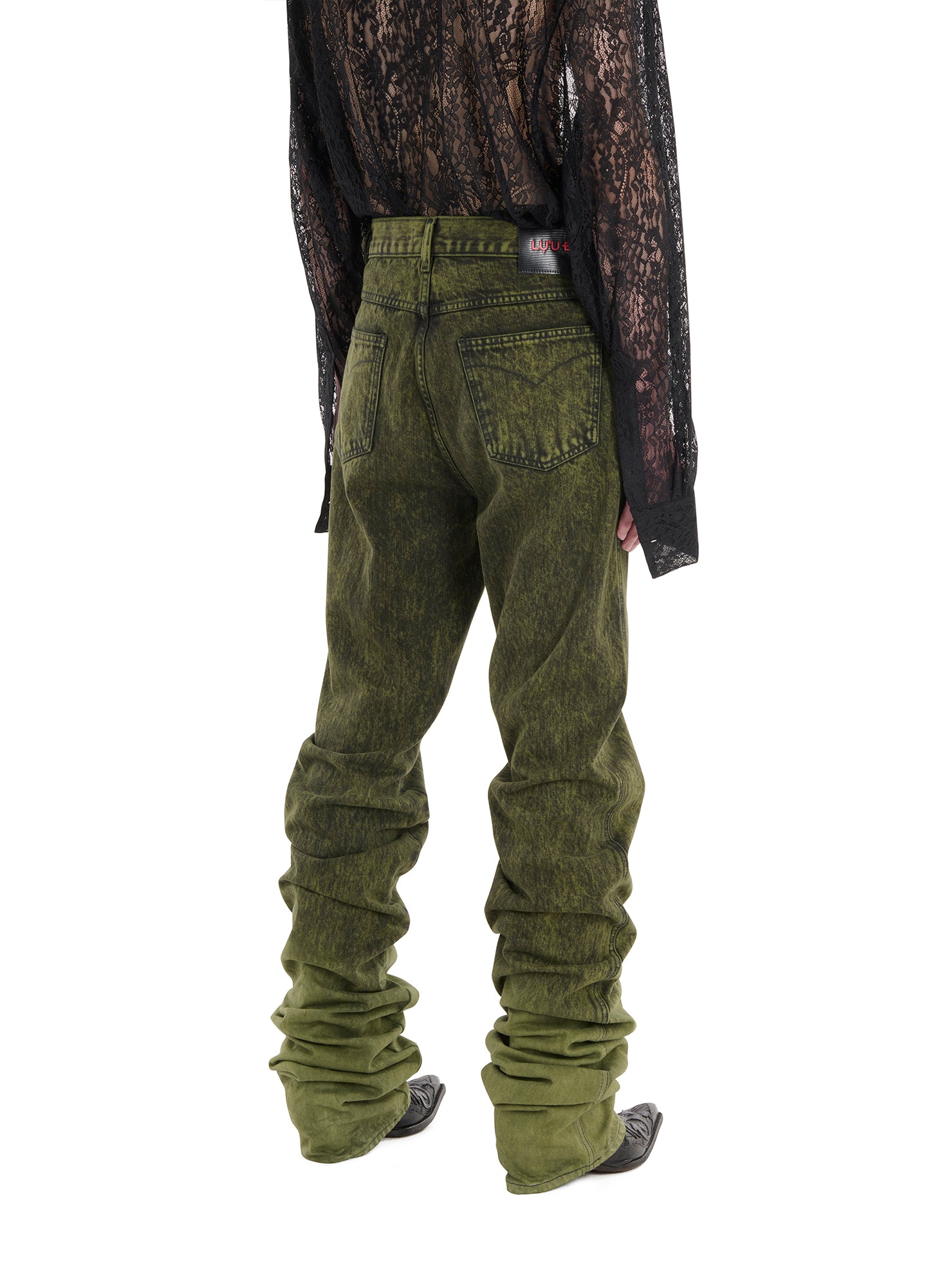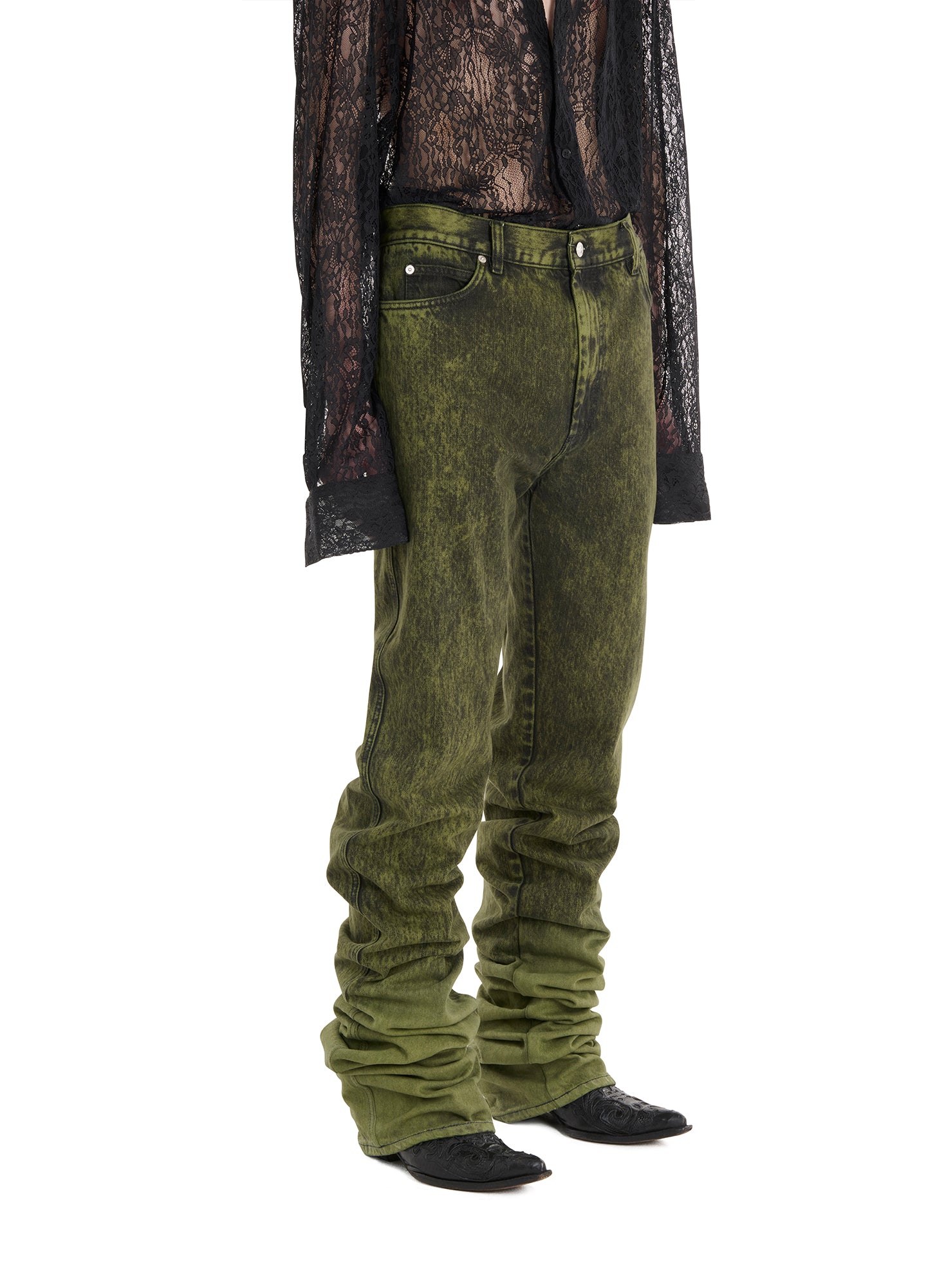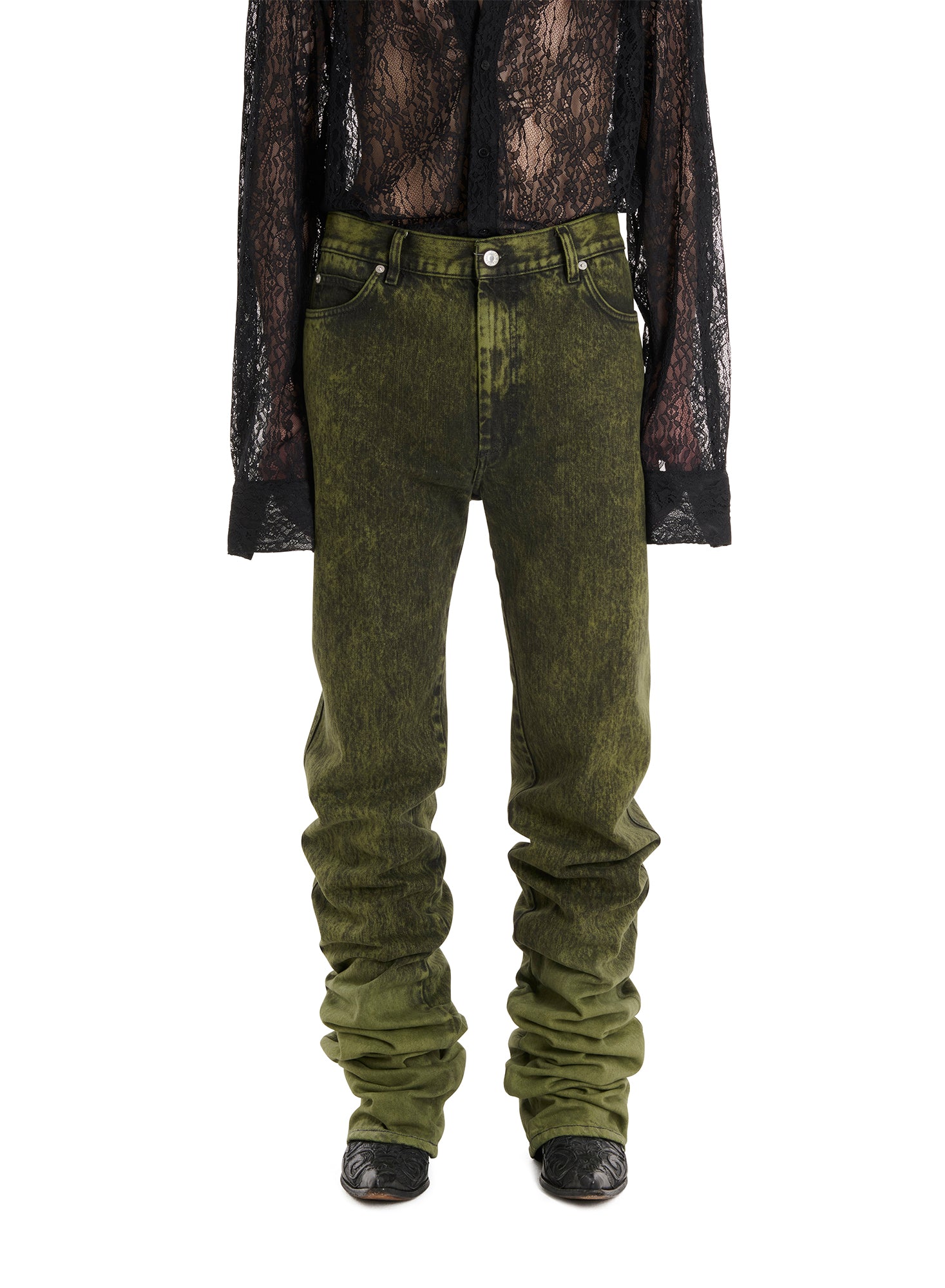 THESE JEANS ARE A RUGGED HOMAGE TO THE ICONIC STYLE OF WESTERN WRANGLERS ALONGSIDE THE REBELLIOUS ESSENCE OF PUNK SPIRIT. PILING AT THE SHIN, THEY PROVIDE FOR A UNIQUE SHAPE THAT WILL NOT GO UNNOTICED. MODEL WEARS A SIZE 32.