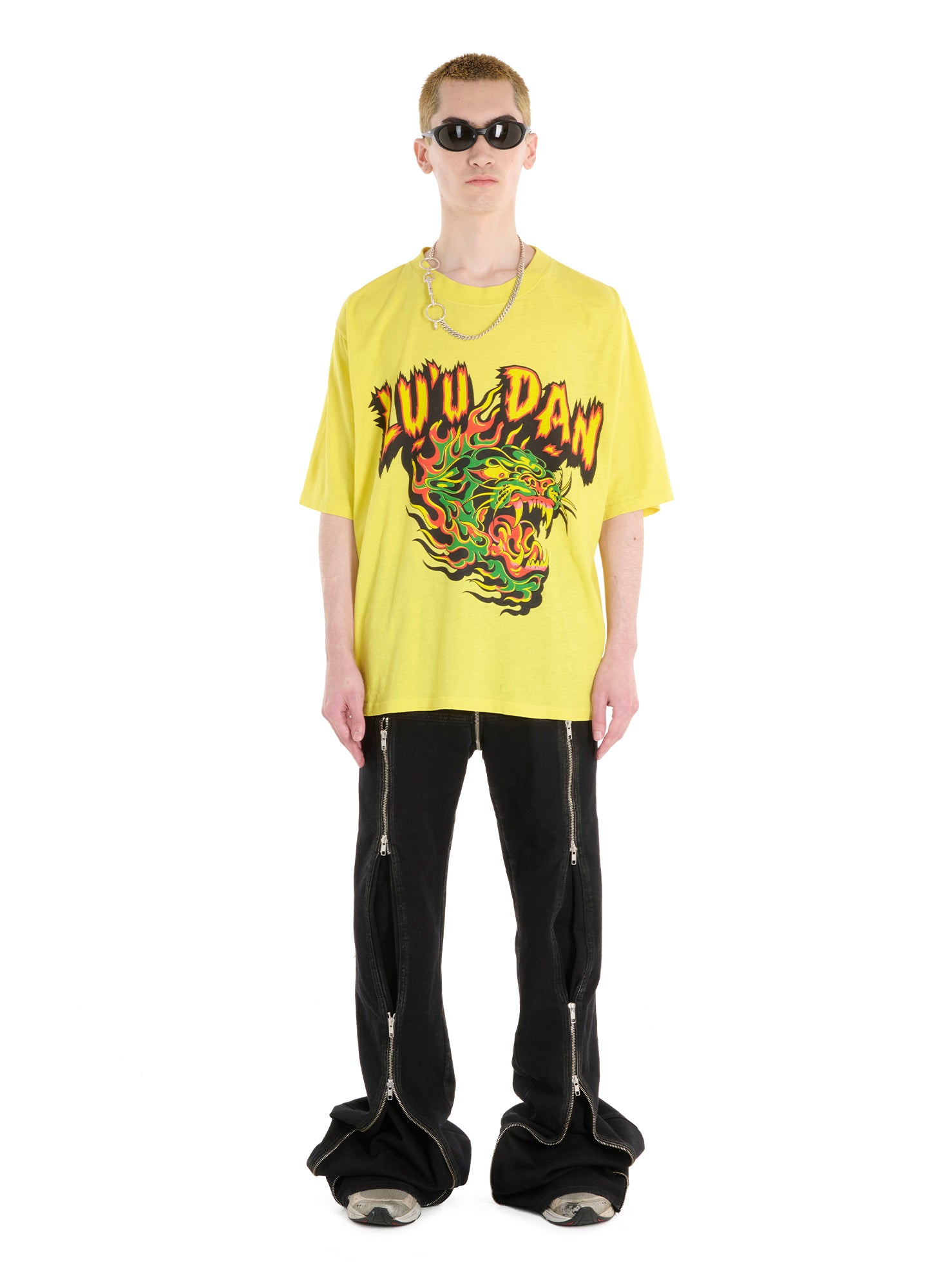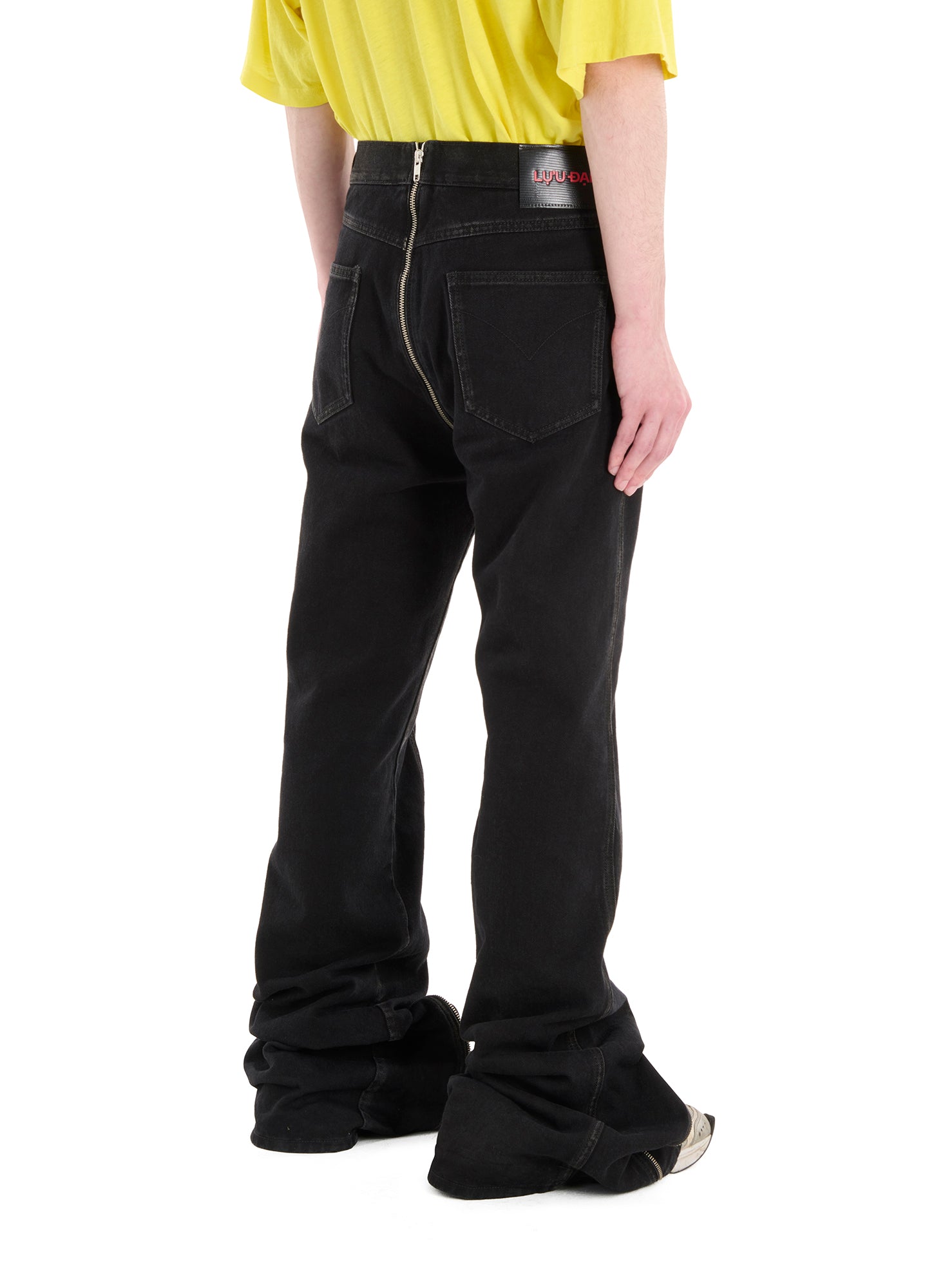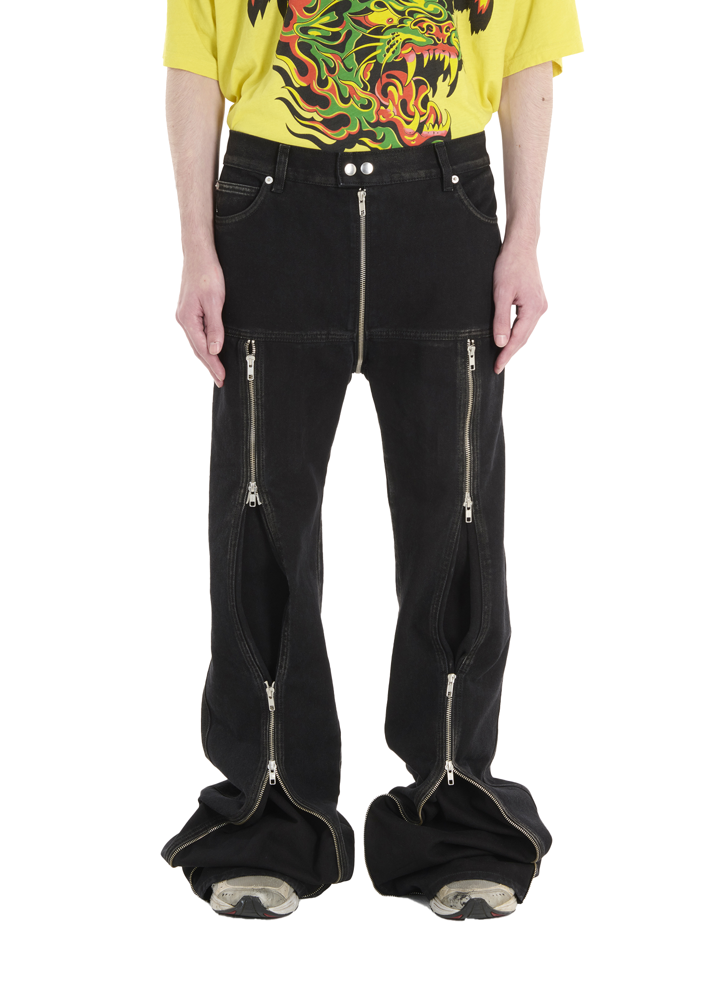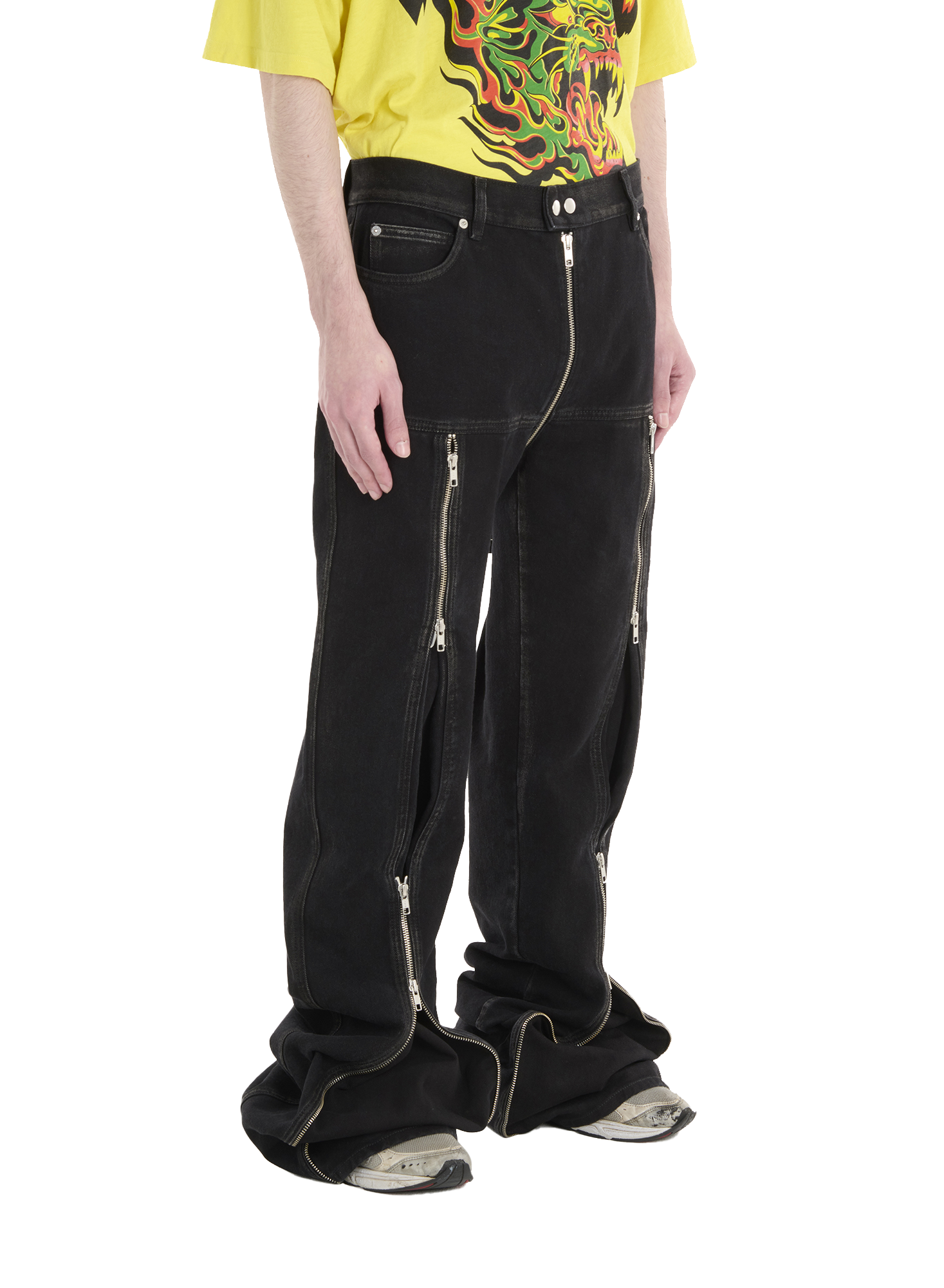 THESE PANTS ARE NEVER BOUNDED BY ANY RULES, THEY REBEL AGAINST THE CONVENTIONAL AND MUTATE TO THE LIKES OF THE WEARER. CUT FROM A RINSED BLACK DENIM, DETAILED WITH METALLIC CUES THROUGH VARIOUS ZIPS AND DETAILINGS THEY WERE DESIGNED TO EXPRESS THE ATTITUDE OF PUNK. THEY FURTHER THE ESSENCE OF INDIVIDUALITY AND SYMBOLISE DEFIANCE. MODEL WEARS A SIZE 32.