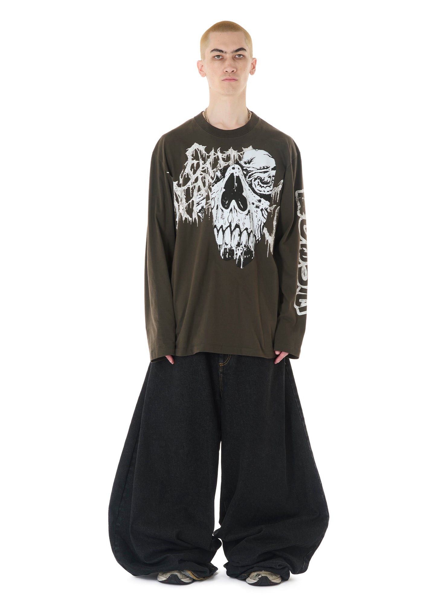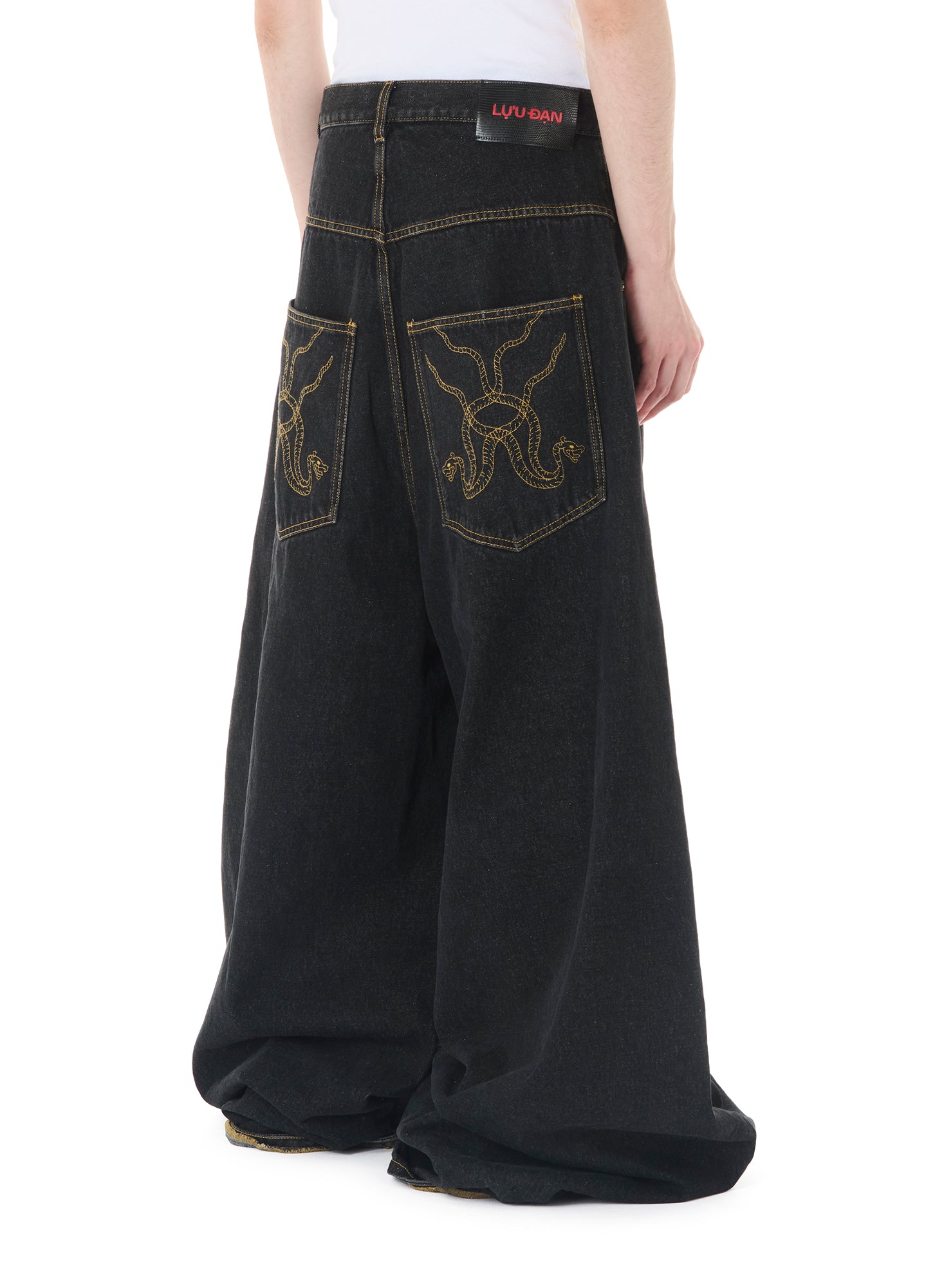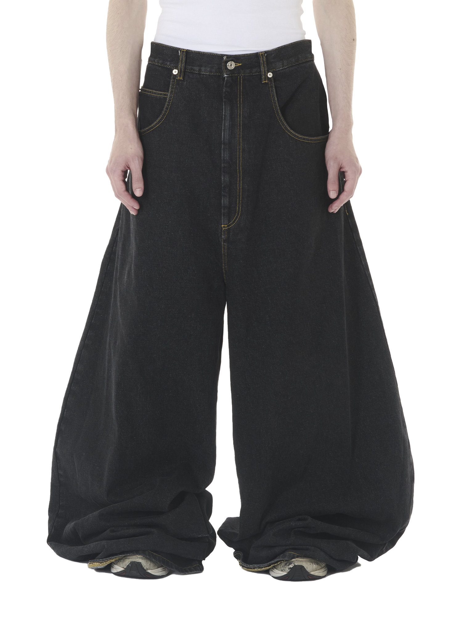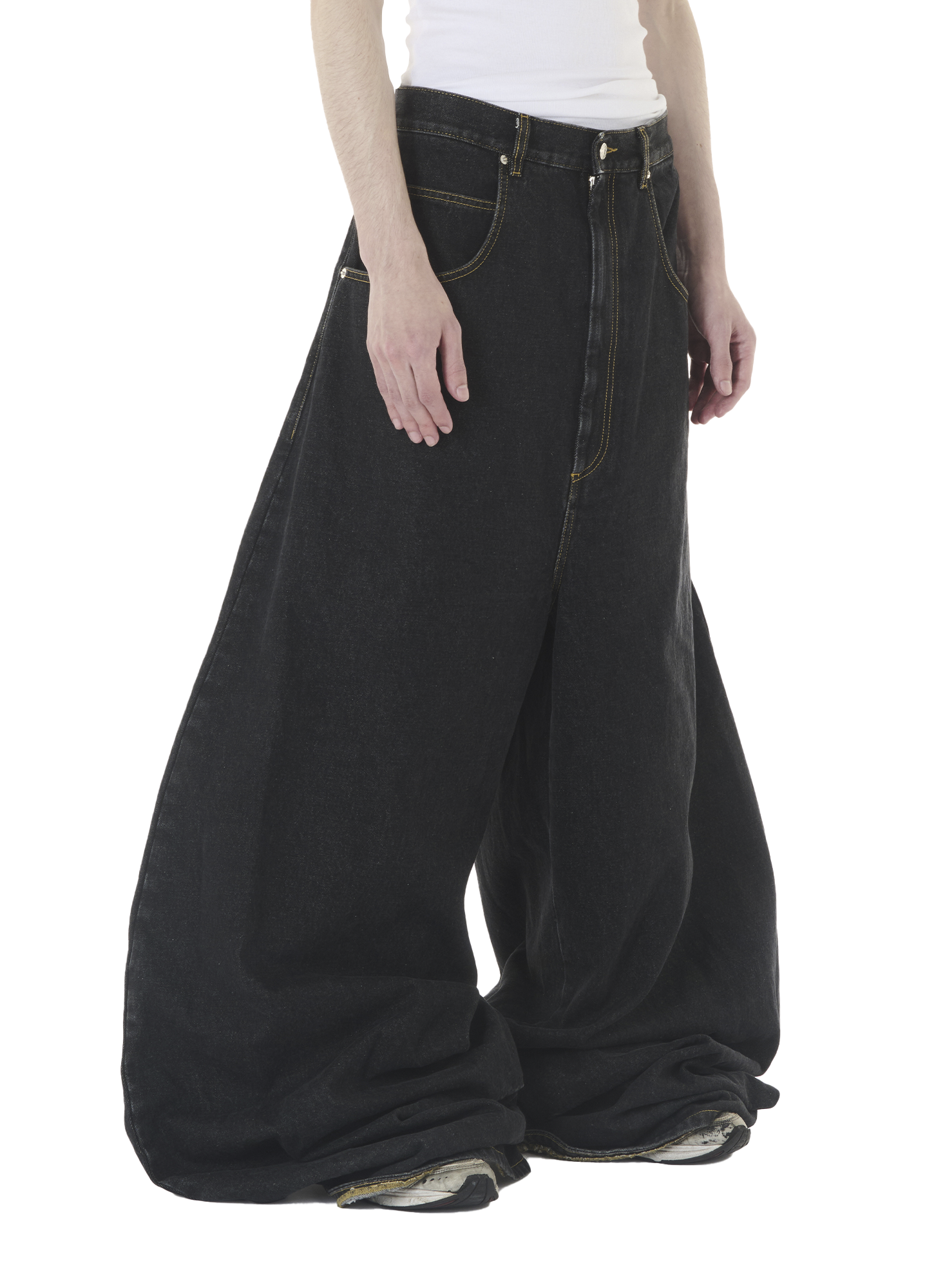 A SLICE OF THE 90S HIP-HOP SCENE, THE ‘DOUBLE XL JEANS’ EMANATE BOLDNESS THROUGH THEIR EXAGGERATED VOLUME AND OVERSIZED FIT. CUT FROM A RINSE BLACK DENIM, THE SUBTLE WASH MAKES FOR A ‘LIVED IN’ LOOK. WE LOVE SEEING THESE PAIRED SIMPLY WITH A TANK OR DRESSED UP WITH A BLAZER, THEY ARE THE PANTS FOR ANY OCCASION. MODEL WEARS A SIZE 32.