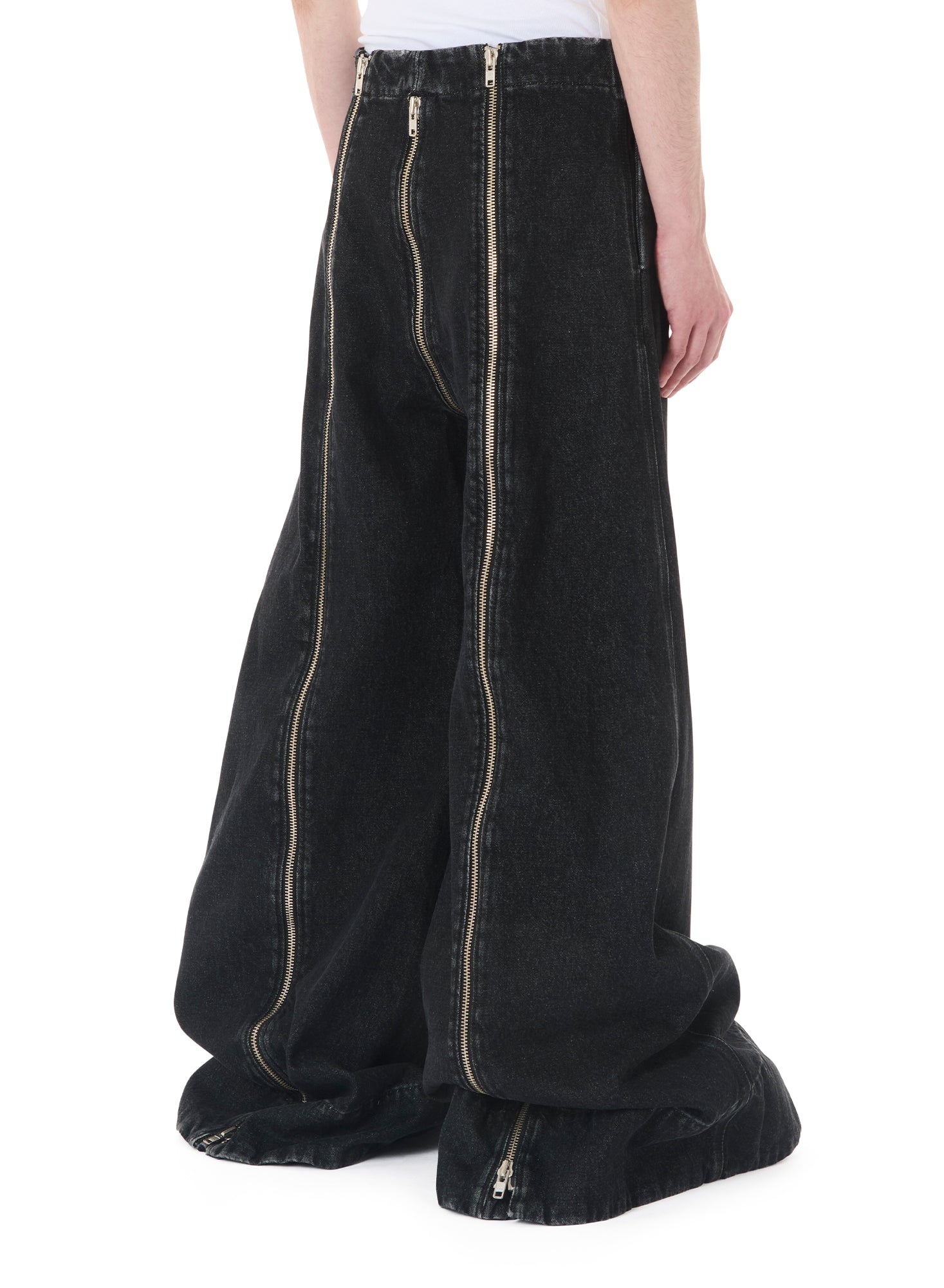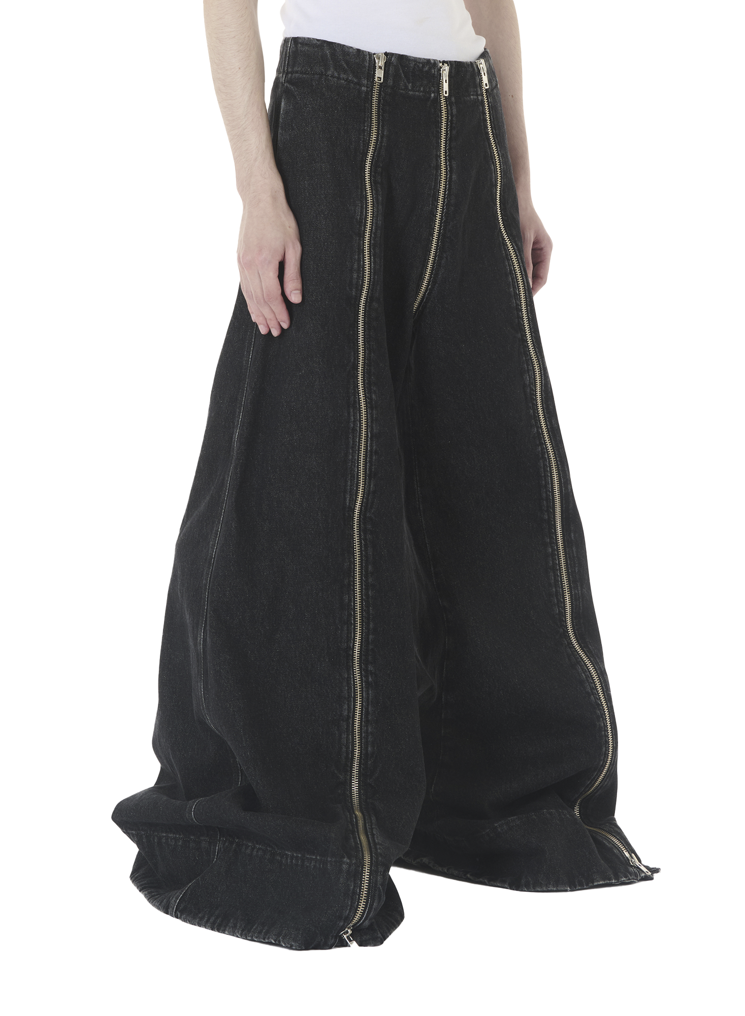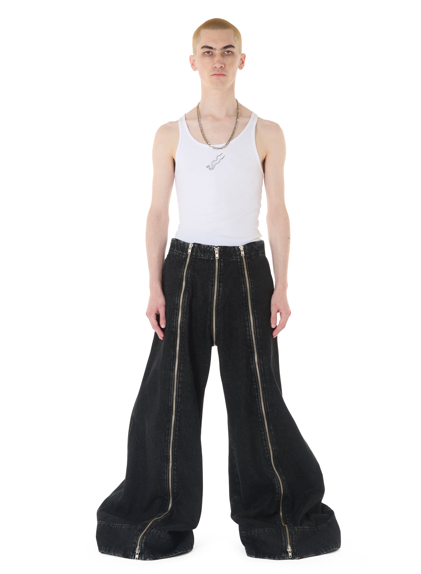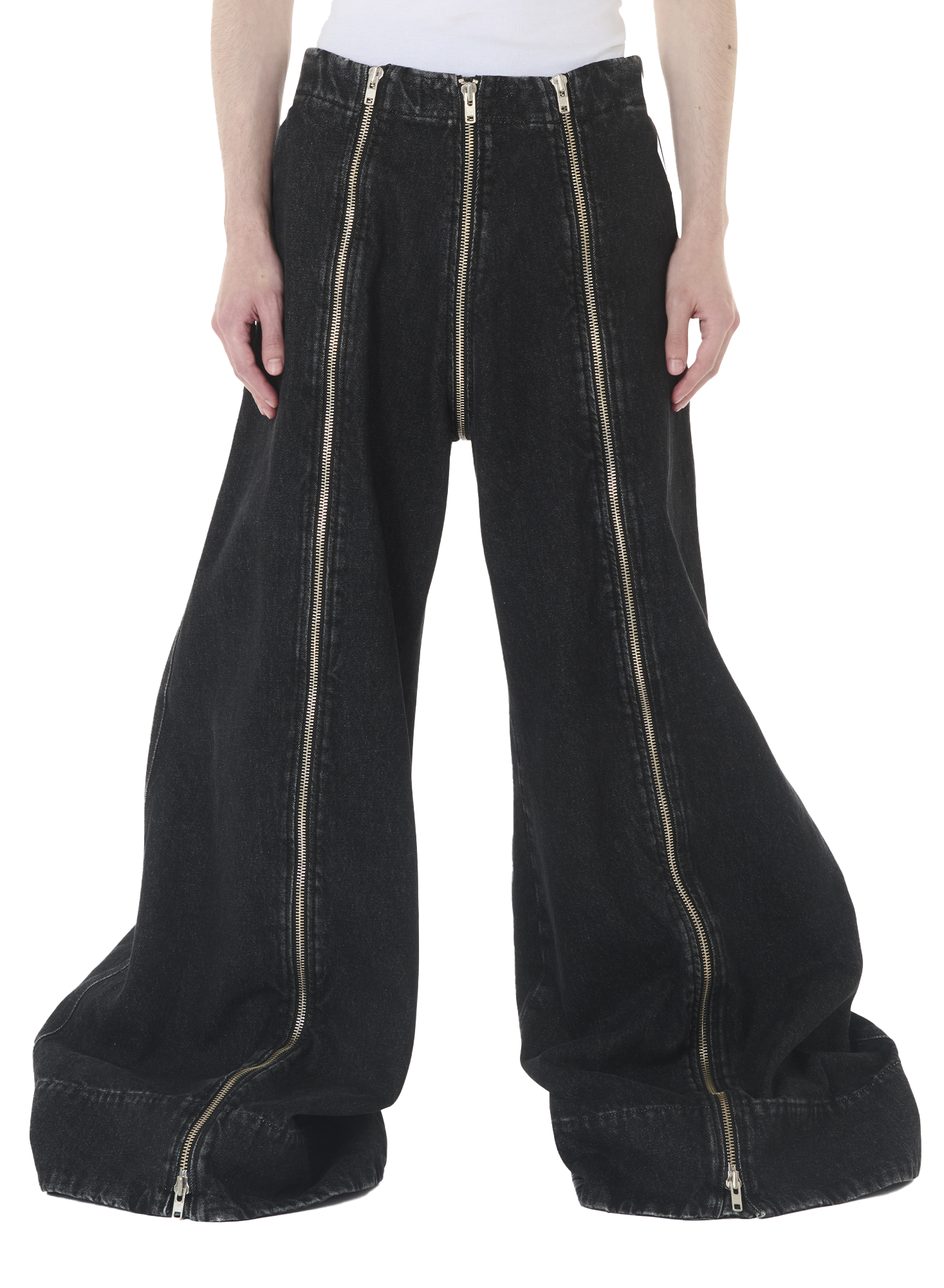SPORTING AN UNAPOLOGETIC VOLUME, THESE WIDE LEG TROUSERS POOL SUBTLY AT THE FOOT FOR ADDITIONAL DRAMA. FEATURING 5 FULLY FUNCTIONAL ZIPS, THEY REFERENCE METALHEAD ENERGY THROUGHOUT THE DESIGN. CRAFTED FROM A WASHED HEAVY DENIM, THE FLIGHT PANTS ACT AS A CENTRE PIECE TO ANY OUTFIT. MODEL WEARS A SAMPLE SIZE 32.