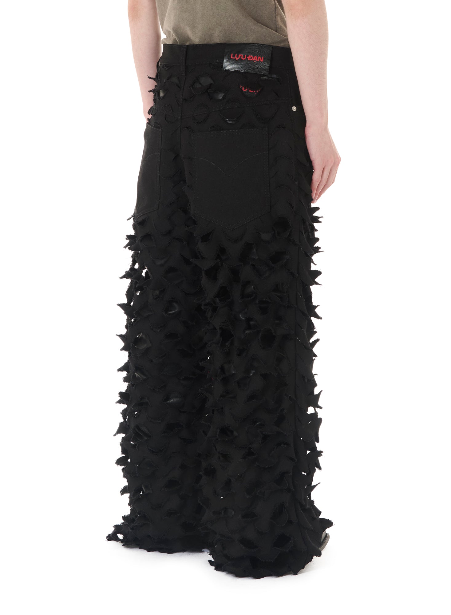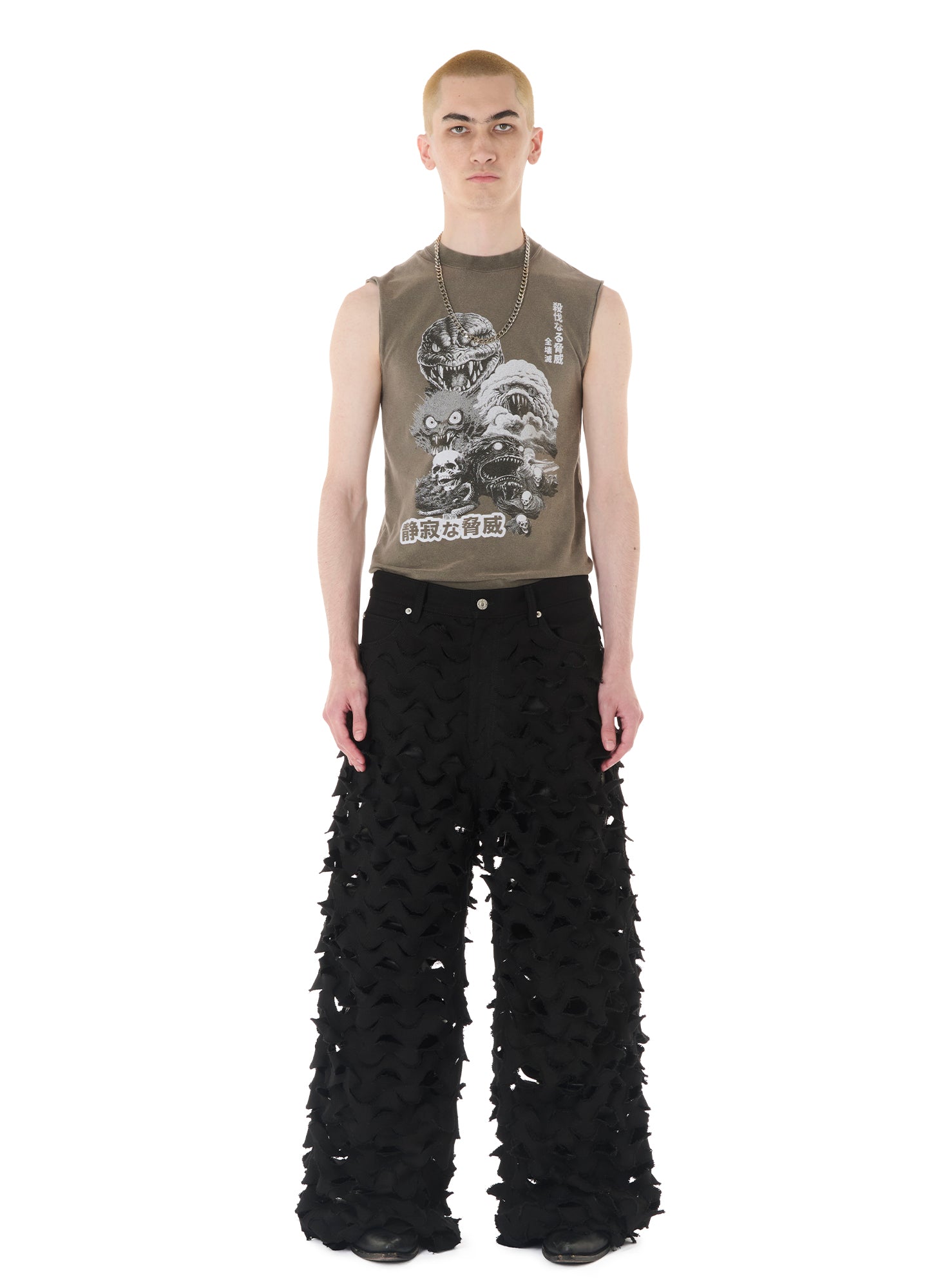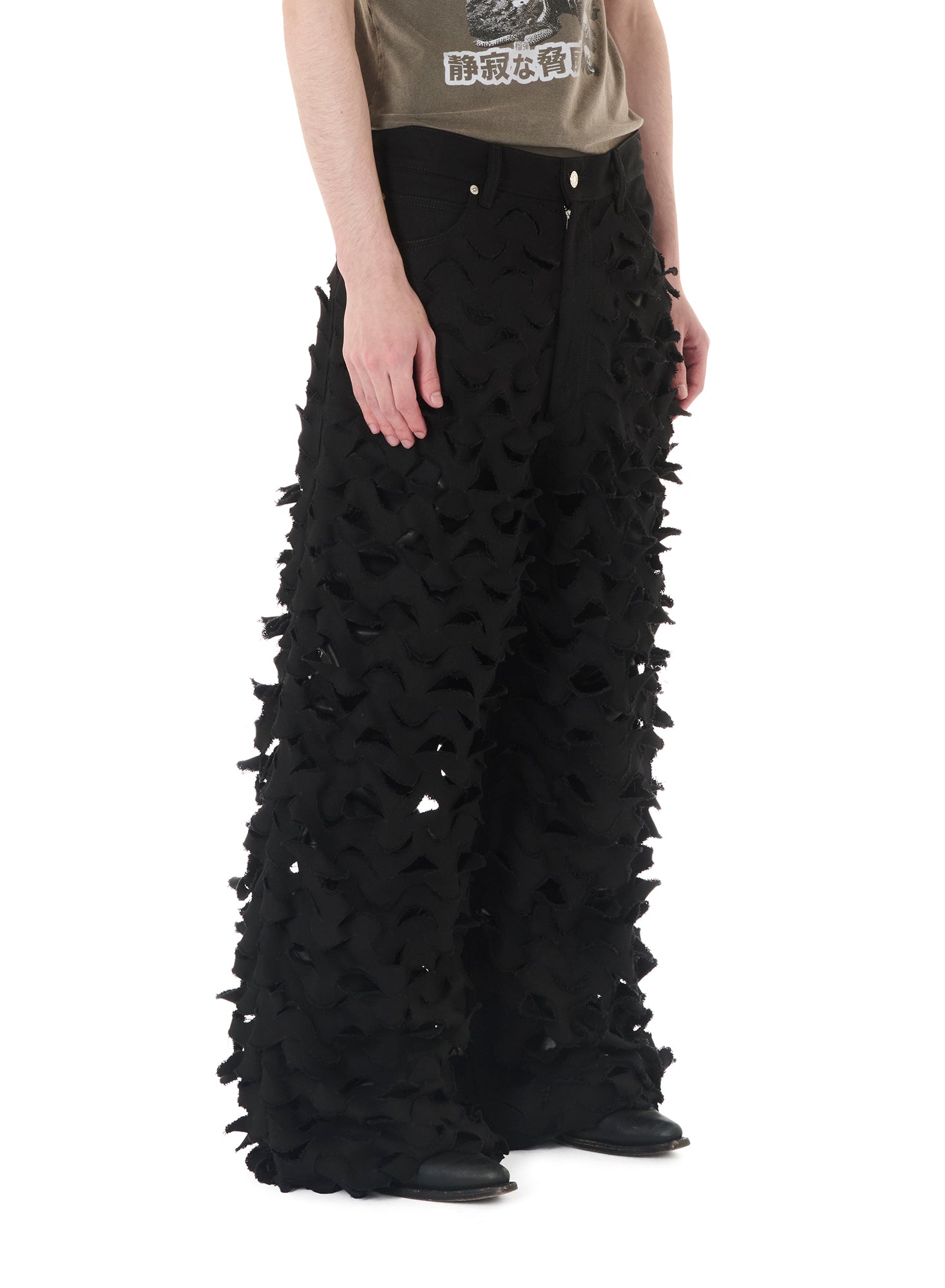 FOLLOWING THE LANGUAGE OF URBAN PUNK, THESE LASER CUT JEANS ARE INTENDED TO FRAY AS WORN. THE DESIGN DRAWS DEEP INSPIRATION FROM THE RAW ASPECT WITHIN THE HEDONISTIC LIFESTYLE, RADIATING A SENSE OF UNBRIDLED FREEDOM AND CARE-FREE ATTITUDE. MODEL WEARS A SIZE 32.