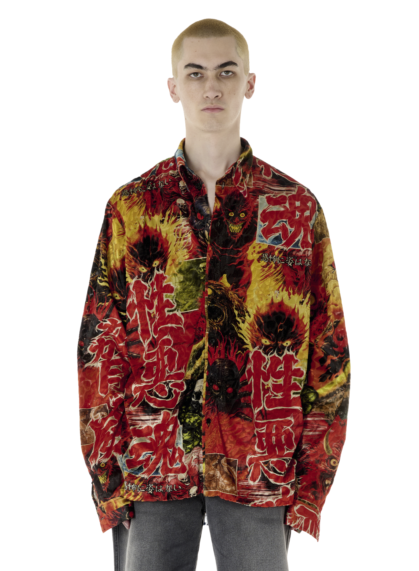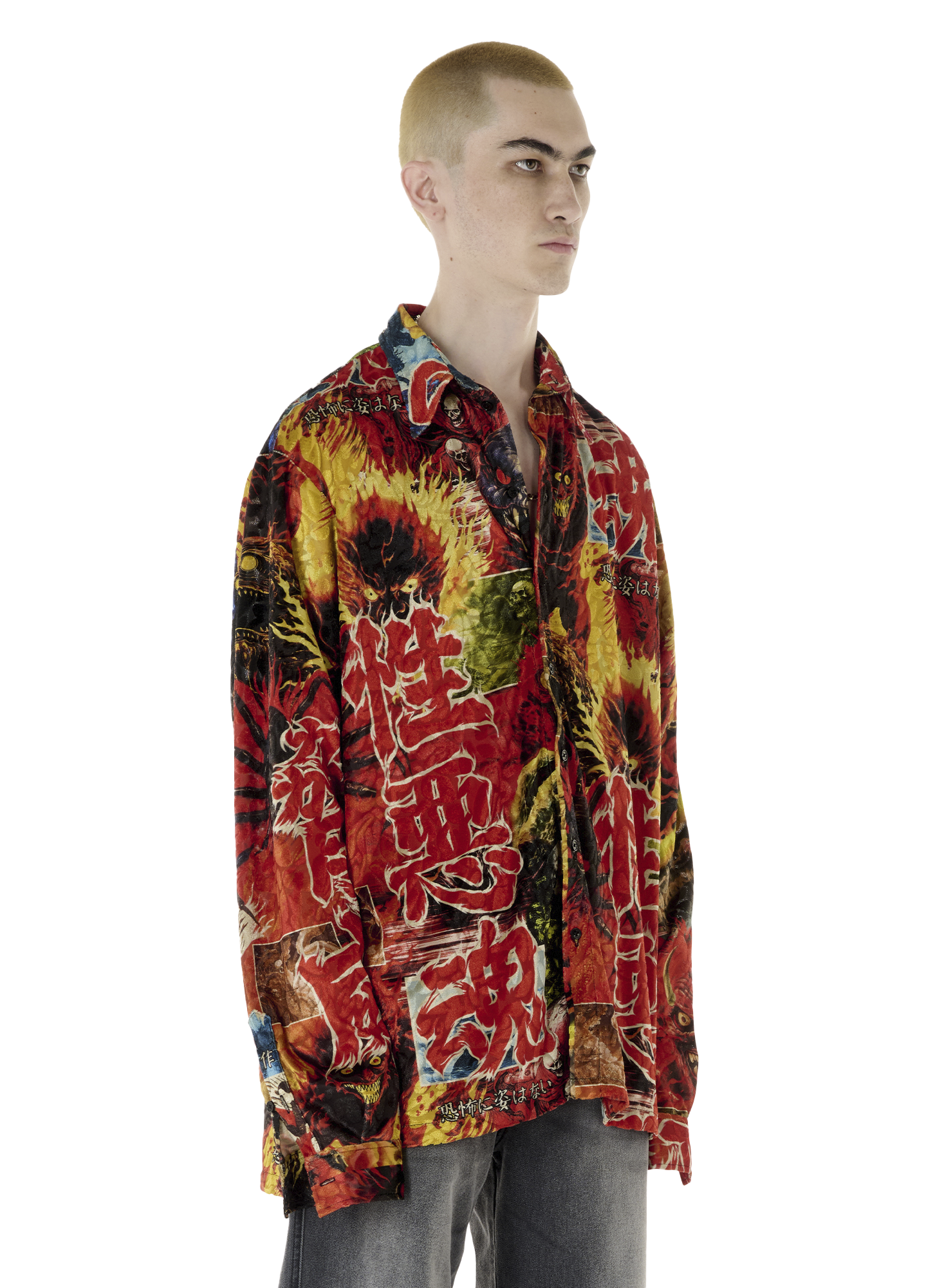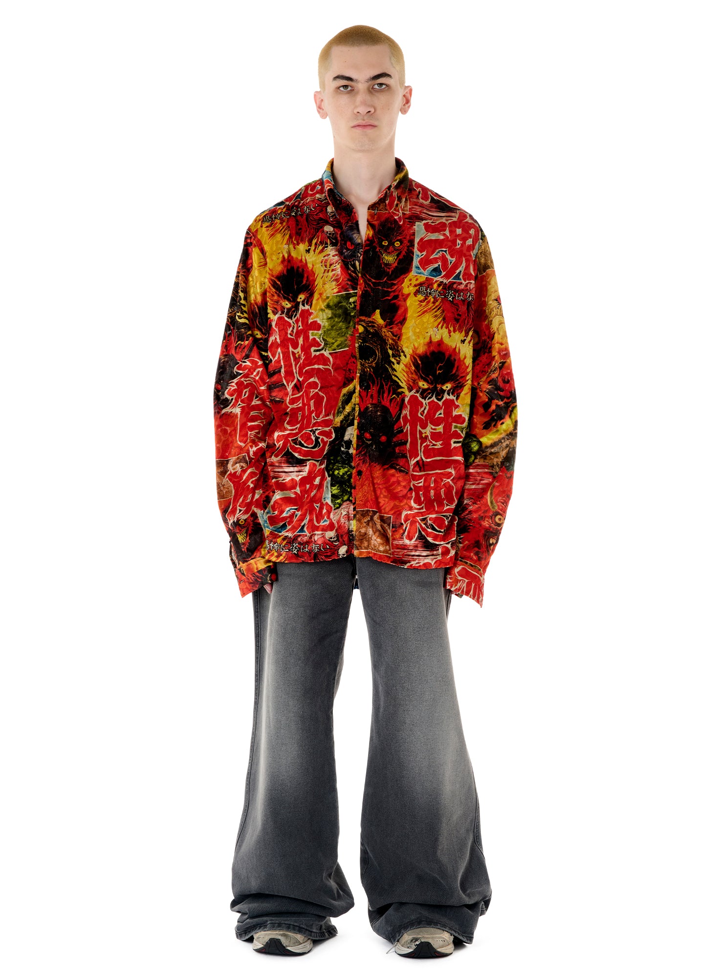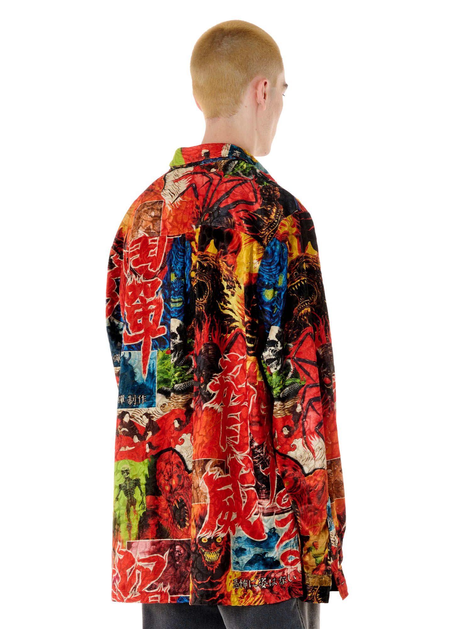 WITH HEAVY REFERENCE TO ASIAN GORE FILMS, THIS DEVORÉ LONG SLEEVE IS THE PERFECT CONTENDER FOR A SLEAZY POOL NIGHT. MODEL WEARS A SIZE M.