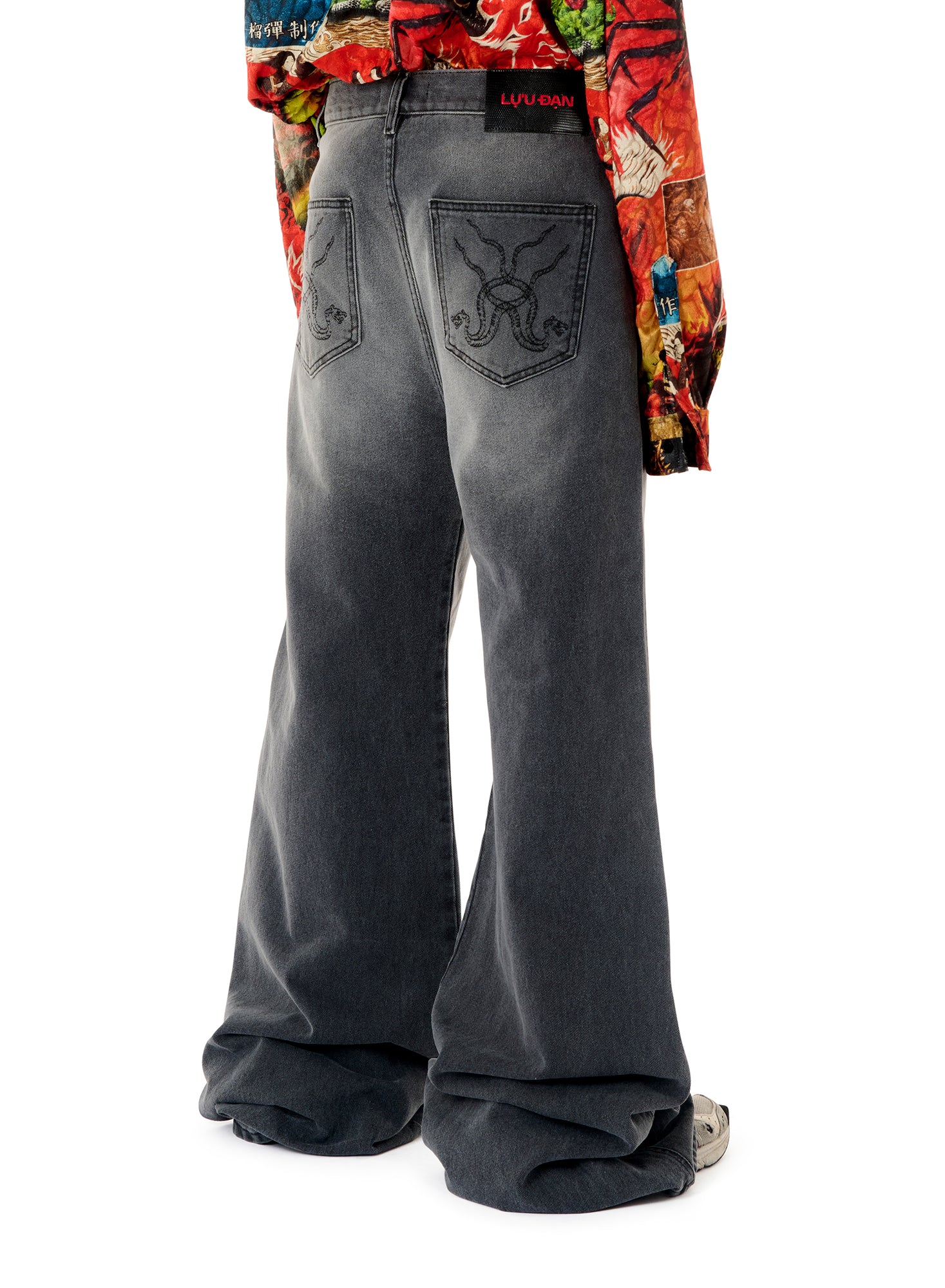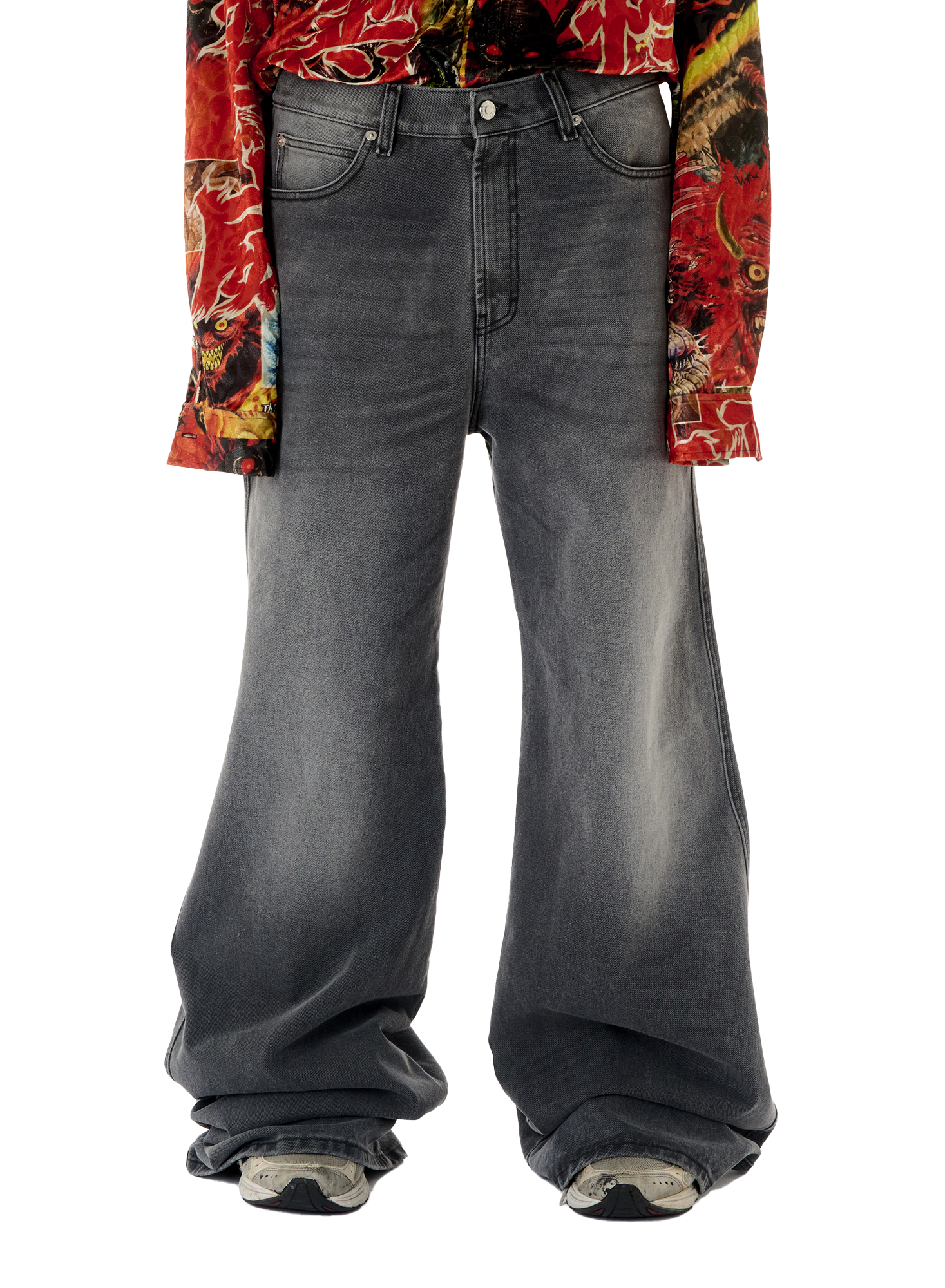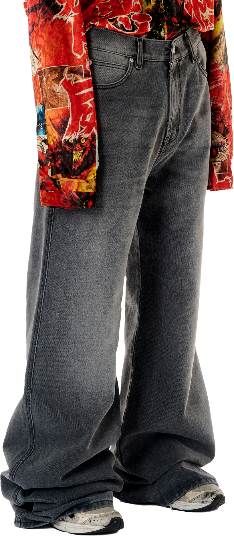 CUT FROM A WASHED GREY DENIM, THESE JEANS ARE CUT IN A BELLBOTTOM SILHOUETTE HEAVILY REFERENCED IN PAST COLLECTIONS. WE PAIR THESE WITH JERSEY AND SHIRTING FOR A ‘OUTLAW’ INSPIRED LOOK. MODEL WEARS A SIZE 32.