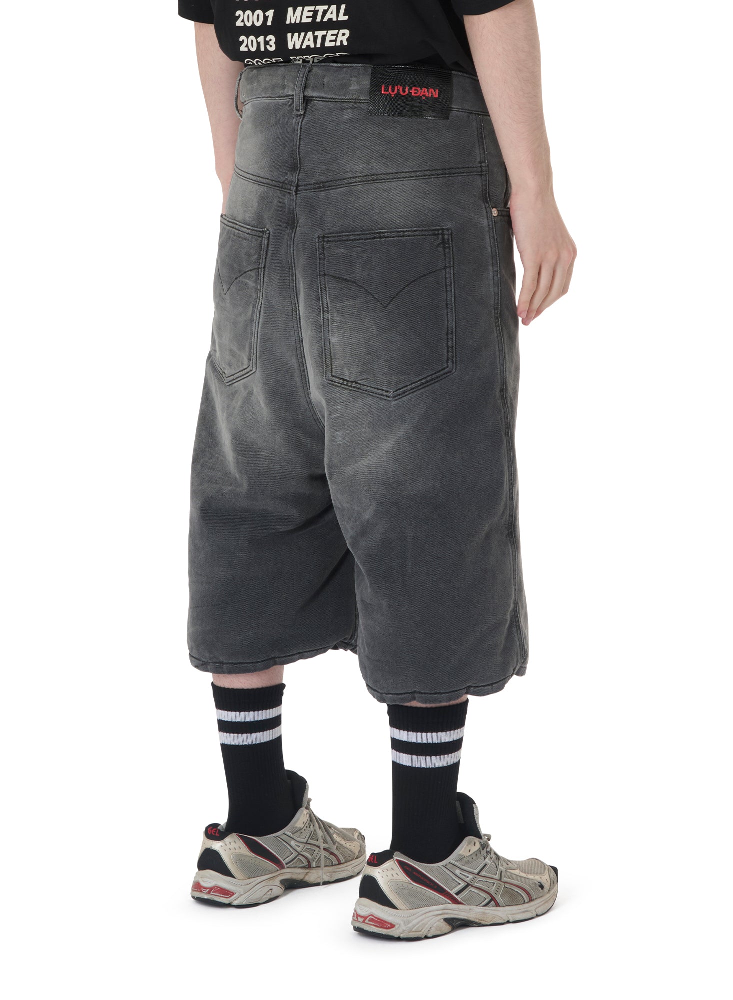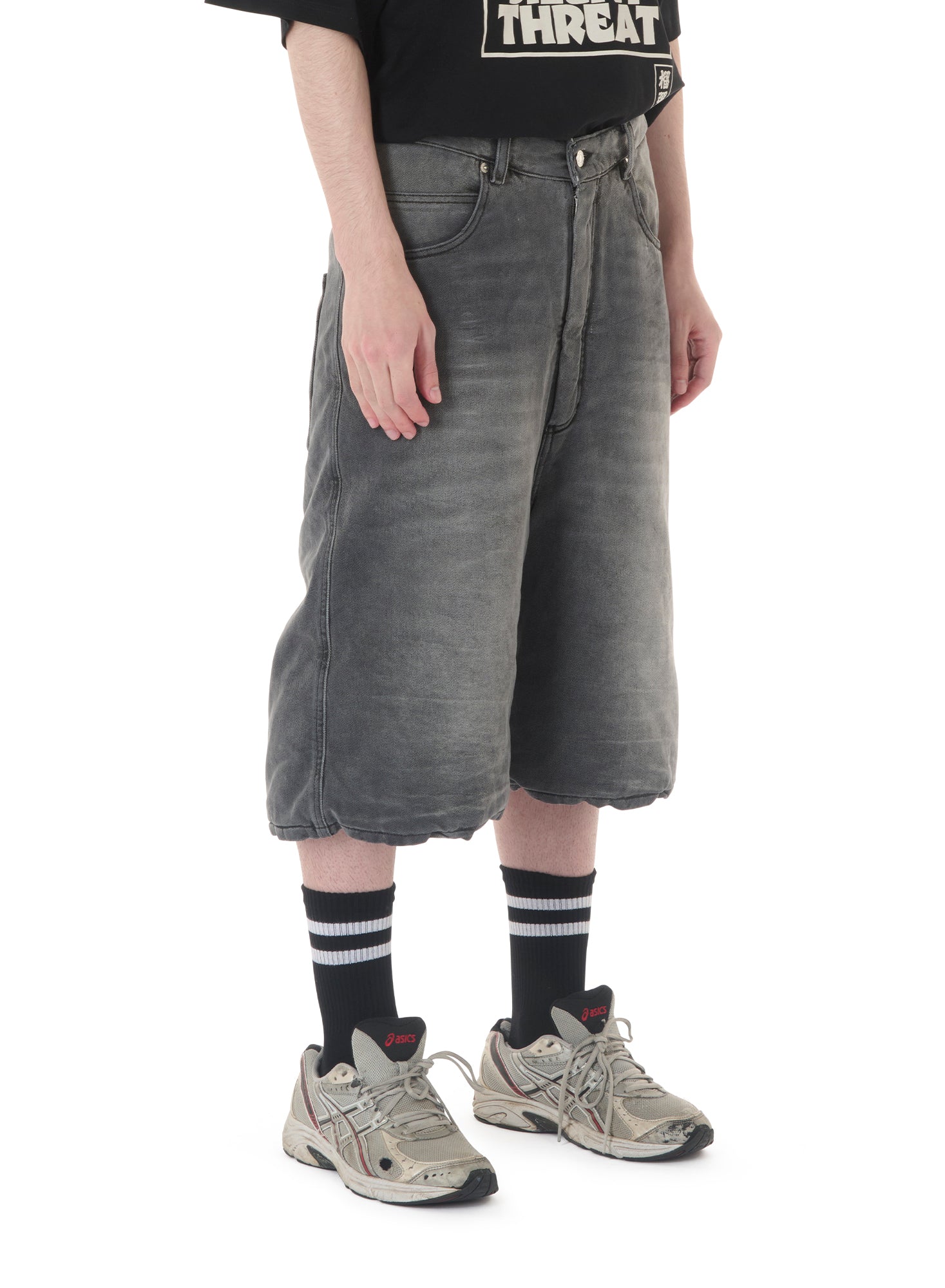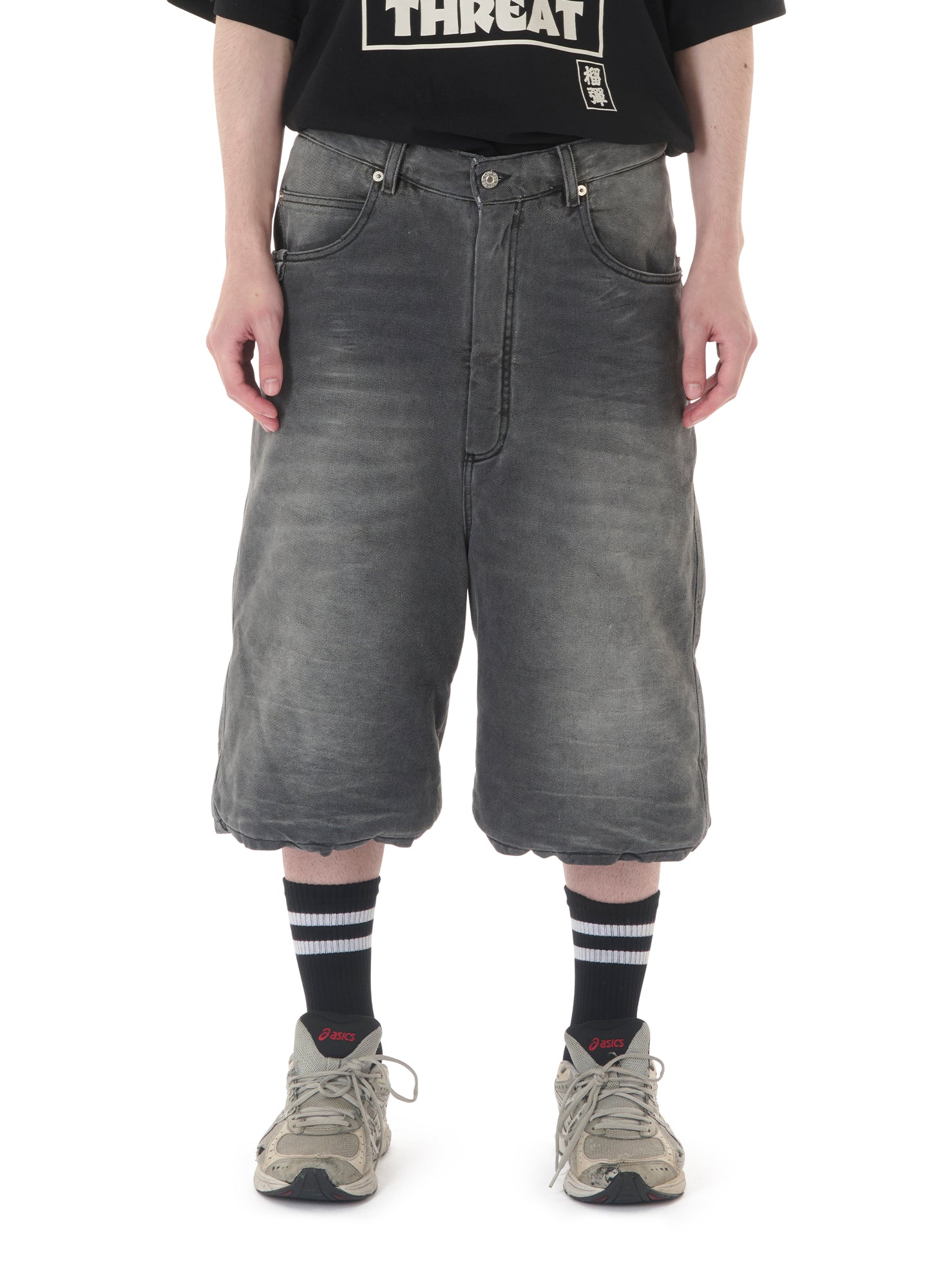 CUT FROM A WASHED DENIM, THE WADDING IN THESE SHORTS MAKES FOR AN ARMOURED LAYER, FURTHER EXAGGERATING THE ALREADY-OVERSIZED VOLUME. INTENDED FOR A MORE RUGGED LOOK, WE LOVE SEEING THESE STYLED CASUALLY WITH A TEE OR DISTRESSED KNIT. MODEL WEARS A SIZE 32.