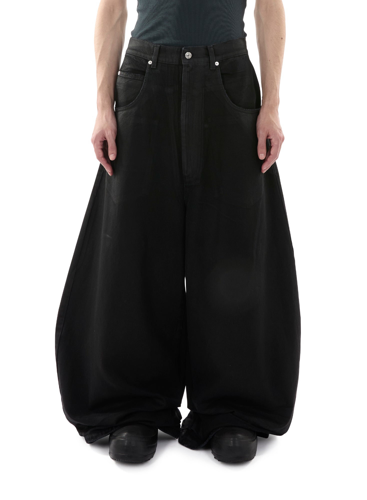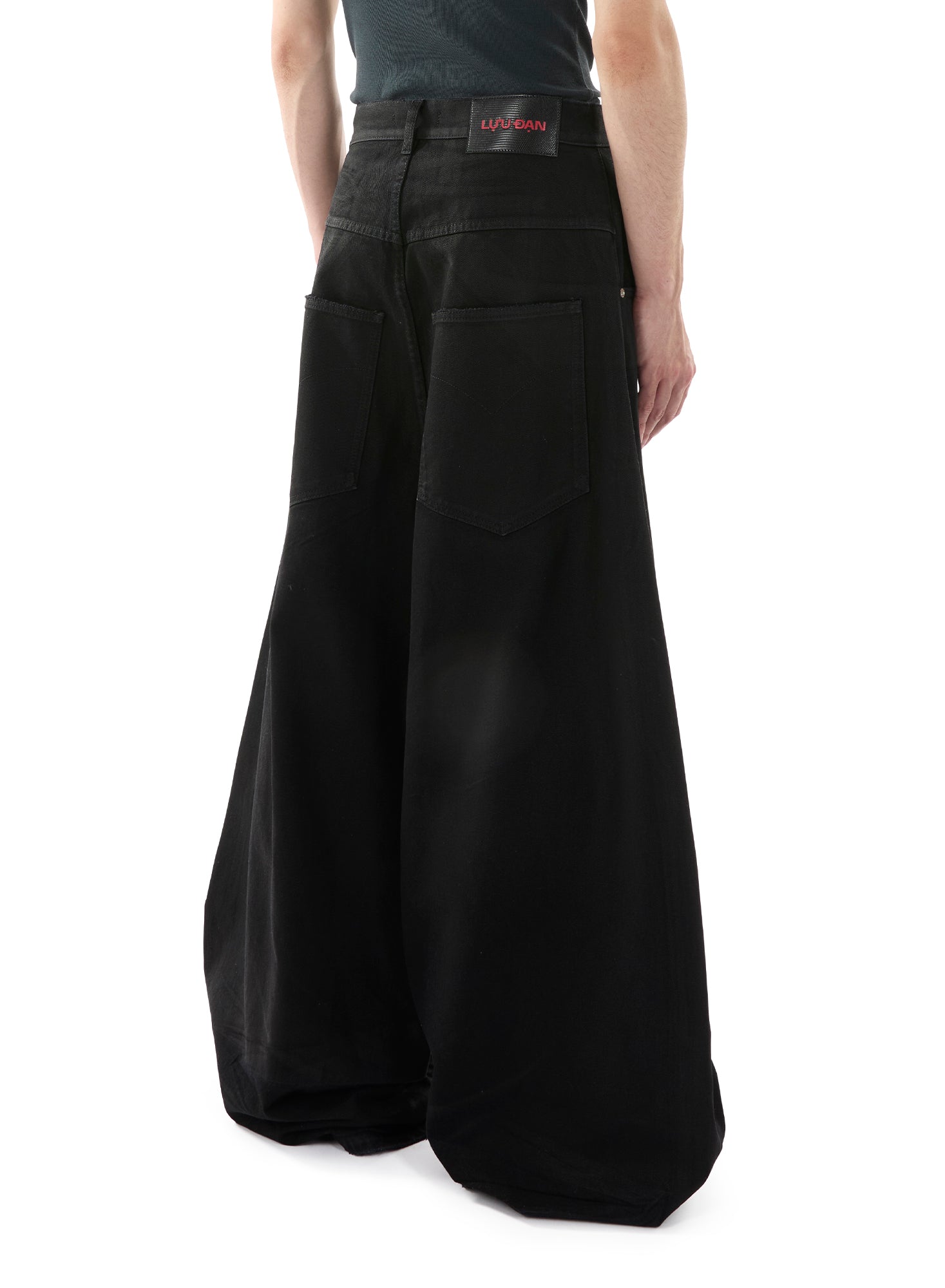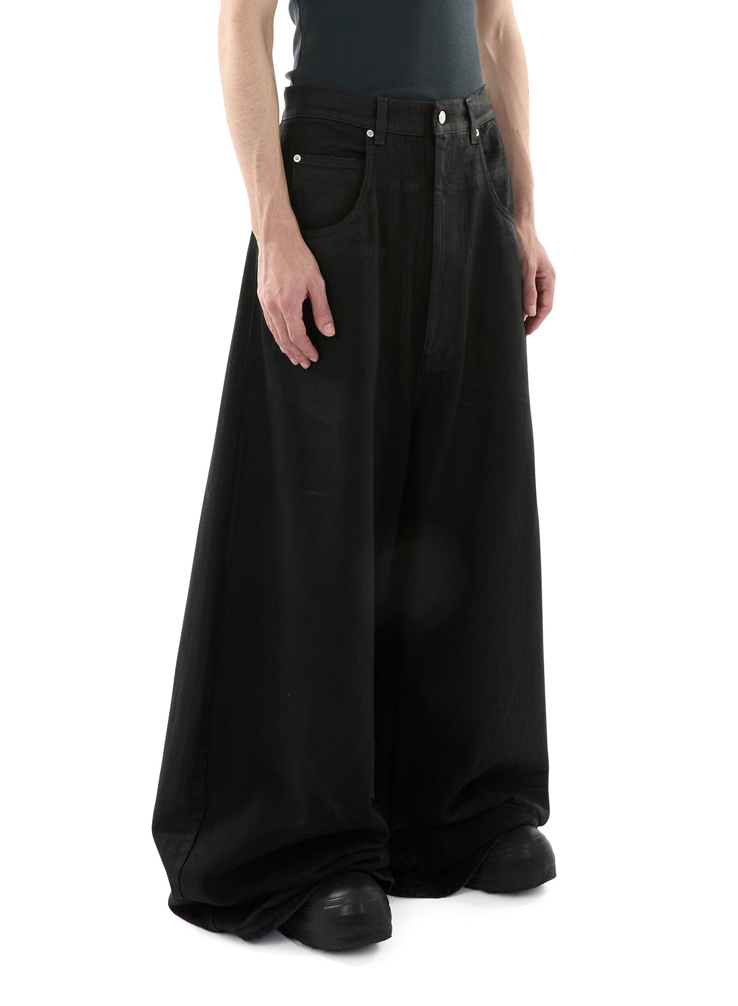 A SLICE OF THE 90S HIP-HOP SCENE, THE ‘DOUBLE XL JEANS’ EMANATE BOLDNESS THROUGH THEIR EXAGGERATED VOLUME AND OVERSIZED FIT. CUT FROM A COATED BLACK DENIM, A MUTED SHEEN IS CREATED BY THE 'WAXED’ EFFECT . WE LOVE SEEING THESE PAIRED SIMPLY WITH A TANK OR DRESSED UP WITH A BLAZER, THEY ARE THE PANTS FOR ANY OCCASION. MODEL WEARS A SIZE 32.