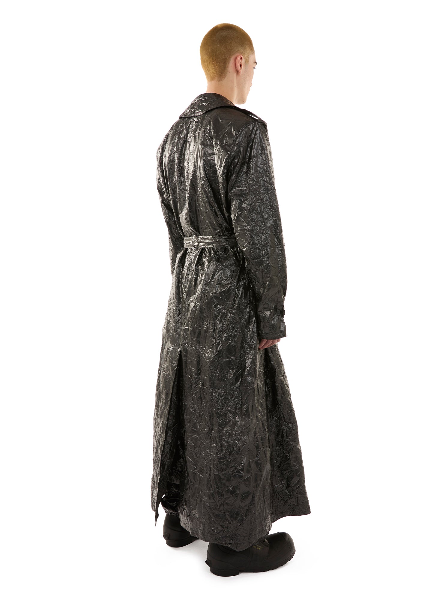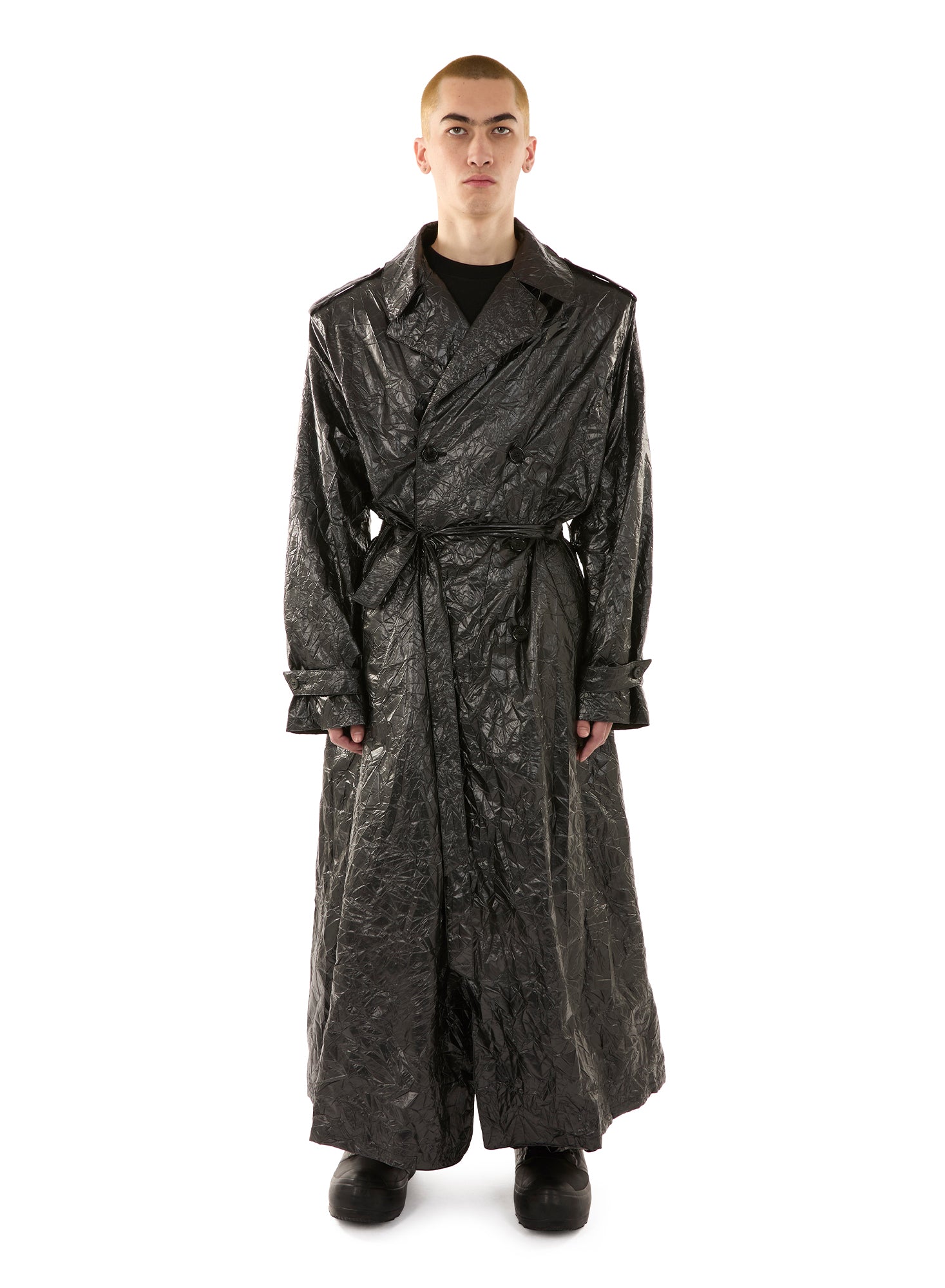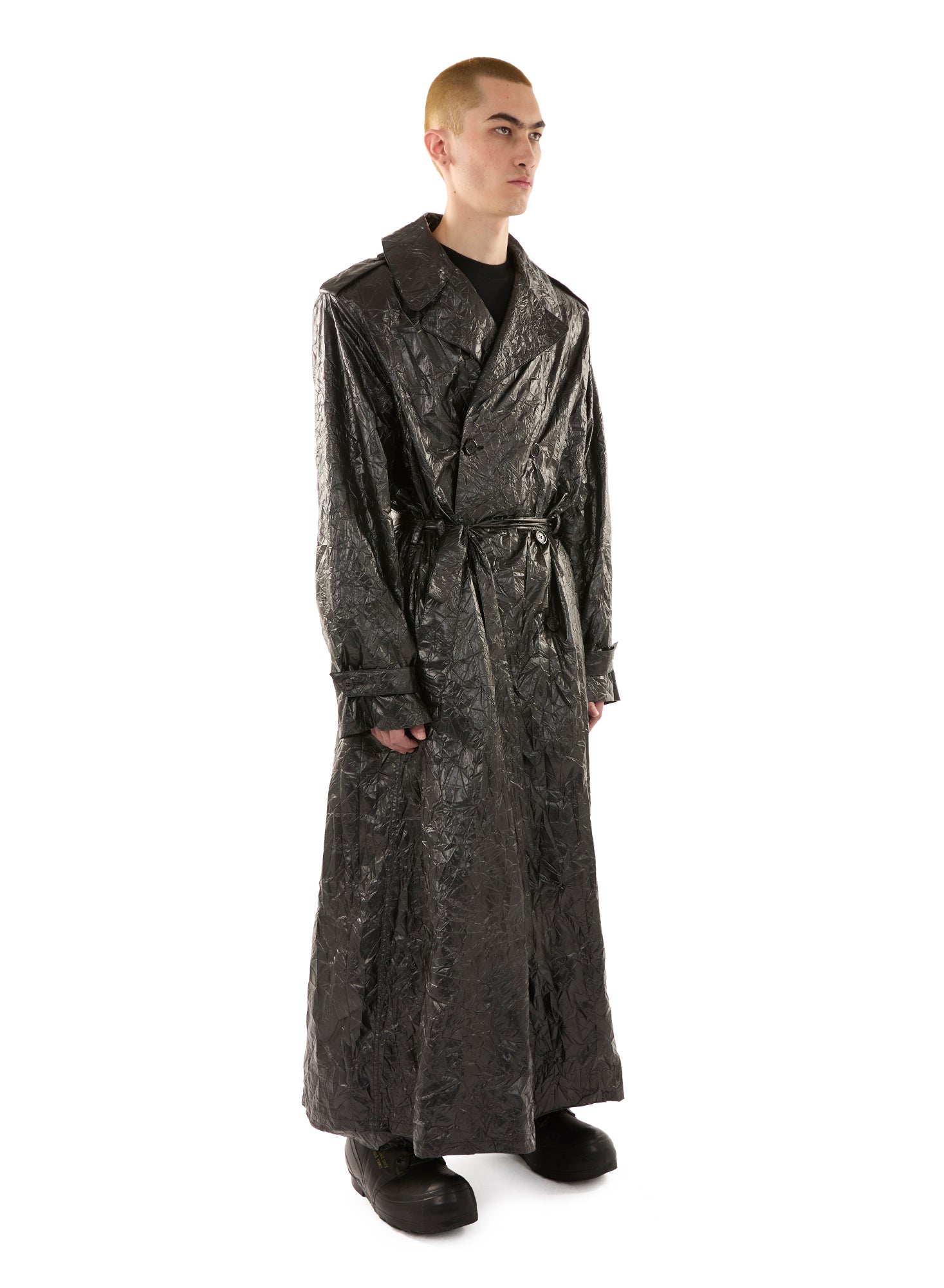 ANKLE-LENGTH TRENCH COAT IN A BLACK CRINKLED POLYAMIDE-RESIN BLEND FEATURING A COLD, UNNATURAL SHEEN. IT POSSESSES A DOUBLE-BREASTED FRONT WITH A WIDE, ANGULAR LAPEL AND EXAGGERATED LENGTH BUILT TO TRAIL LIKE A SHADOW. THE COATED FINISH GIVES IT A SLICK, ALMOST MOLTEN TEXTURE—ALIVE UNDER LIGHT, BUT DEAD IN THE EYES. DESIGNED TO DISTORT THE SILHOUETTE AND UNSETTLE THE ROOM. EVIL, ON PURPOSE. MODEL WEARS A SIZE 48.