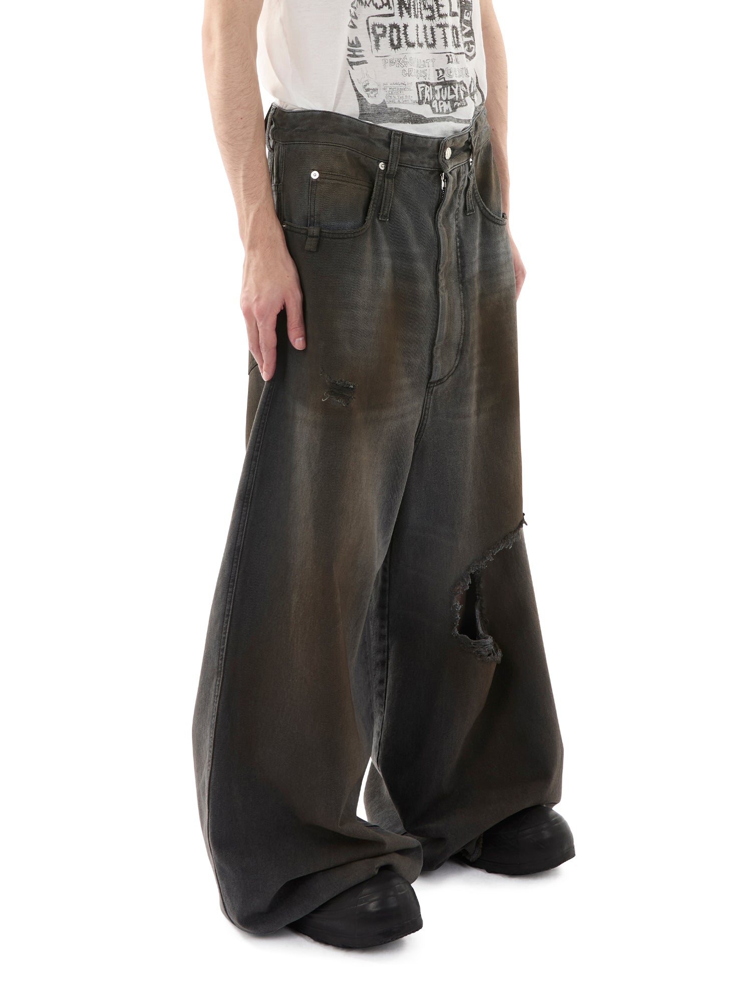 SPORTING AN EXAGGERATED VOLUME, THESE JEANS RETURN IN A NEW GREY WASH. FEATURING A SOFTER FADE AND CLEANER FINISH, THEY STAY UNDERSTATED YET VERSATILE, FINISHED WITH A SIGNATURE LỰU ĐẠN BRANDED DENIM BUTTON AND RIVETS. A LARGE, FRAYED TEAR AT THE KNEE ADDS A WORN-IN EDGE THAT CONTRASTS AGAINST THE STRUCTURED, WIDE-LEG SILHOUETTE. MODEL WEARS A SIZE 32.