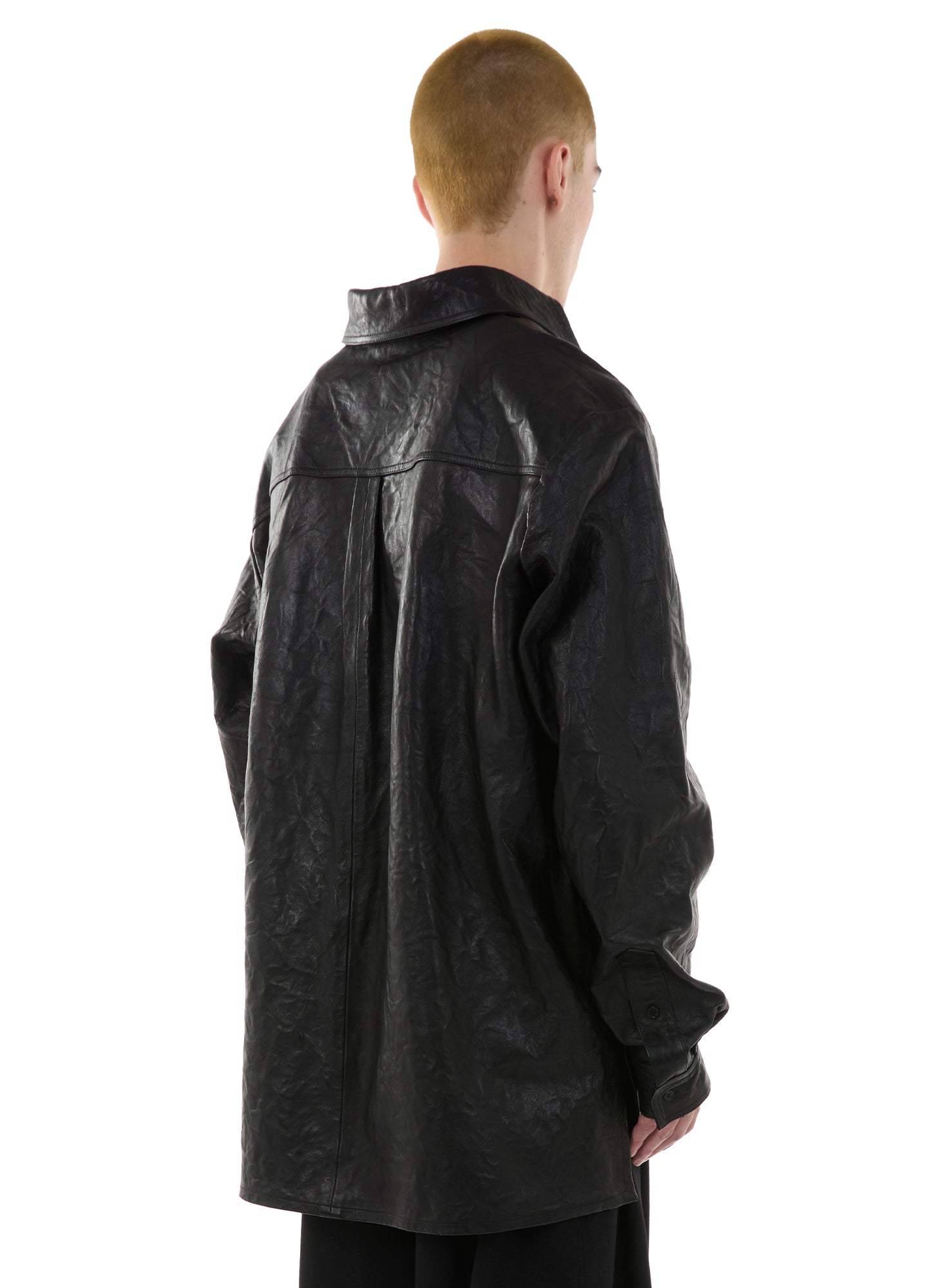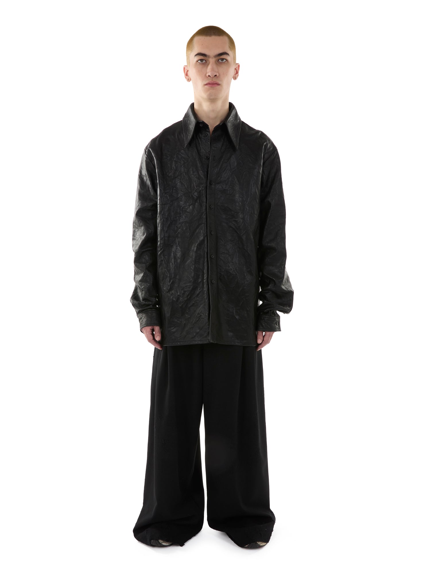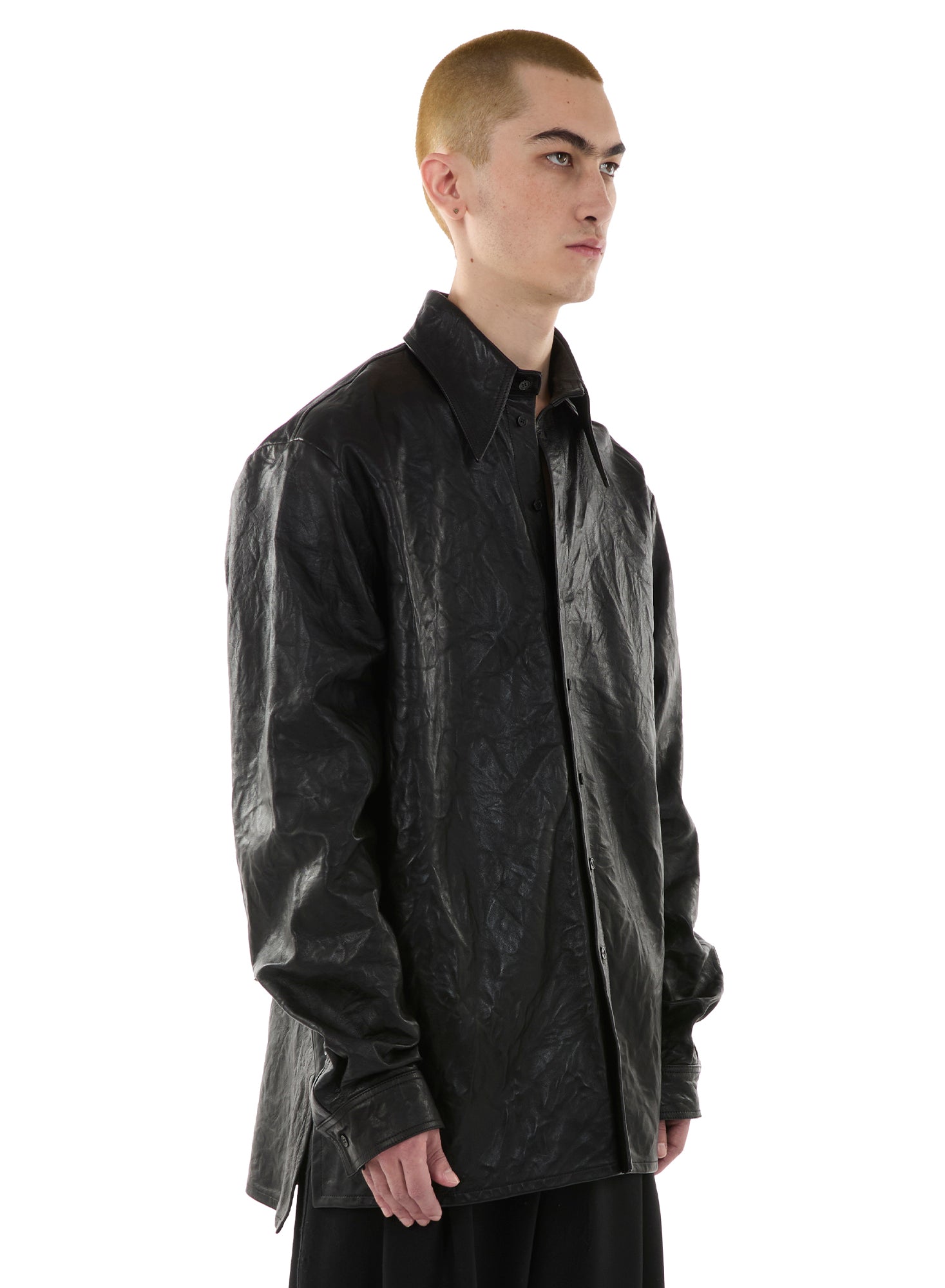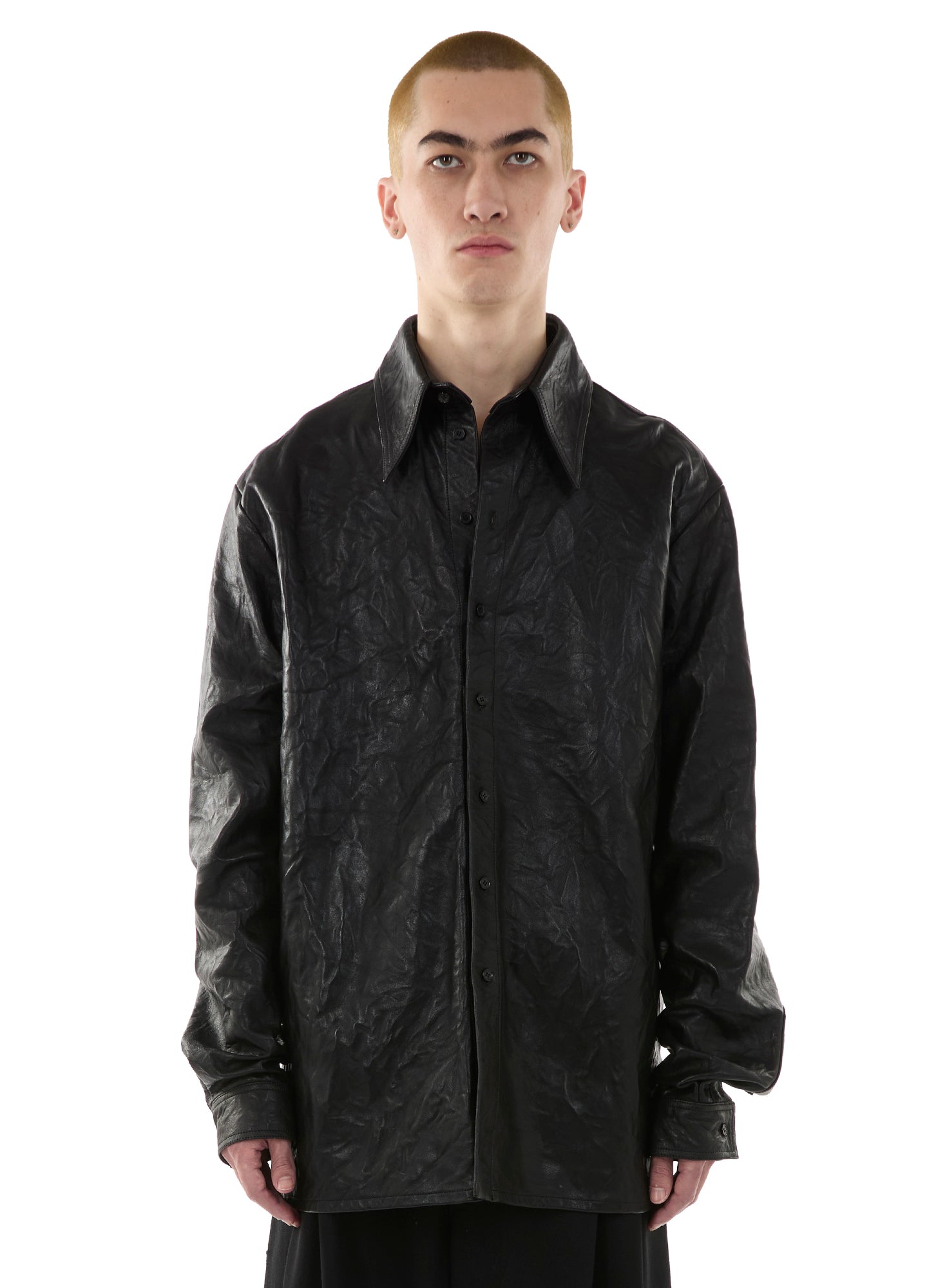 LOOKS POLISHED. FEELS RUINED. THIS LONG SLEEVE SHIRT IS CUT FROM CRINKLED LAMB NAPPA LEATHER — SOFT, SCRAPED, AND A LITTLE STRUNG OUT. SHARP COLLAR. RELAXED FIT. BUILT FOR THE KIND OF PRESENCE THAT DOESN’T ASK TWICE. MODEL WEARS A SIZE M.