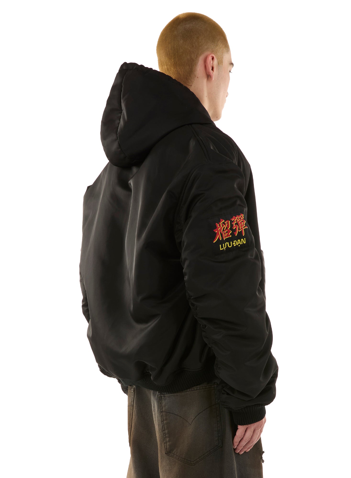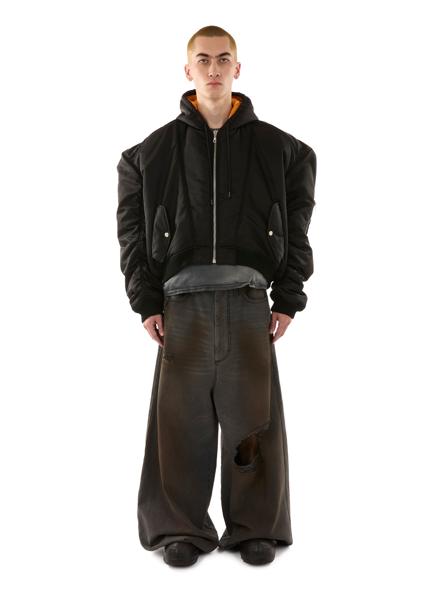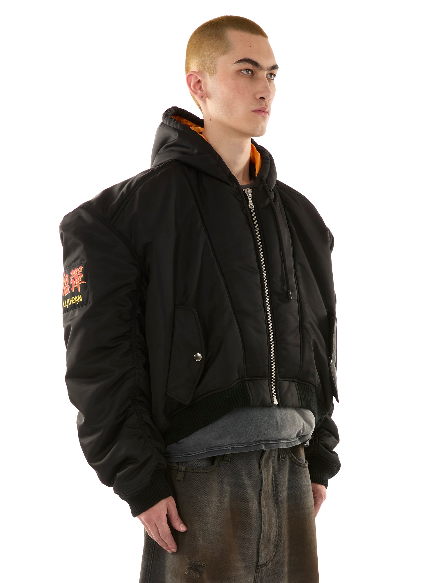 AN UNAPOLOGETICALLY DISTINCT JACKET THAT EXHIBITS AN ASYMMETRIC SHAPE. OUR 'PATCH BOMBER' FALLS EFFORTLESSLY AT THE SHOULDER, CREATING FOR A NATURALLY SLOUCHY LOOK - IT IS DETAILED CAREFULLY WITH LINES AND CURVES THAT ADD TO THE VISUAL LANGUAGE OF THIS STANDOUT ITEM, FINISHED WITH AN ORANGE LINING. MODEL WEARS A SIZE M.
