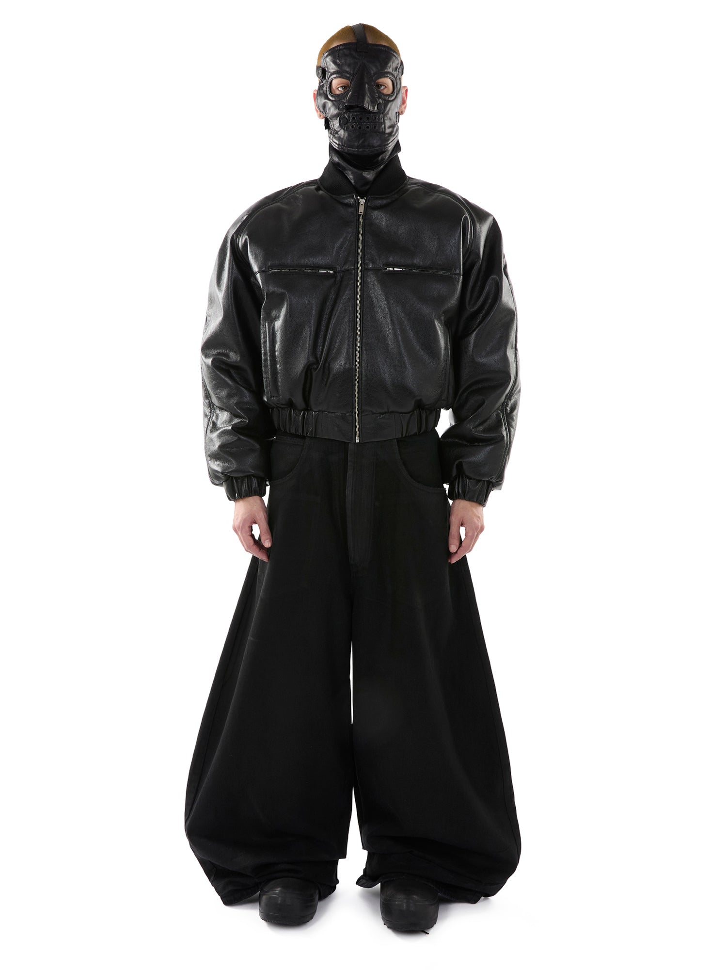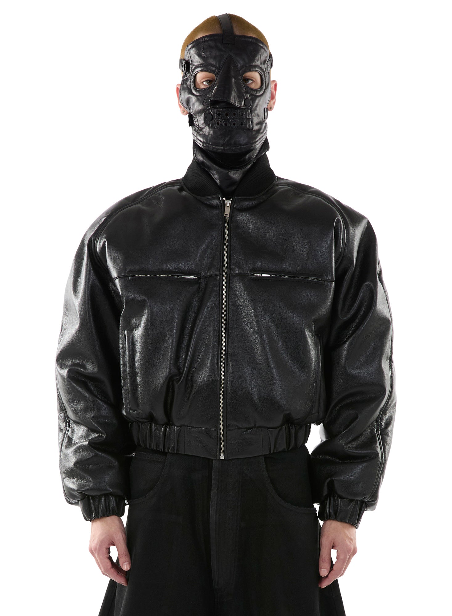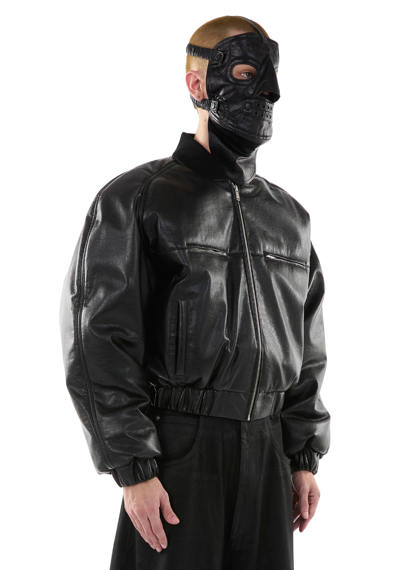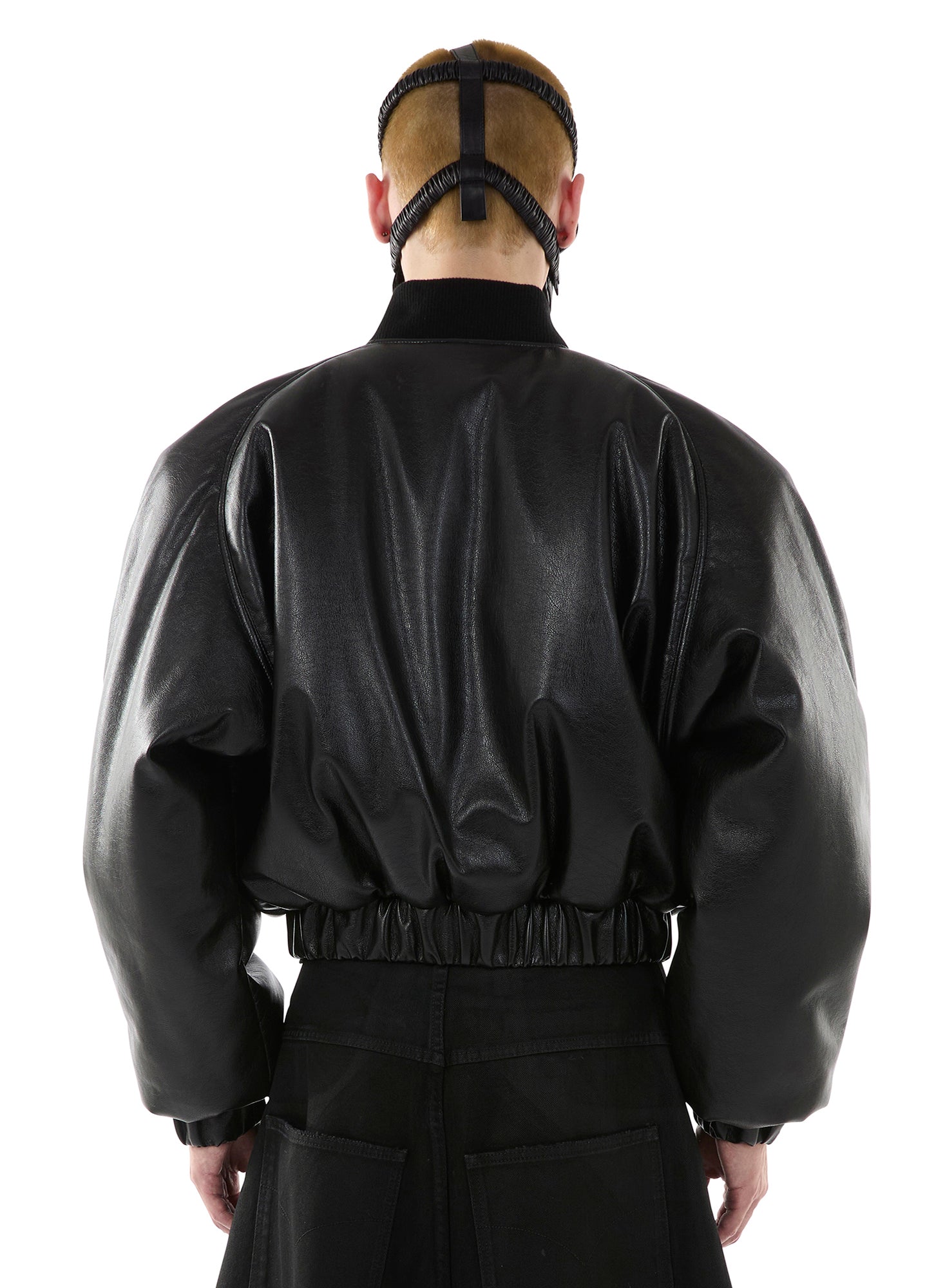 A BOXY, CROPPED BOMBER CUT FROM JET-BLACK FAUX LEATHER WITH A VARSITY-ADJACENT SILHOUETTE AND NONE OF THE INNOCENCE. ELASTICATED WAIST, ZIP CLOSURE, NO SOFTNESS. A REWORK OF OUR CLASSIC HONG KONG BOMBER — BUT SHARPER, HEAVIER, AND SUITED FOR BAD DECISIONS. LOOKS LIKE TROUBLE. WEARS LIKE ARMOR. MODEL WEARS A SIZE M.