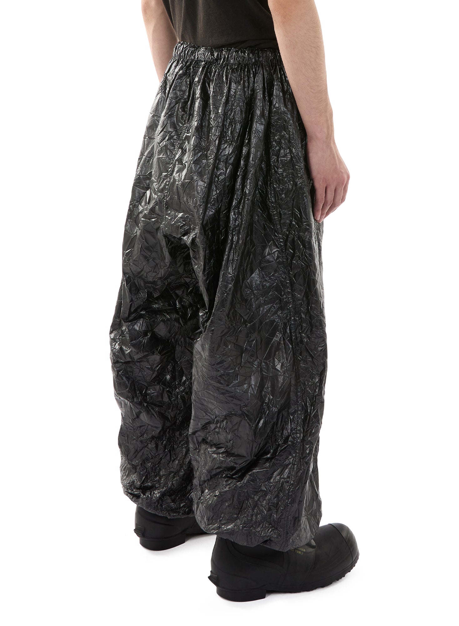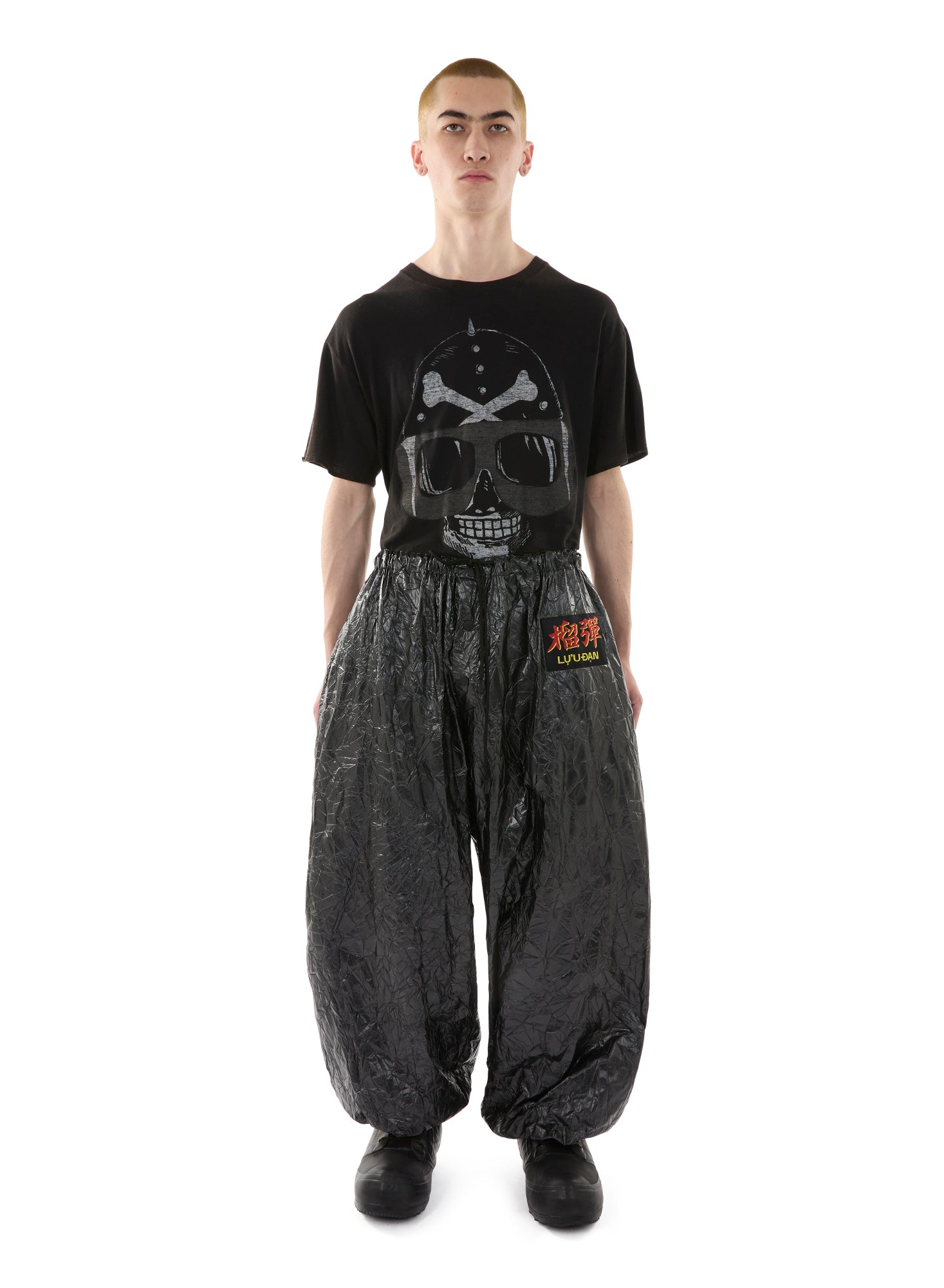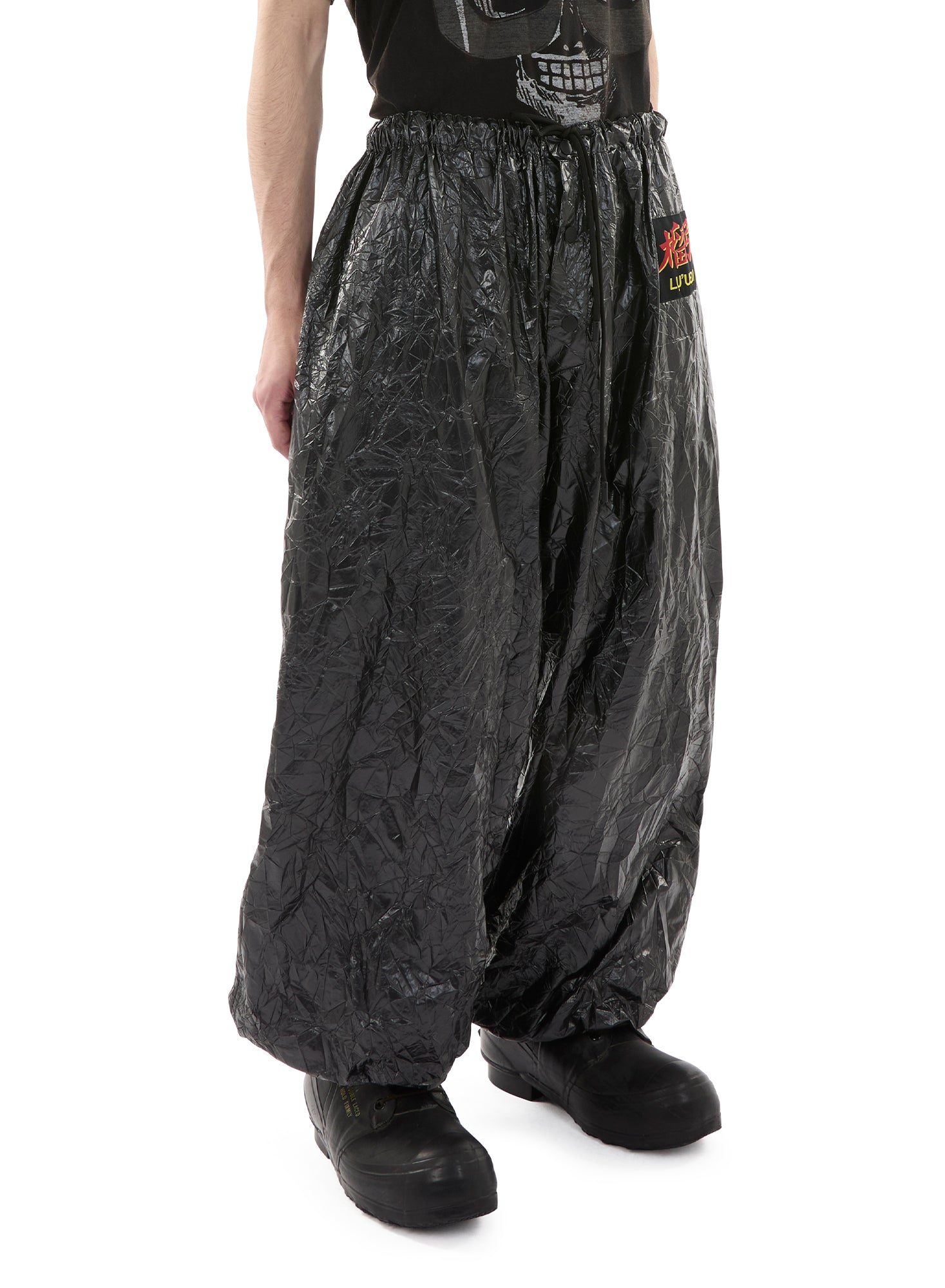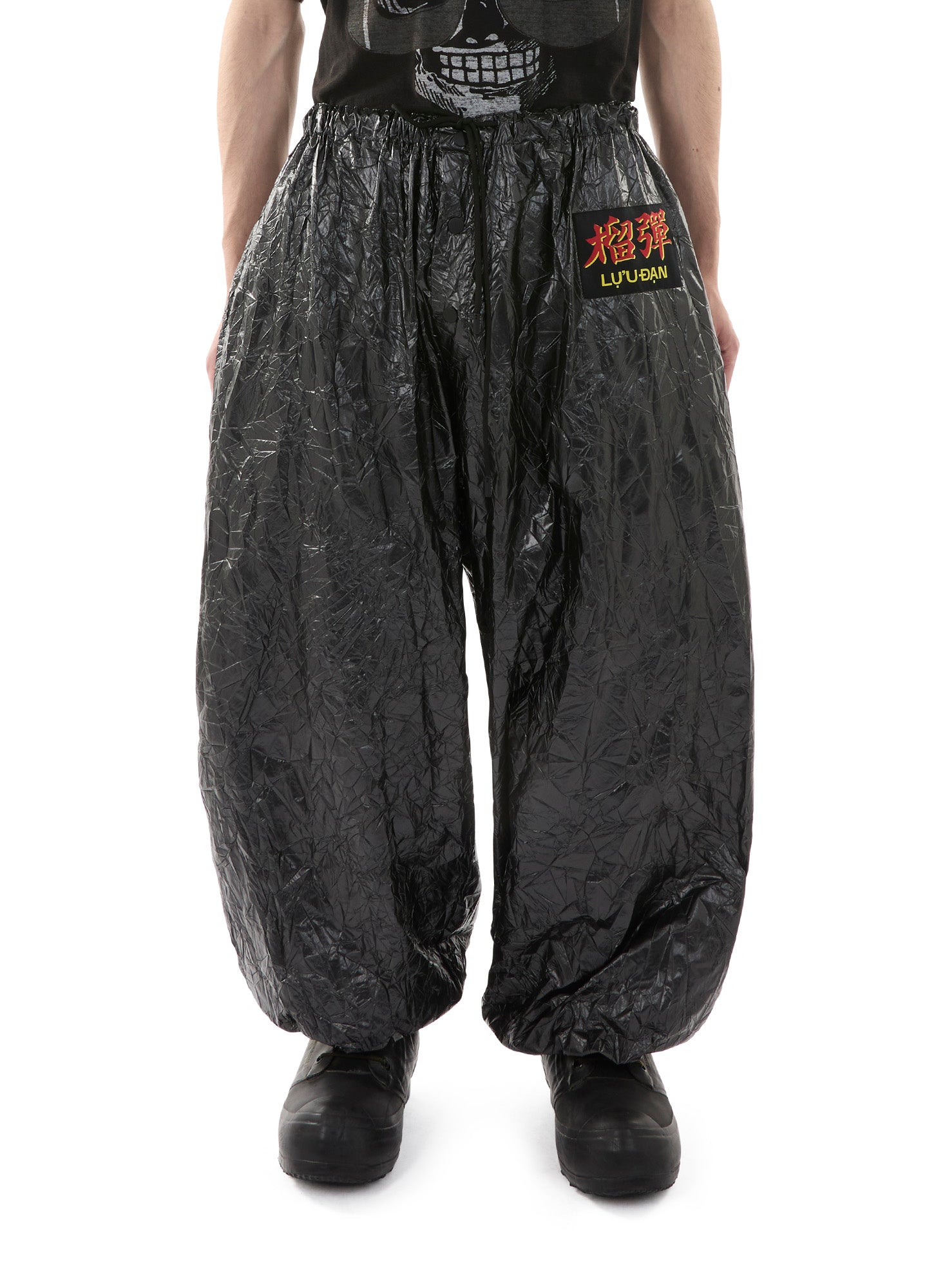 THESE TRACK PANTS ARE CUT FROM RESIN-COATED SHELL TO MIMIC THE LOOK AND FEEL OF FOUND MATERIALS — A DELIBERATE “TRASHBAG” EFFECT THAT CATCHES LIGHT LIKE OIL-SLICK PLASTIC. CRINKLED TEXTURE RUNS THROUGH THE OVERSIZED SILHOUETTE, CINCHED AT THE WAIST AND ANKLES FOR A BALLOONED, STREET-HEAVY SHAPE. SIGNED OFF WITH OUR SIGNATURE LỰU ĐẠN PATCH AT THE HIP. MODEL WEARS A SIZE M.