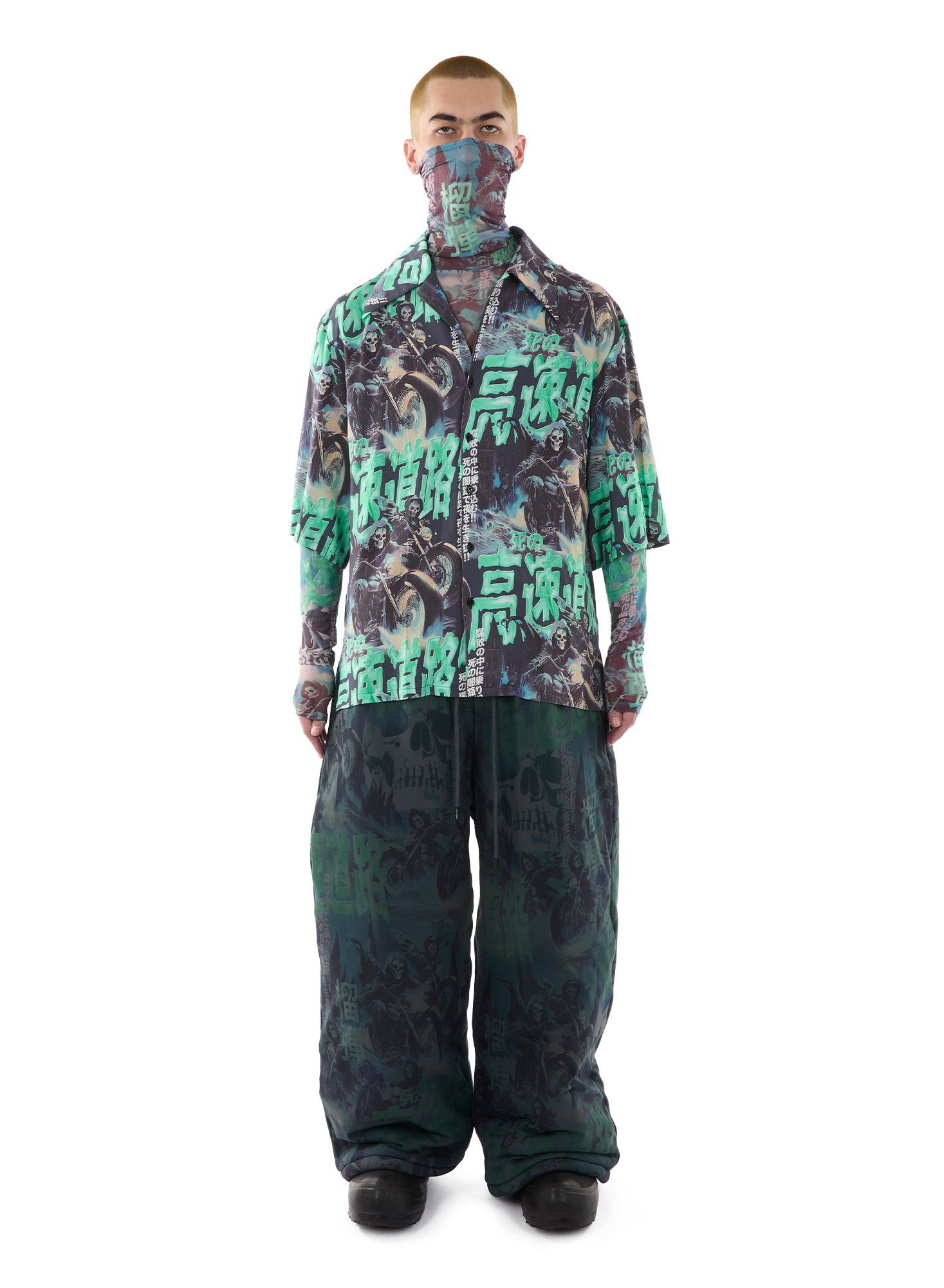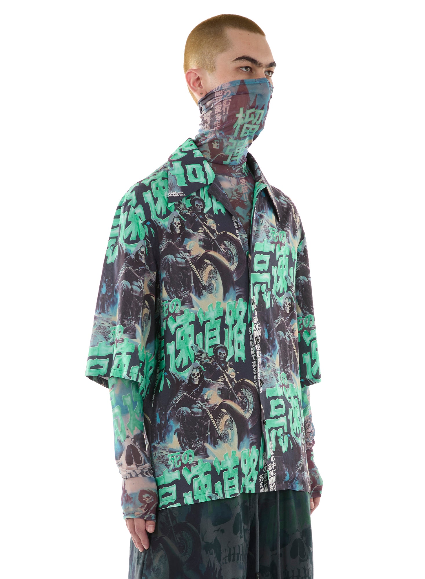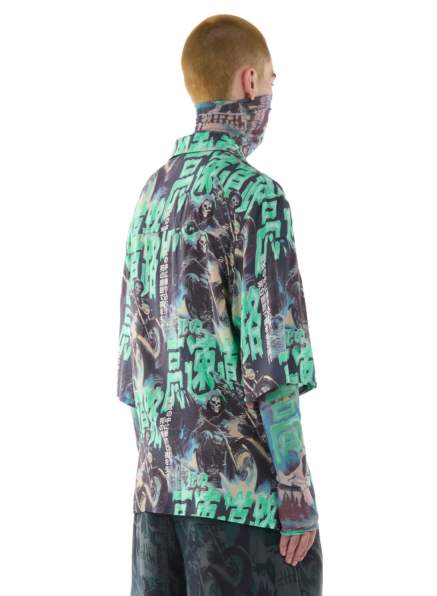 TOP BUTTON UNDONE AND LET THE SHIRT DO THE TALKING. CRAFTED FROM A 'GHOSTRIDERS' PRINTED FABRIC, THIS PIECE IS A FRESH CLASSIC. A TASTEFUL ADDITION TO ANY TAILORING LOOK OR TO BE WORN CASUALLY. MODEL WEARS A SIZE M.