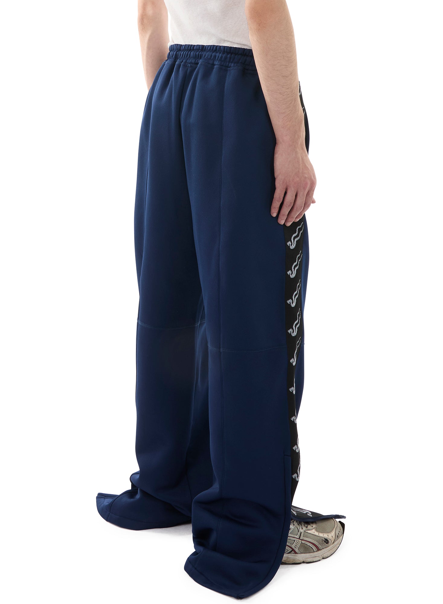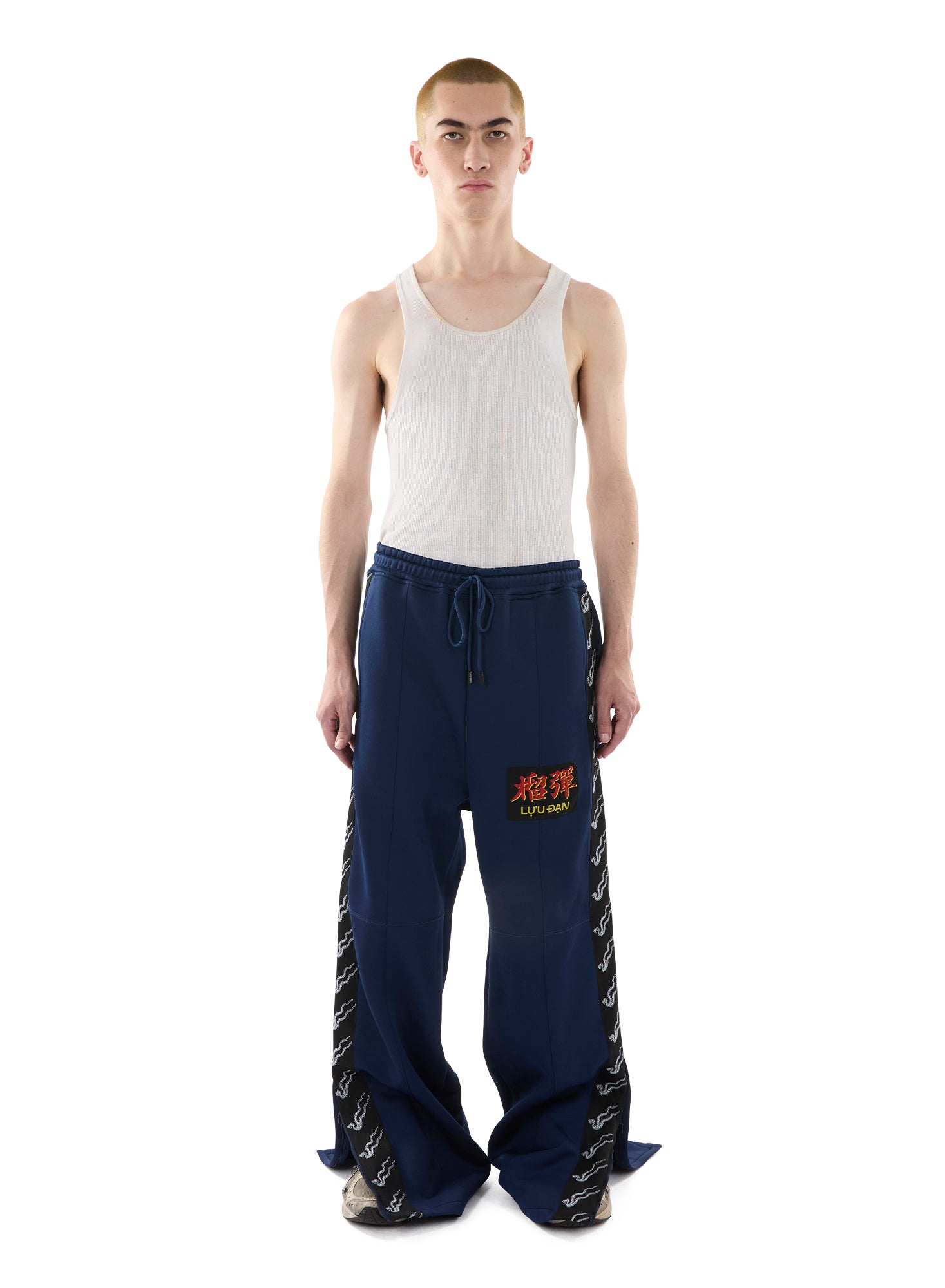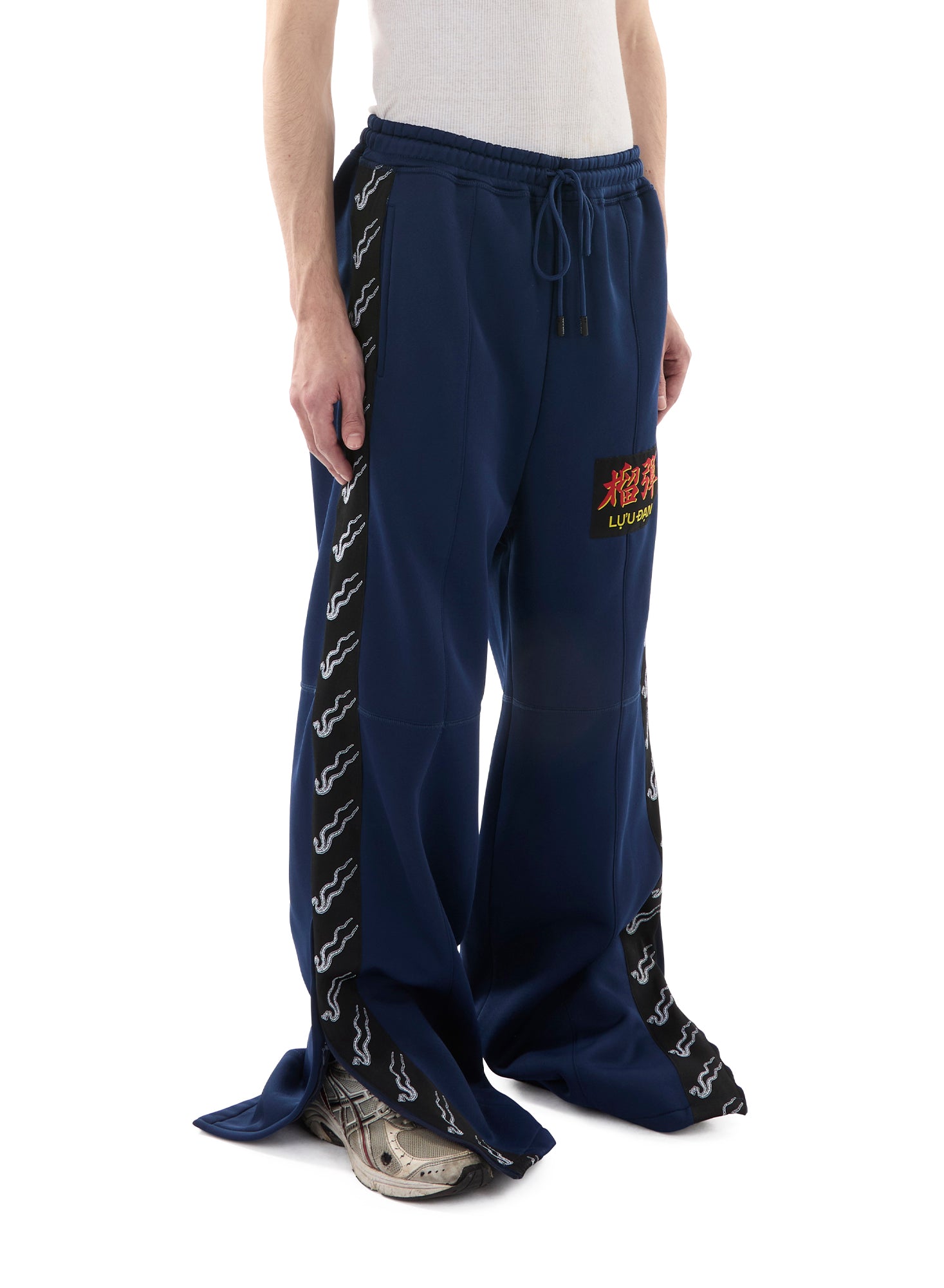 CUT LOOSE BUT BUILT SHARP. THESE TRACK PANTS RUN IN LIGHTWEIGHT NAVY NYLON, TRIMMED WITH OUR ‘DOUBLE BODIED SNAKE’ LOGO TAPE DOWN EACH LEG. DUAL SIDE ZIPS LET YOU SWITCH FROM TAPERED TO FLARED IN SECONDS — FROM LOW PROFILE TO FULL SPREAD. ELASTICATED WAISTBAND AND DRAWSTRINGS LOCK THE FIT, WHILE OUR SIGNATURE PATCH AT THE THIGH CALLS IT FOR WHAT IT IS: UNMISTAKABLY LỰU ĐẠN. MODEL WEARS A SIZE M.
