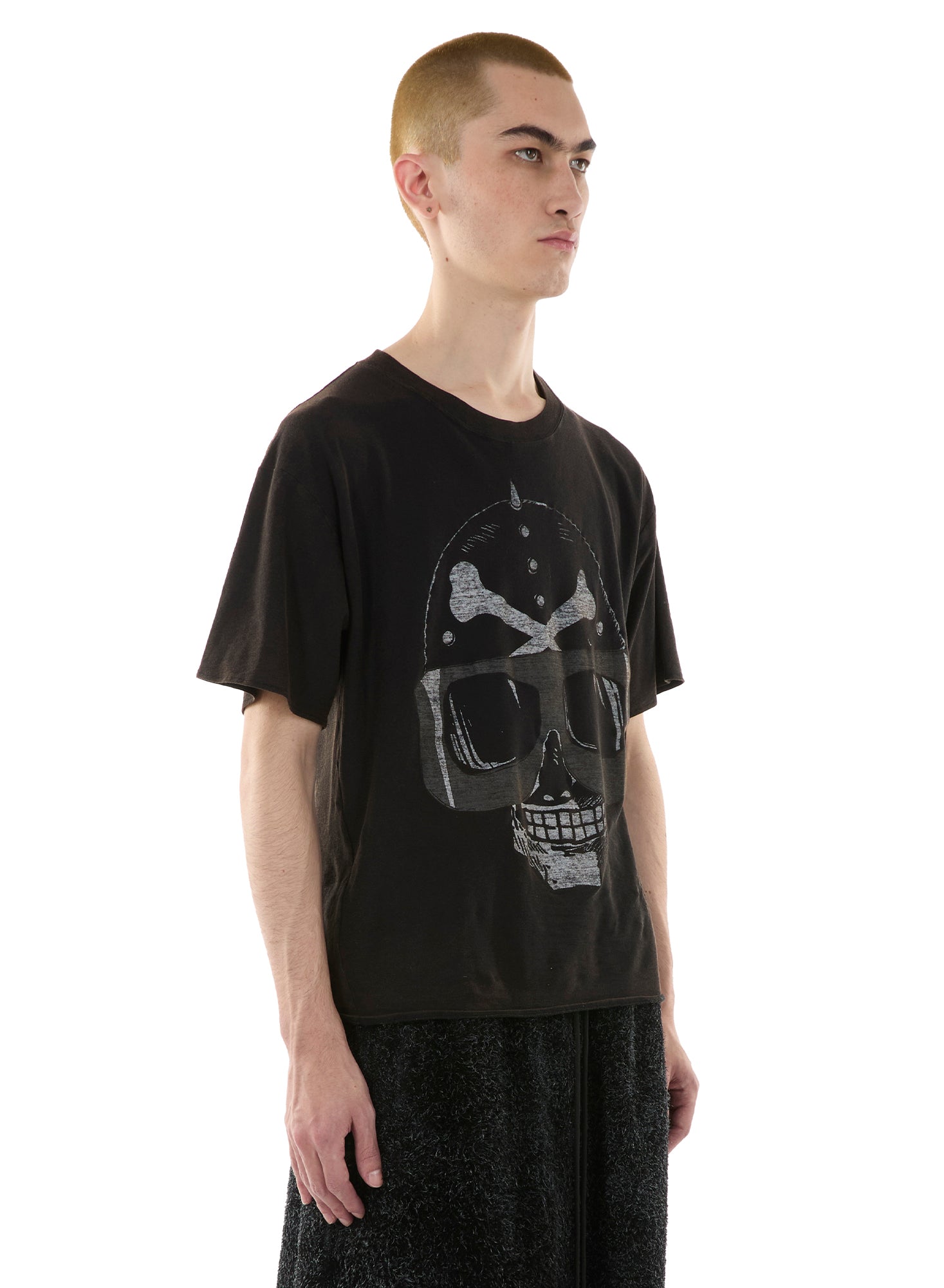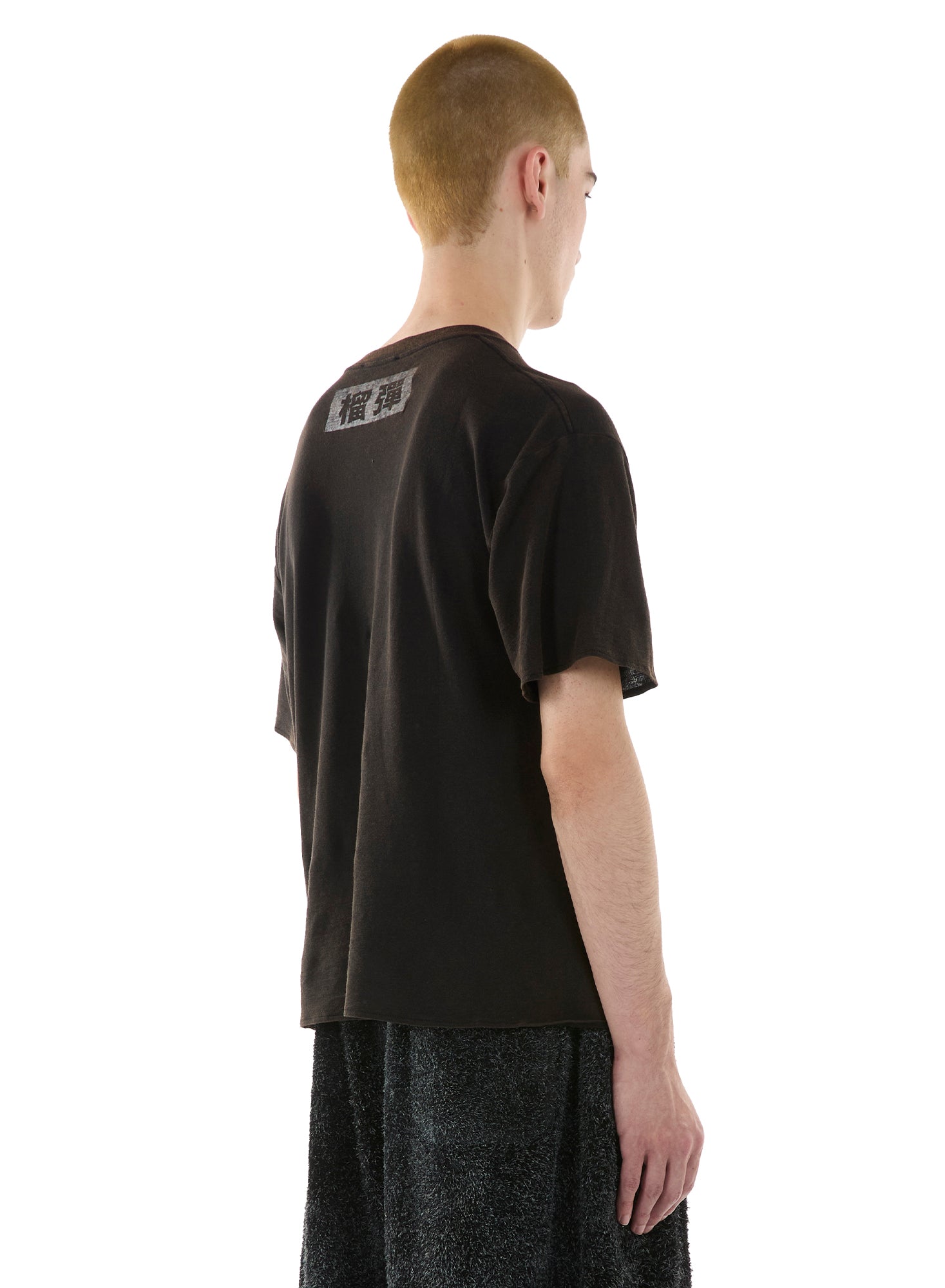 A TEE THAT ENCAPSULATES THE ENERGY OF RAW, PUNK BRAWL. CUT FROM A WASHED BLACK COTTON JERSEY, FEATURING A TWISTED HEM AND LONG-LINE SHAPE, IT EMBODIES THE ESSENCE OF PULSING MUSIC AND FLASHING LIGHTS. FOR THOSE WITH AN UNTAMEABLE SPIRIT. MODEL WEARS A SIZE M.