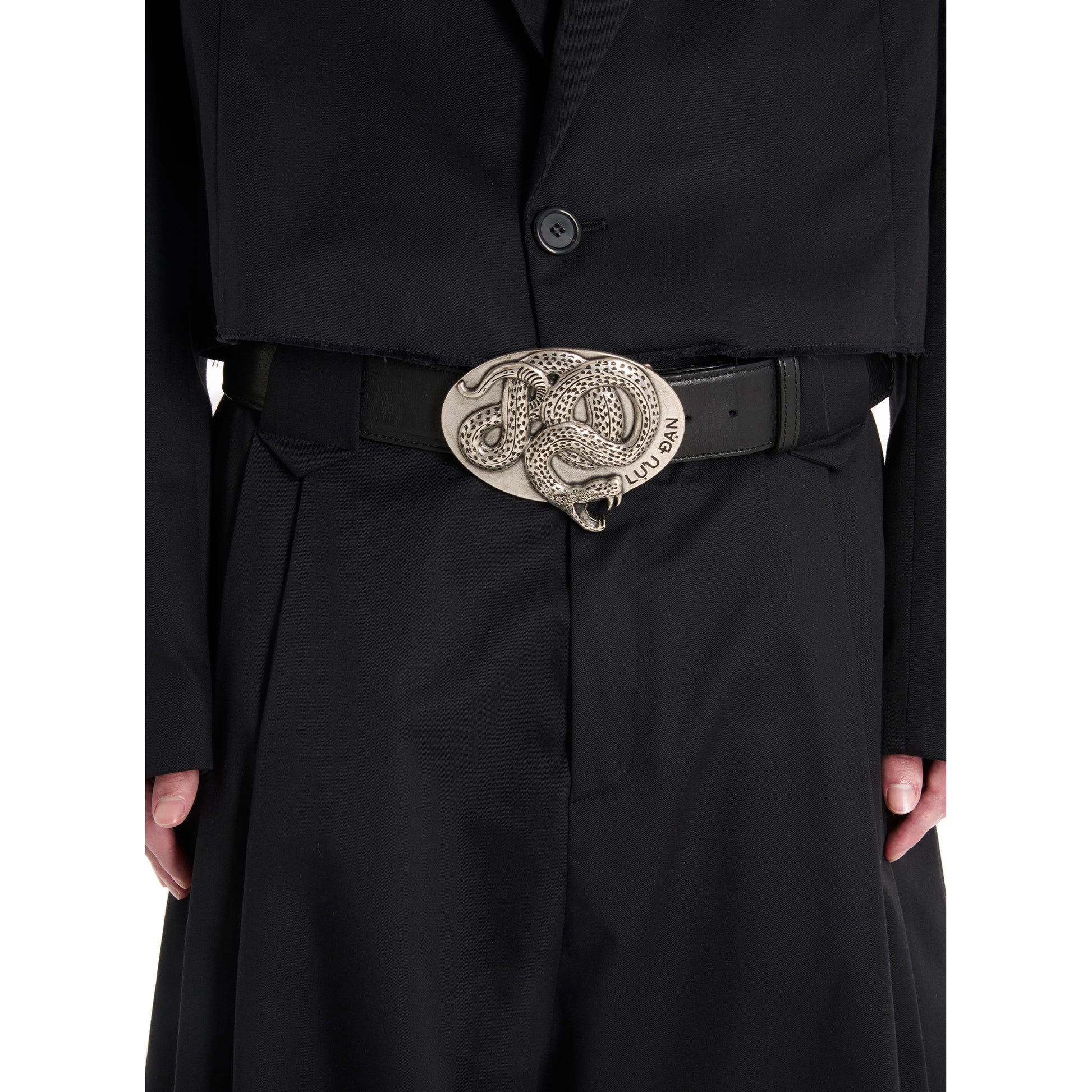 IF YOU ONLY HAVE ONE BELT IN YOUR CLOSET, LET IT BE THIS, AS ALL OTHERS WILL PALE IN COMPARISON. WITH THICK, DURABLE, BLACK LEATHER AND AN OVERSIZED SILVER BUCKLE EMBLAZONED WITH THE LU'U-DAN ICON- A DOUBLE BODIED SNAKE- MAKE THIS BELT A TRUE STATEMENT PIECE.