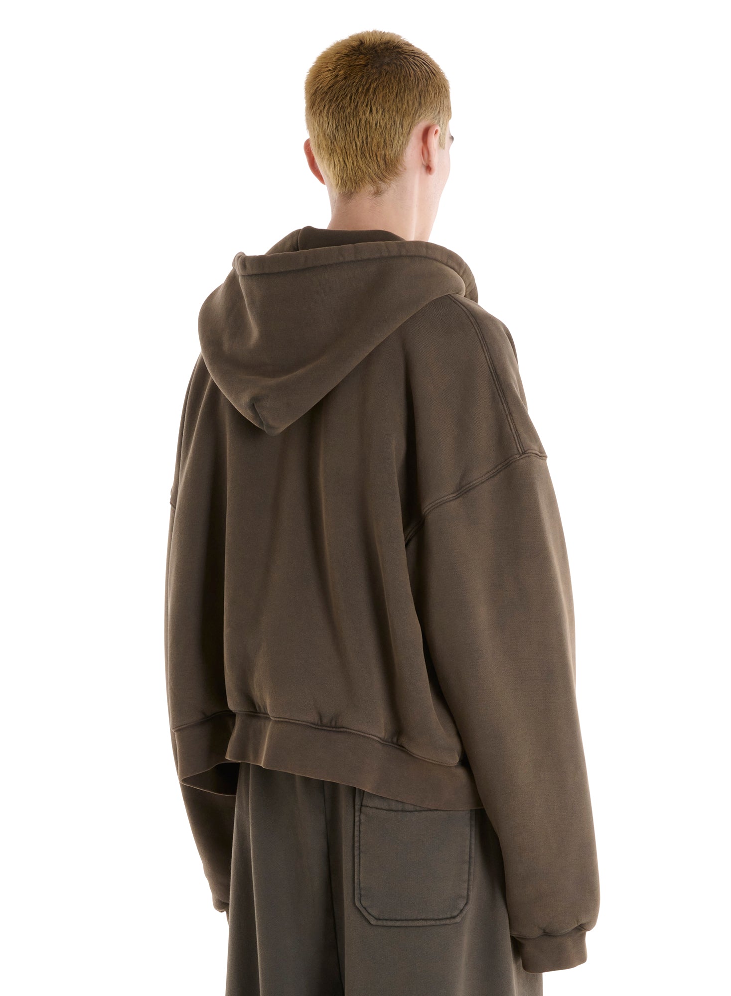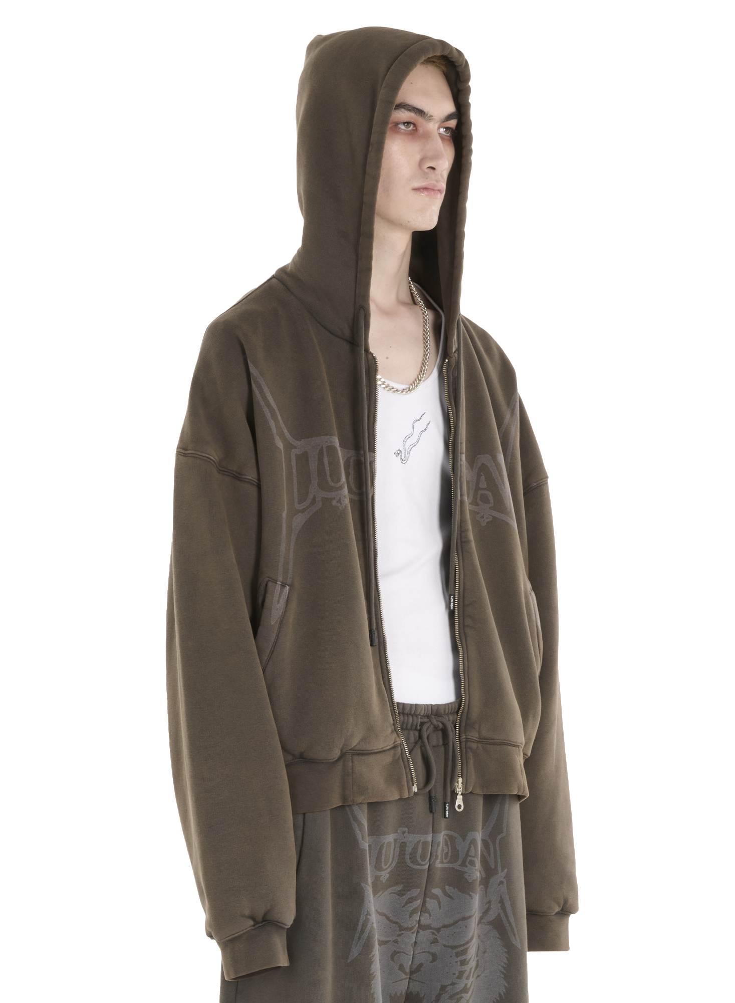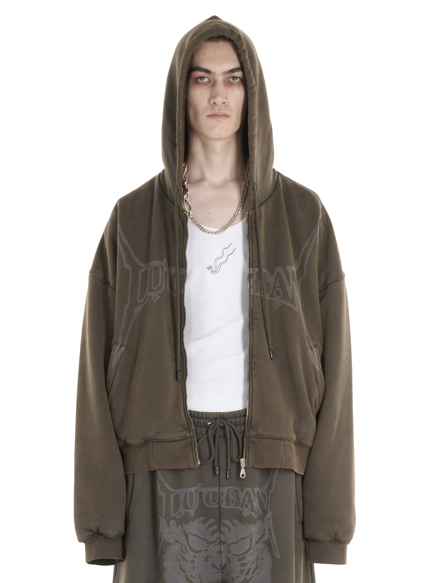 NOT QUITE A JACKET BUT HEAVIER THAN A HOODIE, THIS LAZER-PRINTED JERSEY ZIP-UP IS GREAT FOR SPRING NIGHTS IN CHINATOWN. OVERDYED AND WASHED GIVING THIS PIECE STRUCTURE AND WEIGHT. MODEL WEARS A SIZE M.
