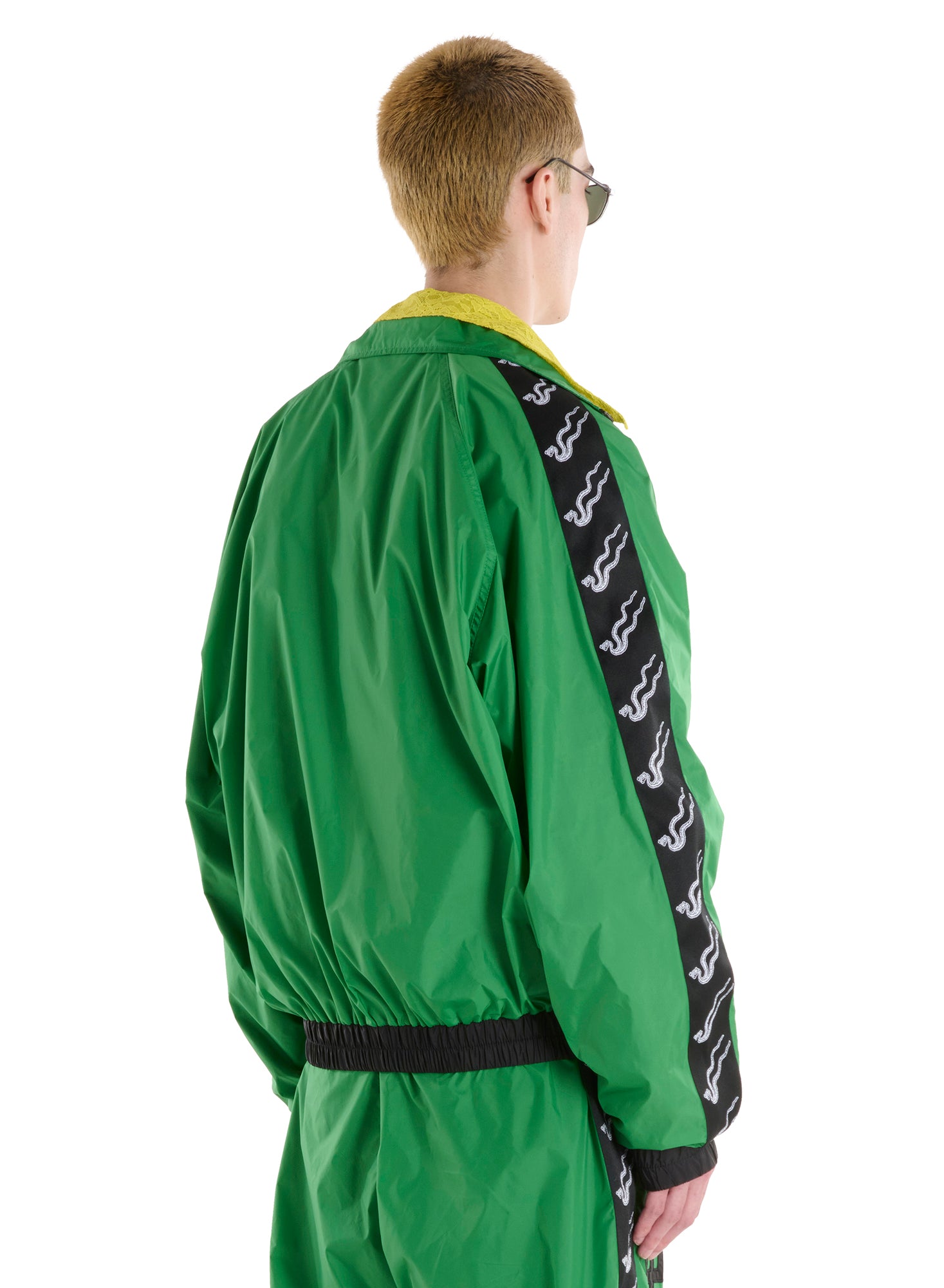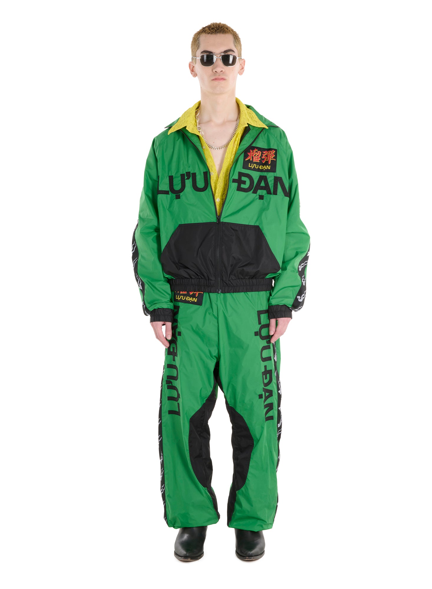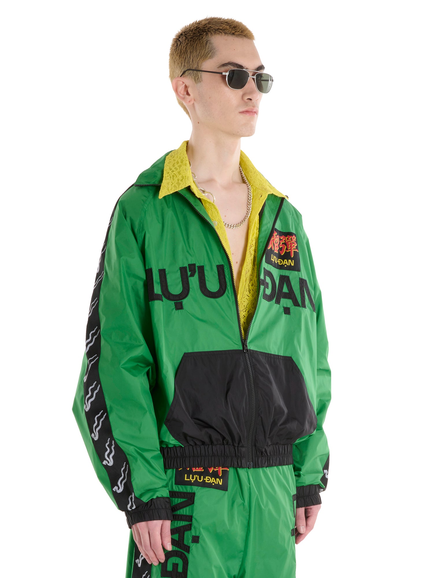 A LỰU ĐẠN CULT CLASSIC. TAPPING THE VISUAL LANGUAGE OF THE 80'S, THIS TRACK JACKET IS A BOLD AND UNMISTAKABLE STATEMENT THAT FORMS PART OF A HEAVILY DETAILED TWO-PIECE SET; BRANDED PATCHES AND TAPE, ENCRUSTED LETTERING AND DYNAMIC CUTOUTS ELEVATE A CLASSIC DESIGN INTO A STANDOUT STATEMENT PIECE. MODEL WEARS A SIZE M.
