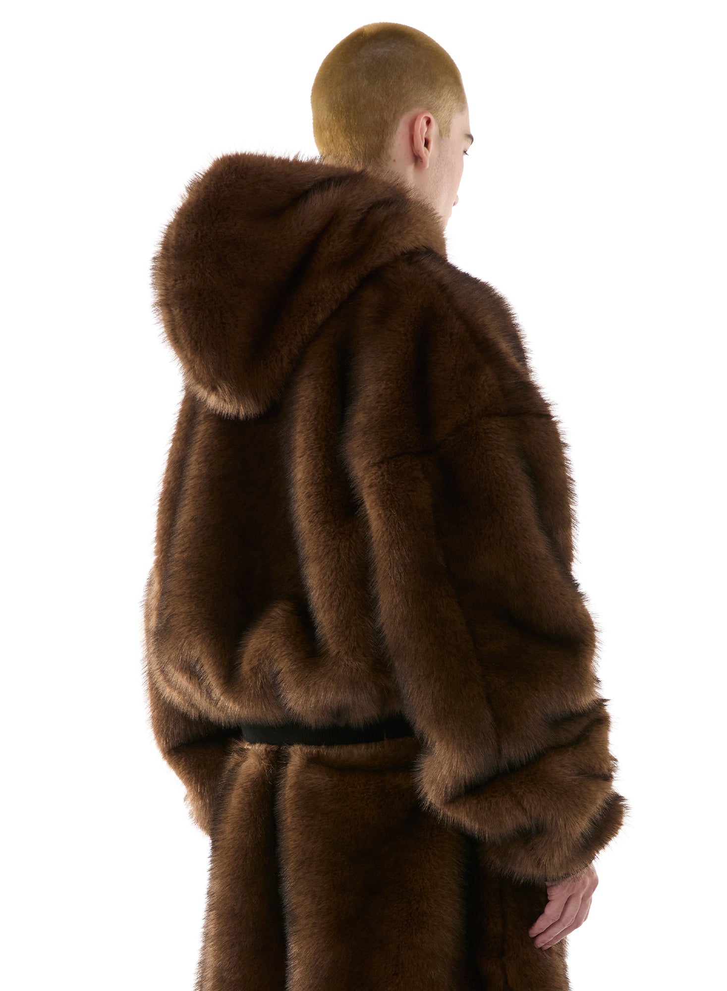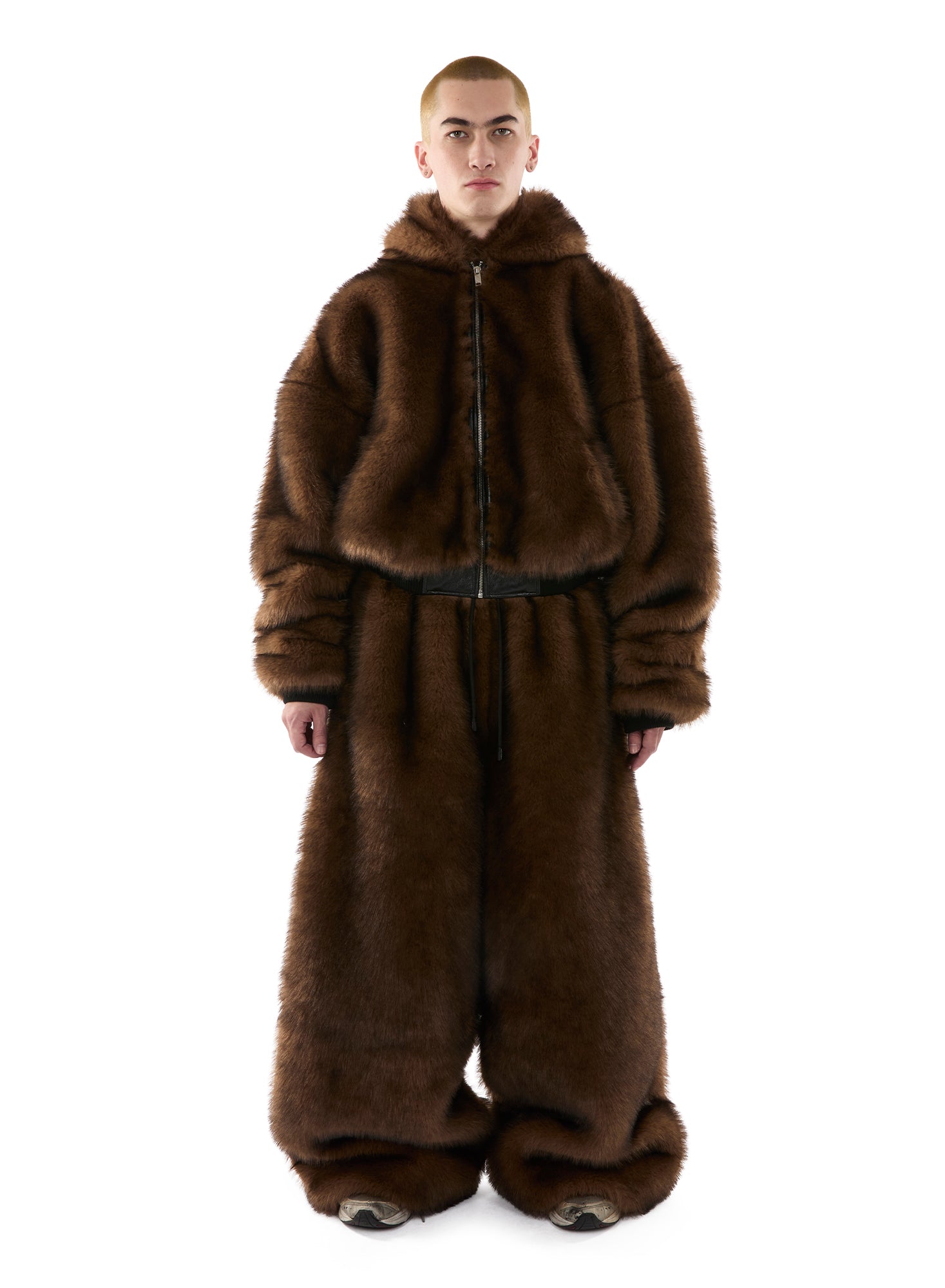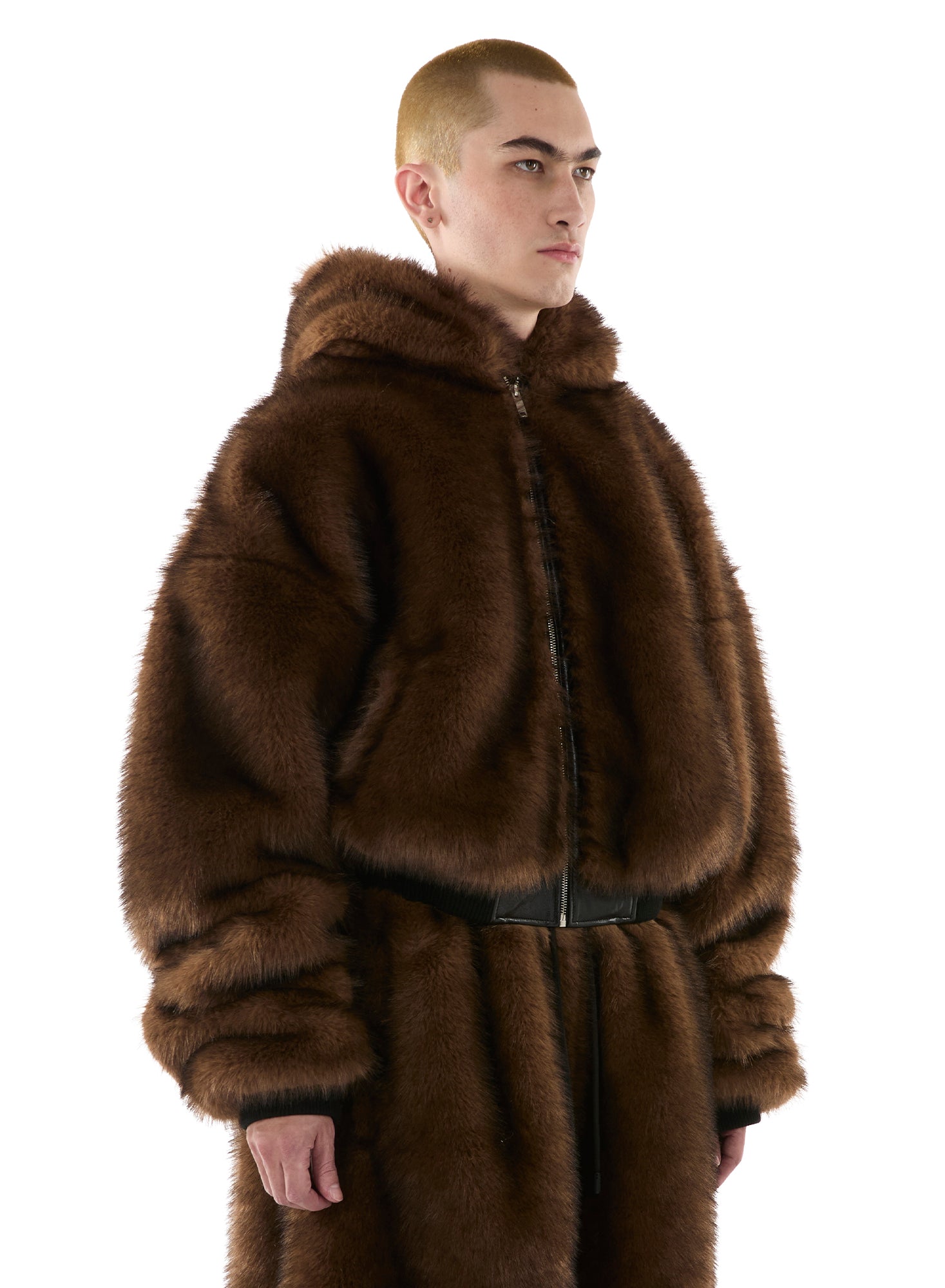 AN OVERSIZED HOODIE CUT FROM VOLUMINOUS FAUX BROWN FUR WITH A WILD, YETI-LIKE PRESENCE. LEATHER TRIMS ACCENT THE ZIP CLOSURE AND CINCHED WAISTBAND, ADDING CONTRAST AND STRUCTURE TO THE OTHERWISE FERAL SILHOUETTE. ELASTICATED HEM GATHERS THE BULK JUST ENOUGH TO KEEP THE BEAST CONTAINED. IF YOU’RE LOOKING FOR BIGFOOT, YOU FOUND HIM. MODEL WEARS A SIZE M.