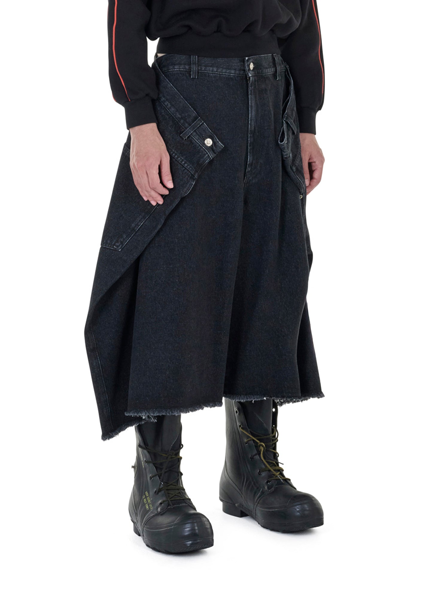 CUT WIDE AND DELIBERATE, THE MAXI SHORT PUSHES PROPORTIONS INTO NEW TERRITORY. RINSED BLACK KEEPS THE LOOK CLEAN WHILE THE WIDTH ADDS DRAMA AND INTENT. MODEL WEARS A SIZE 32.