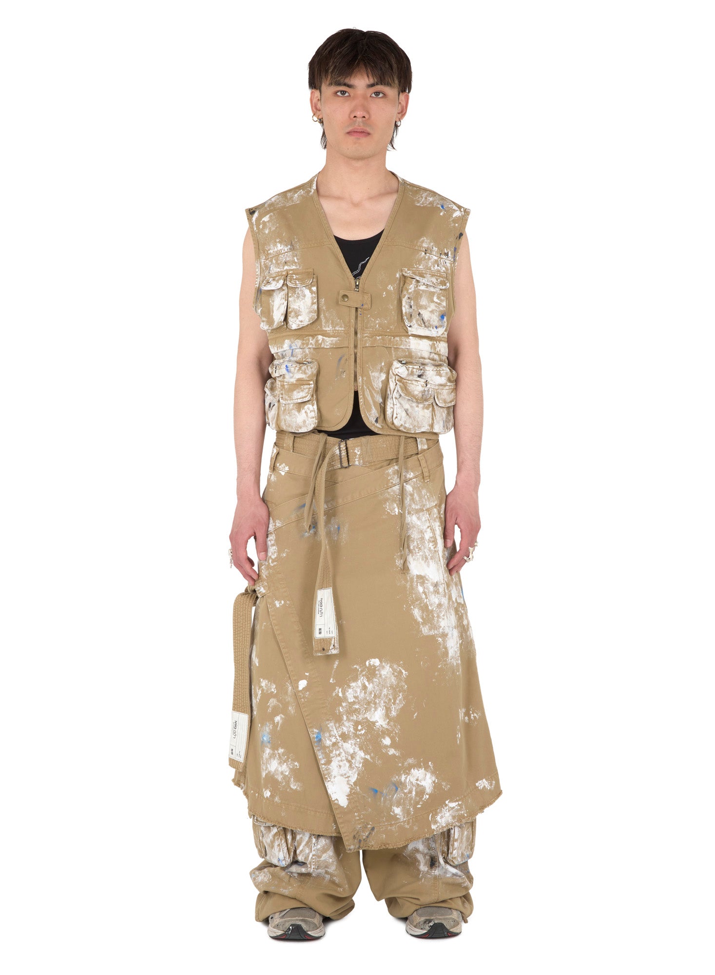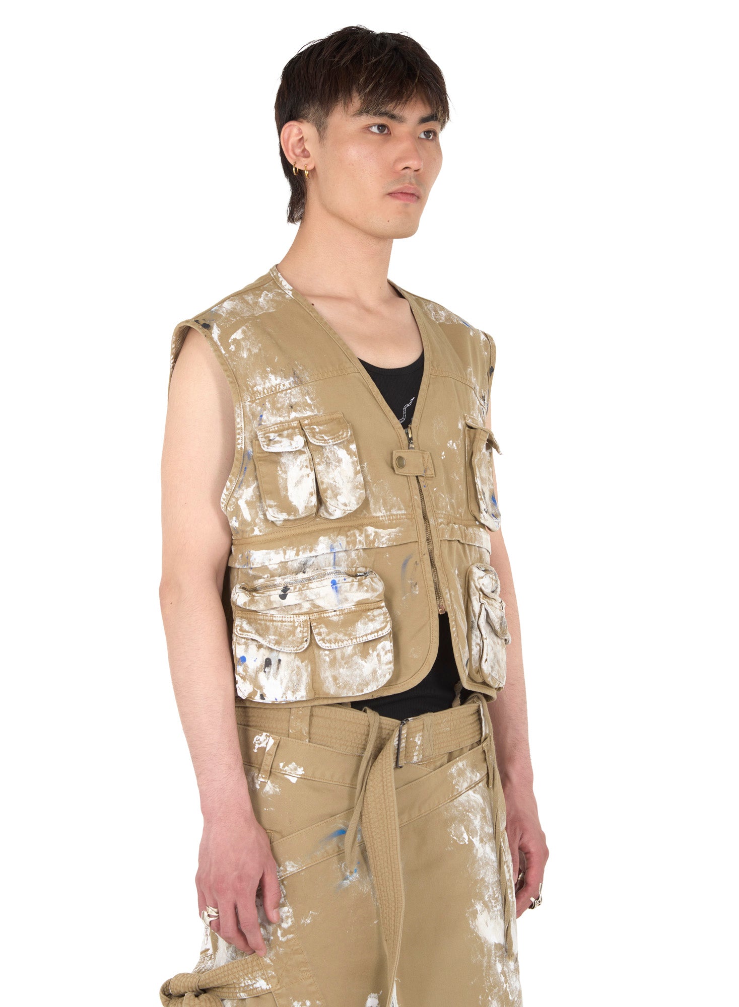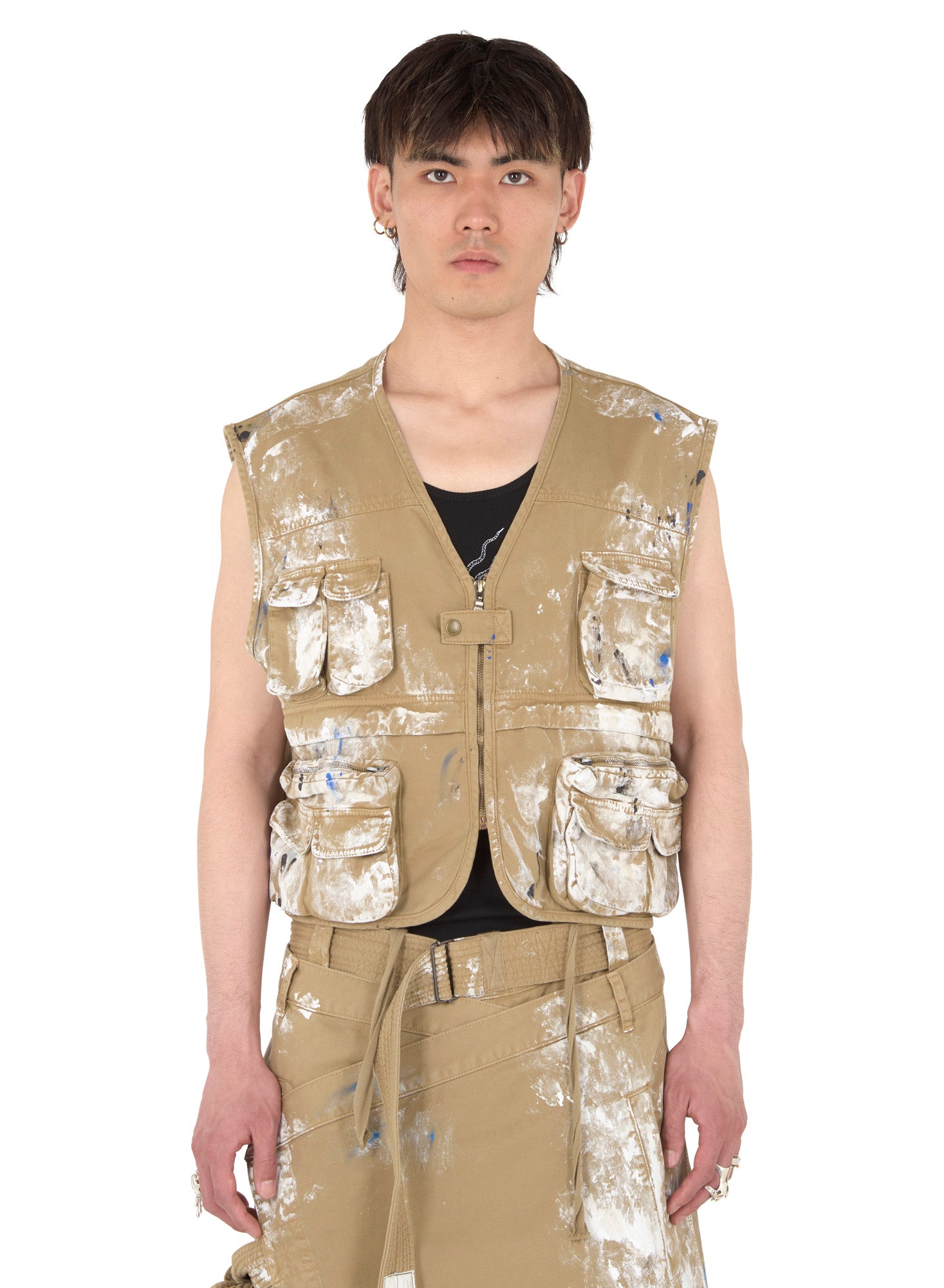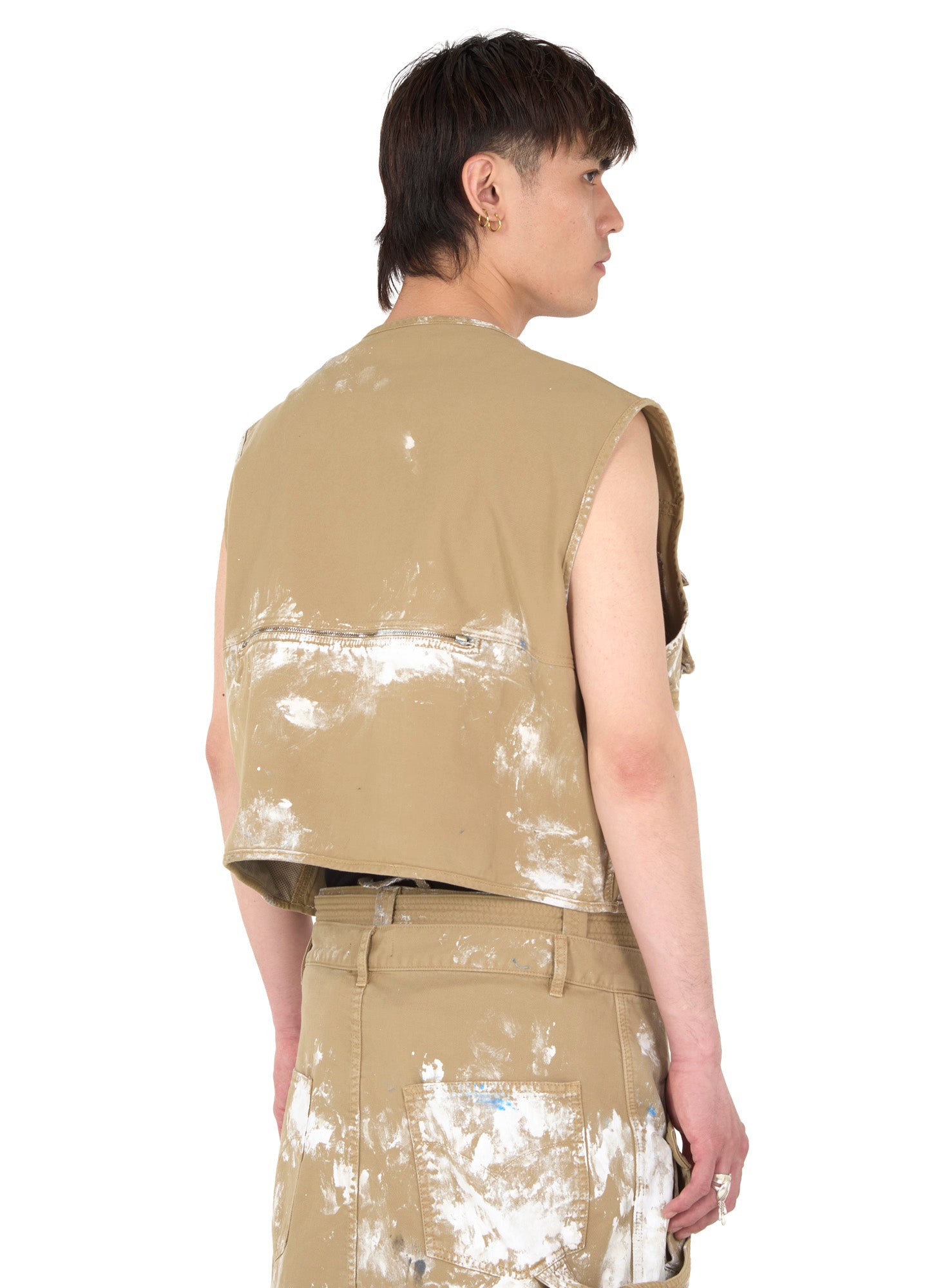 INSPIRED BY THE INIMITABLE STYLE OF PAINTERS AND BUILDERS YOU CAN FIND ON STREET CORNERS AROUND THE WORLD, WITH PAINT SPLATTERED ON THEIR CLOTHES FROM YEARS OF WORK AND WEAR. THIS VEST HAS BEEN GIVEN NEARLY THE SAME ATTENTION TO DETAIL. CROPPED AND WIDE, THIS PIECE SUITS EVERY BODY TYPE.