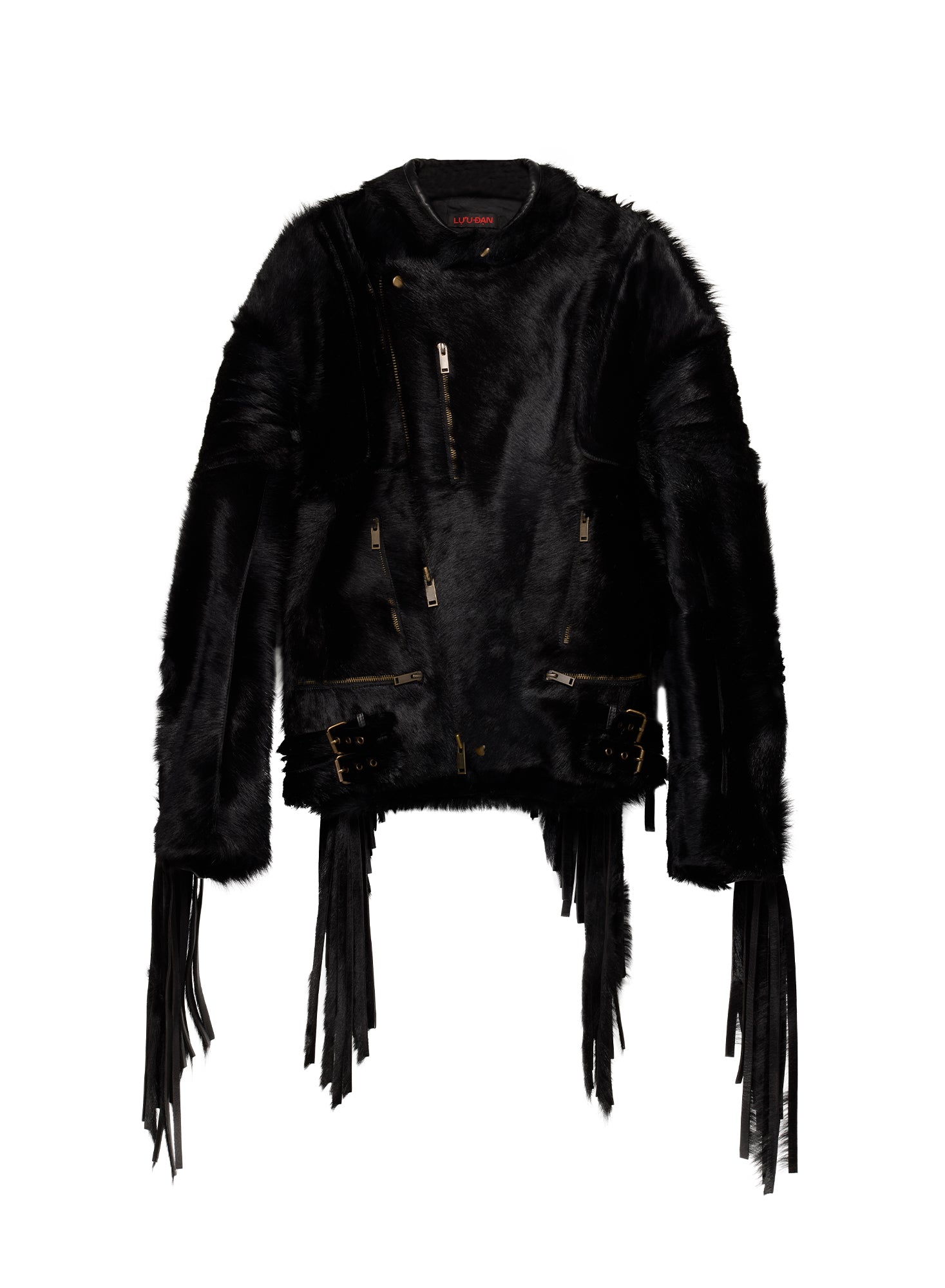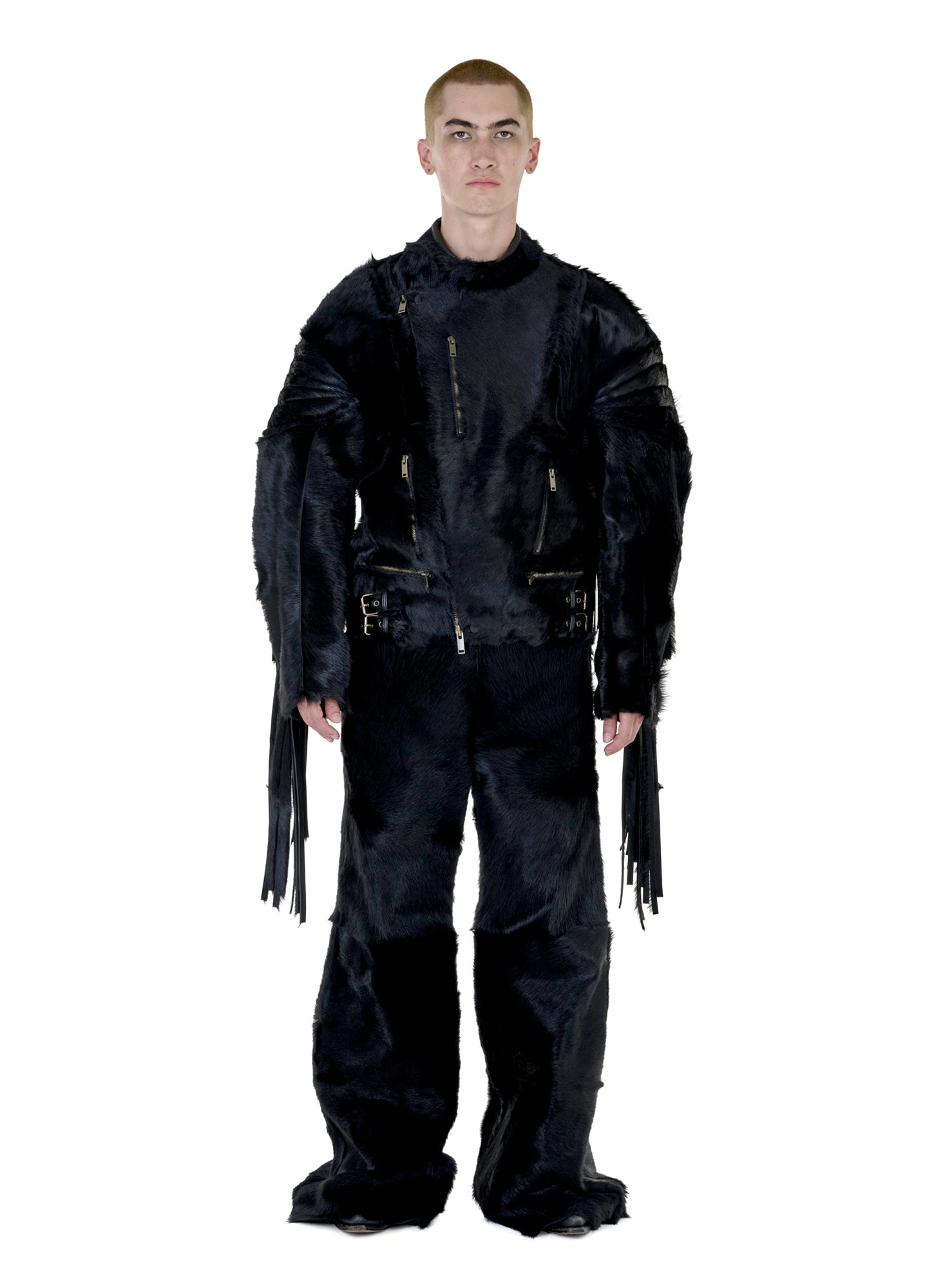 A MOTORCYCLE SILHOUETTE REWORKED THROUGH EQUESTRIAN POWER, THIS L-D JACKET IS CUT FROM BLACK PONY HAIR LEATHER WITH A SHARP, AGGRESSIVE PROFILE. BUILT TO MOVE LIKE A CHARGING STALLION, IT MERGES RACETRACK SPEED WITH RODEO DEFIANCE, LOADED WITH SLICK STRUCTURE AND REBEL ENERGY. MODEL WEARS SIZE M.