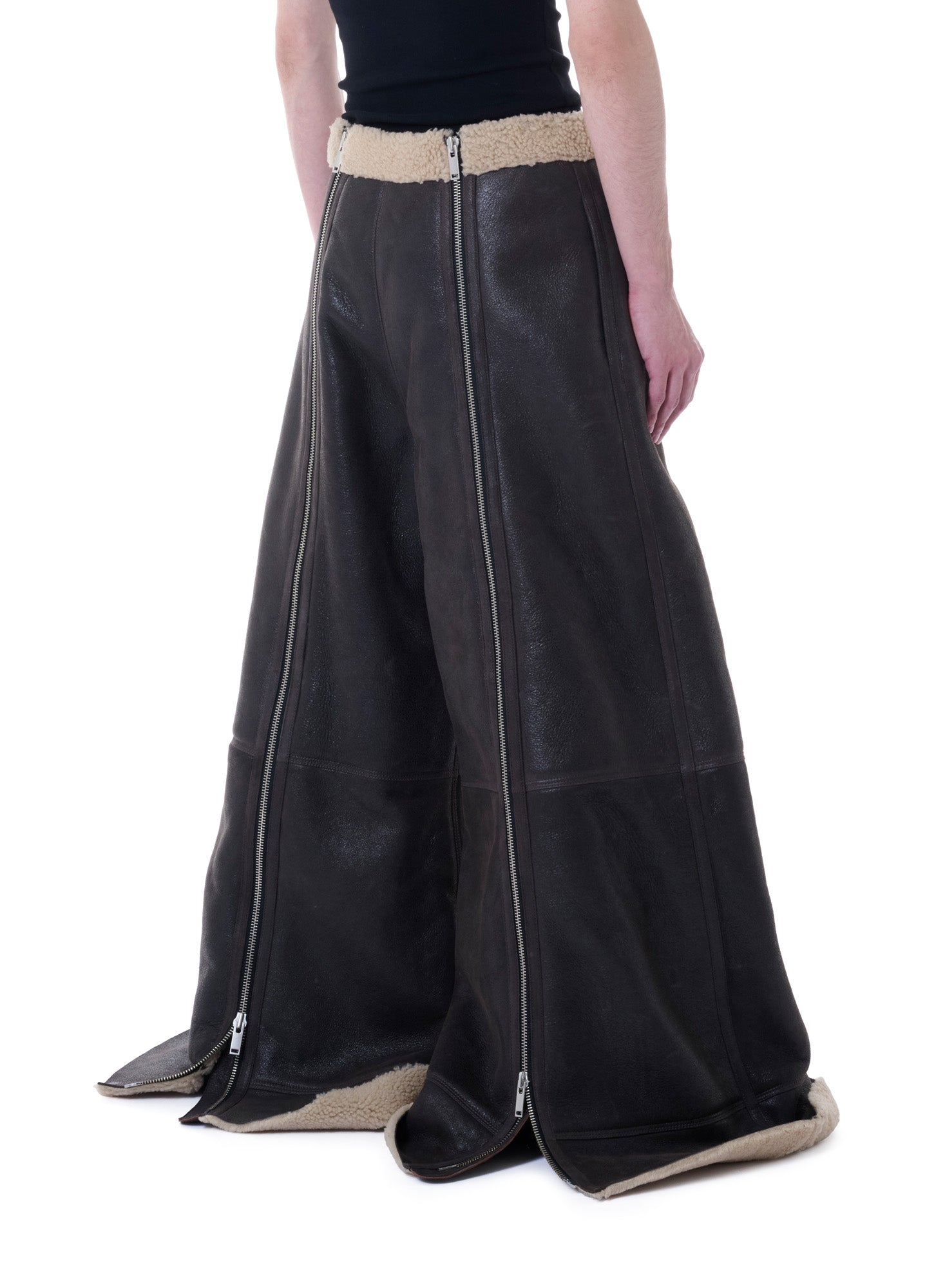 BUILT FROM DENSE SHEARLING WITH A SOFT LEATHER OUTER, THESE FLIGHT PANTS CHANNEL OLD MILITARY GEAR REWIRED FOR MODERN OUTLAWS. INSULATION WITHOUT BULK—JUST QUIET WARMTH AND A STRUCTURE THAT HOLDS ITS GROUND. RAW PANELLING AND HEAVY ZIPS GIVE THEM A GUERRILLA EDGE. MODEL WEARS A SIZE M.