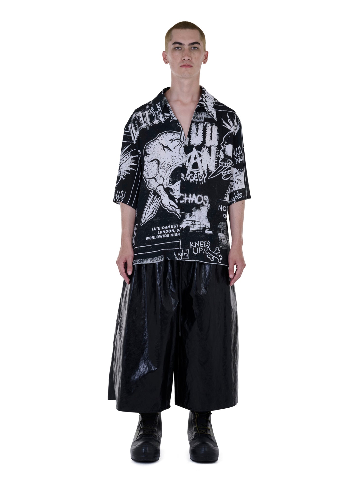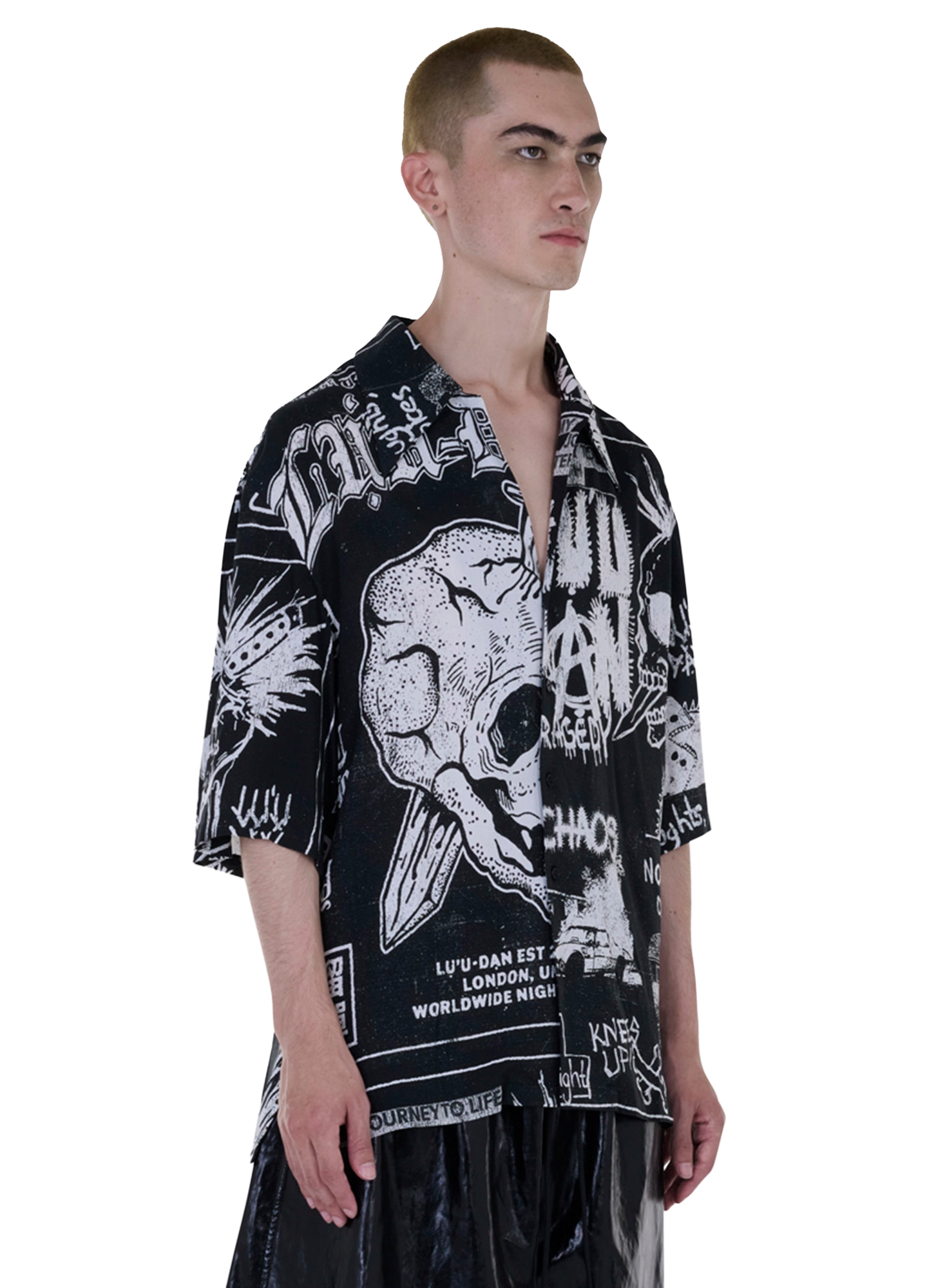 TOP BUTTON UNDONE AND LET THE SHIRT DO THE TALKING. CRAFTED FROM A 'PUNK FLYER' PRINTED FABRIC, THIS PIECE IS A FRESH CLASSIC. A TASTEFUL ADDITION TO ANY TAILORING LOOK OR TO BE WORN CASUALLY. MODEL WEARS A SIZE M.