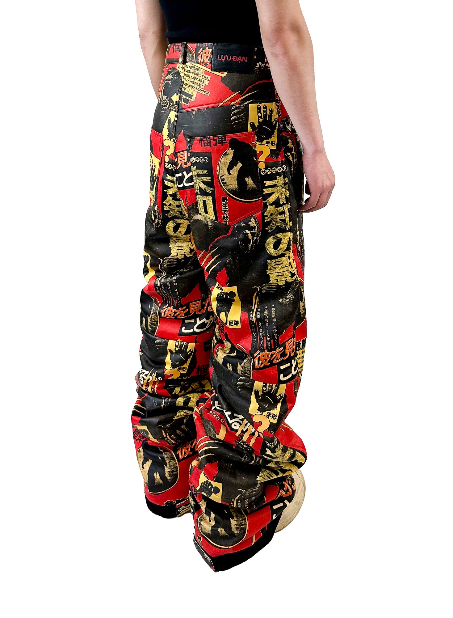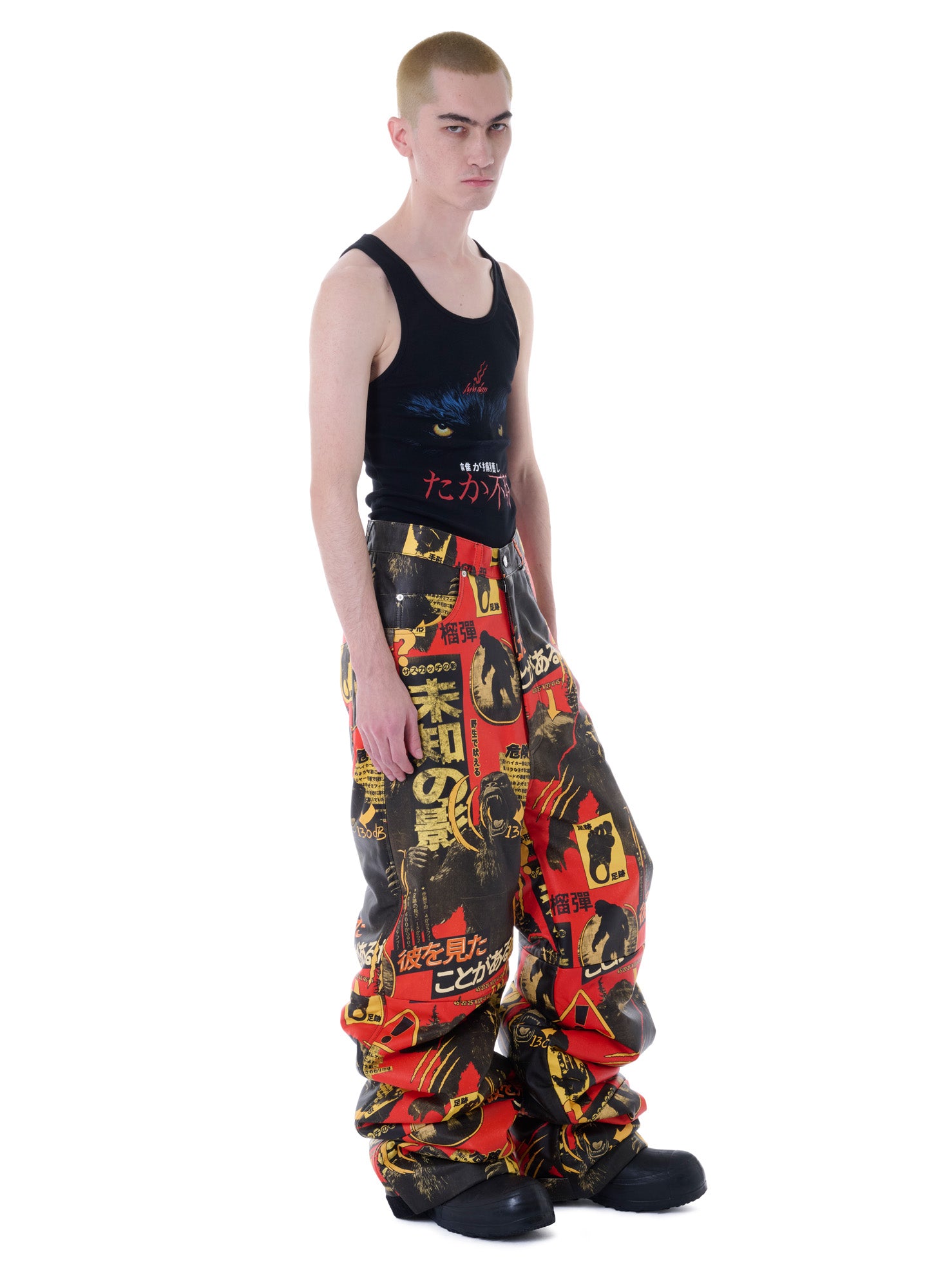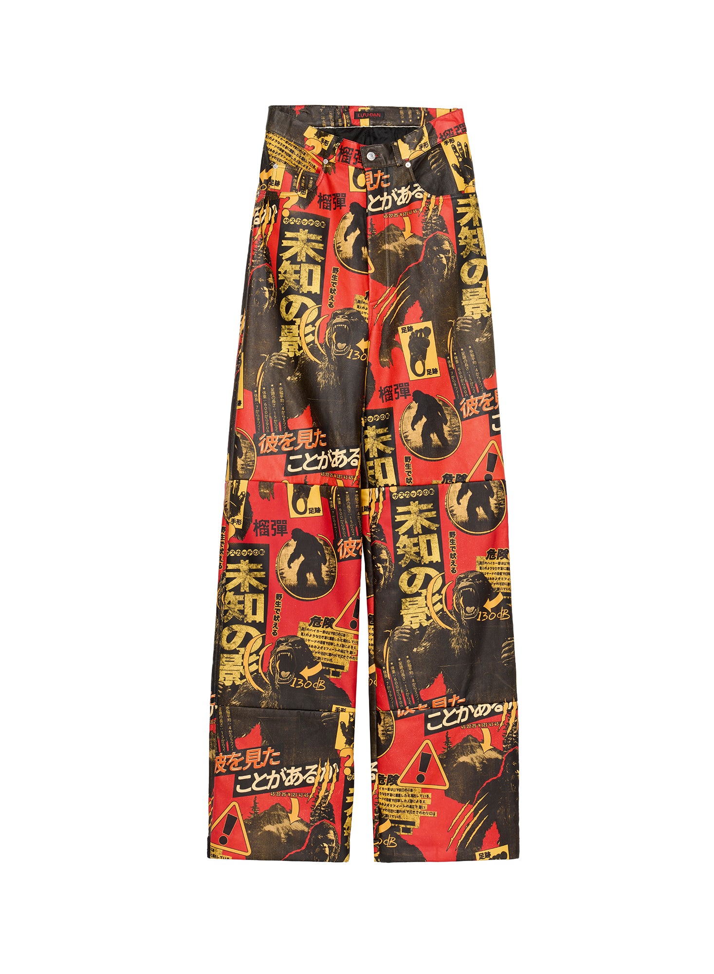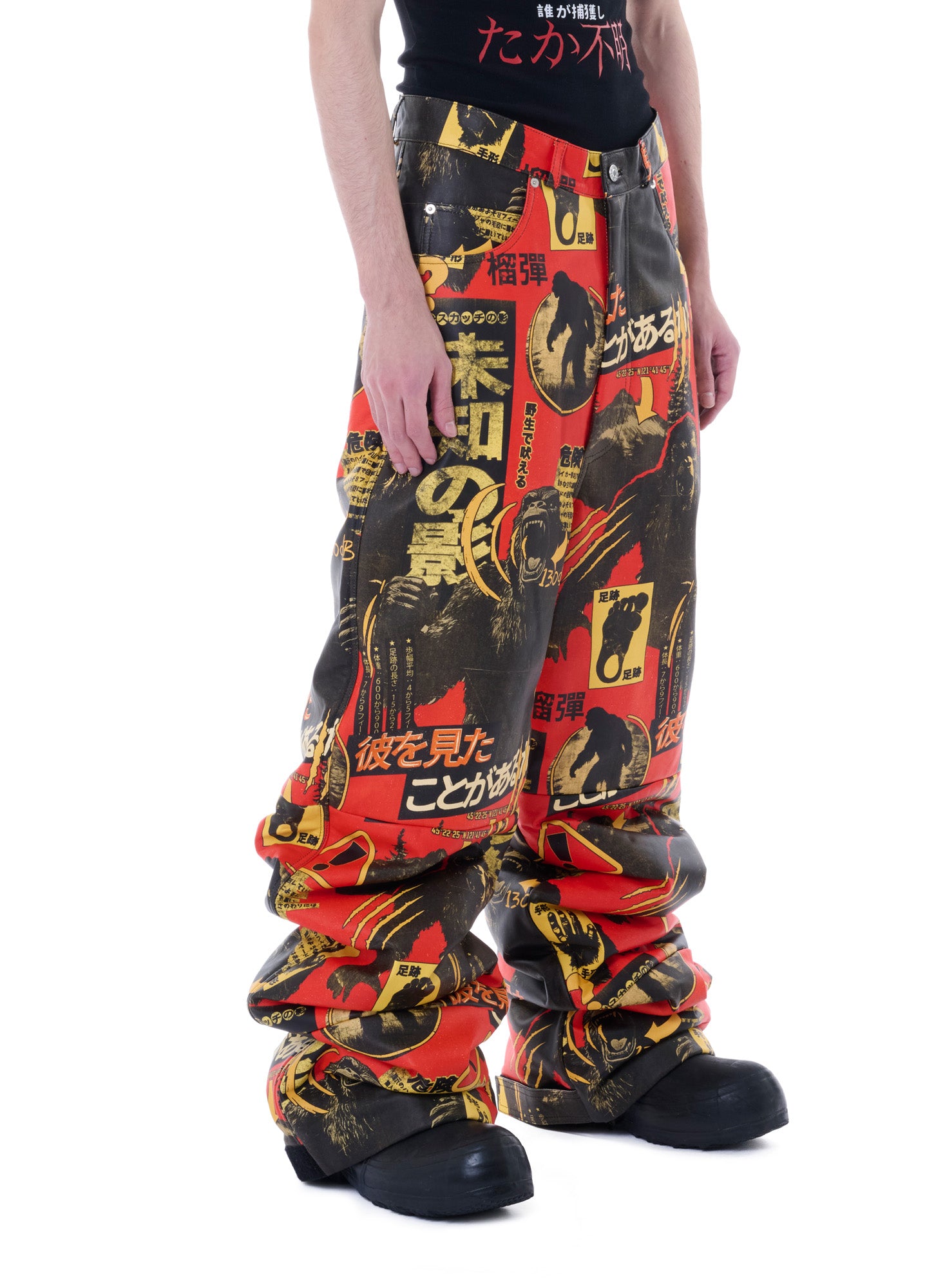 CRAFTED IN PRINTED NAPPA LEATHER WITH A SUBTLE GRAIN THAT CATCHES LIGHT LIKE A BURNER LEFT ON A TABLE. CUT LONG AND STACKED FOR A SLICK, SYNDICATE SILHOUETTE. THE WEIGHT FEELS AUTHORITATIVE, THE PRINT RUNS LIKE A LOWLIFE MAP—CODED, SLIGHTLY OFF, INTENTIONALLY SHARP. MODEL WEARS SAMPLE SIZE 32.