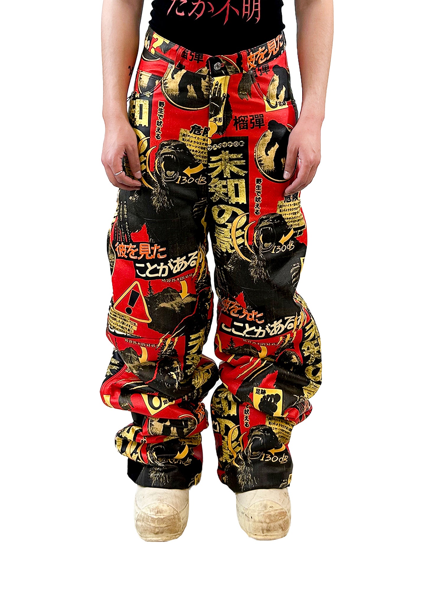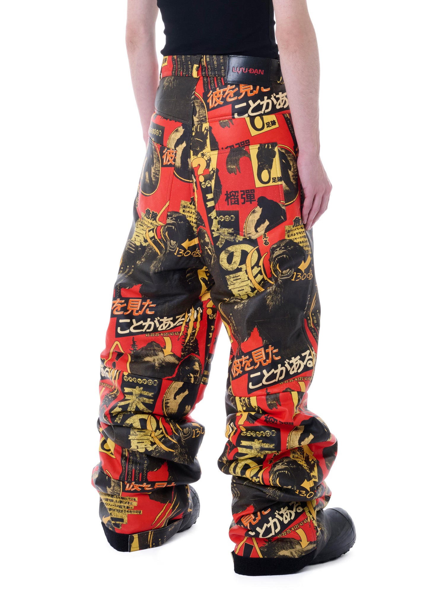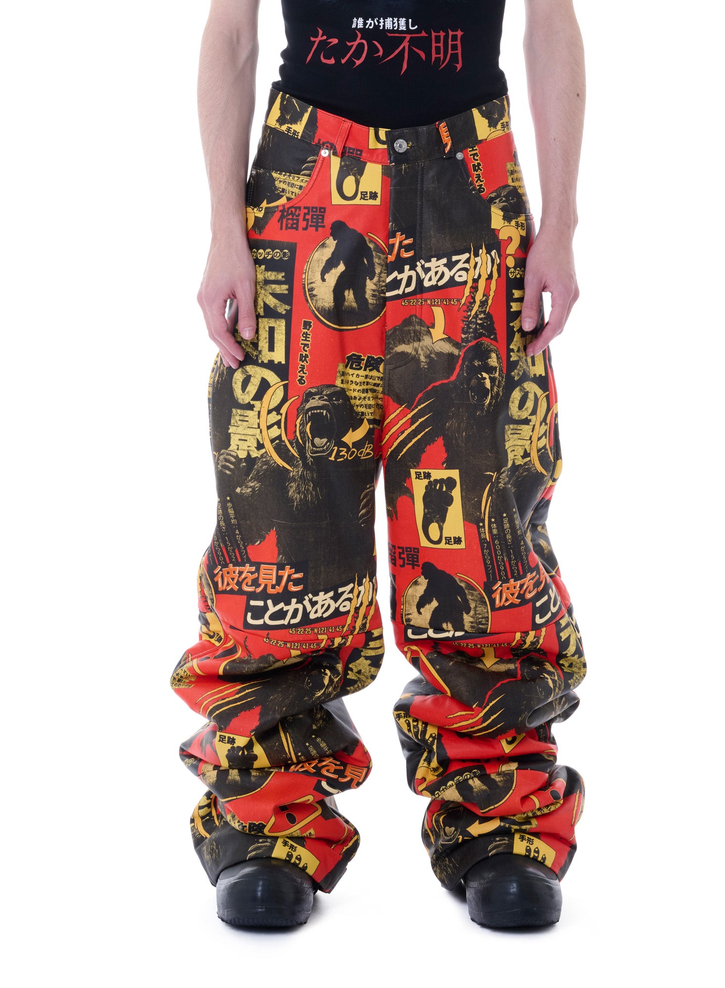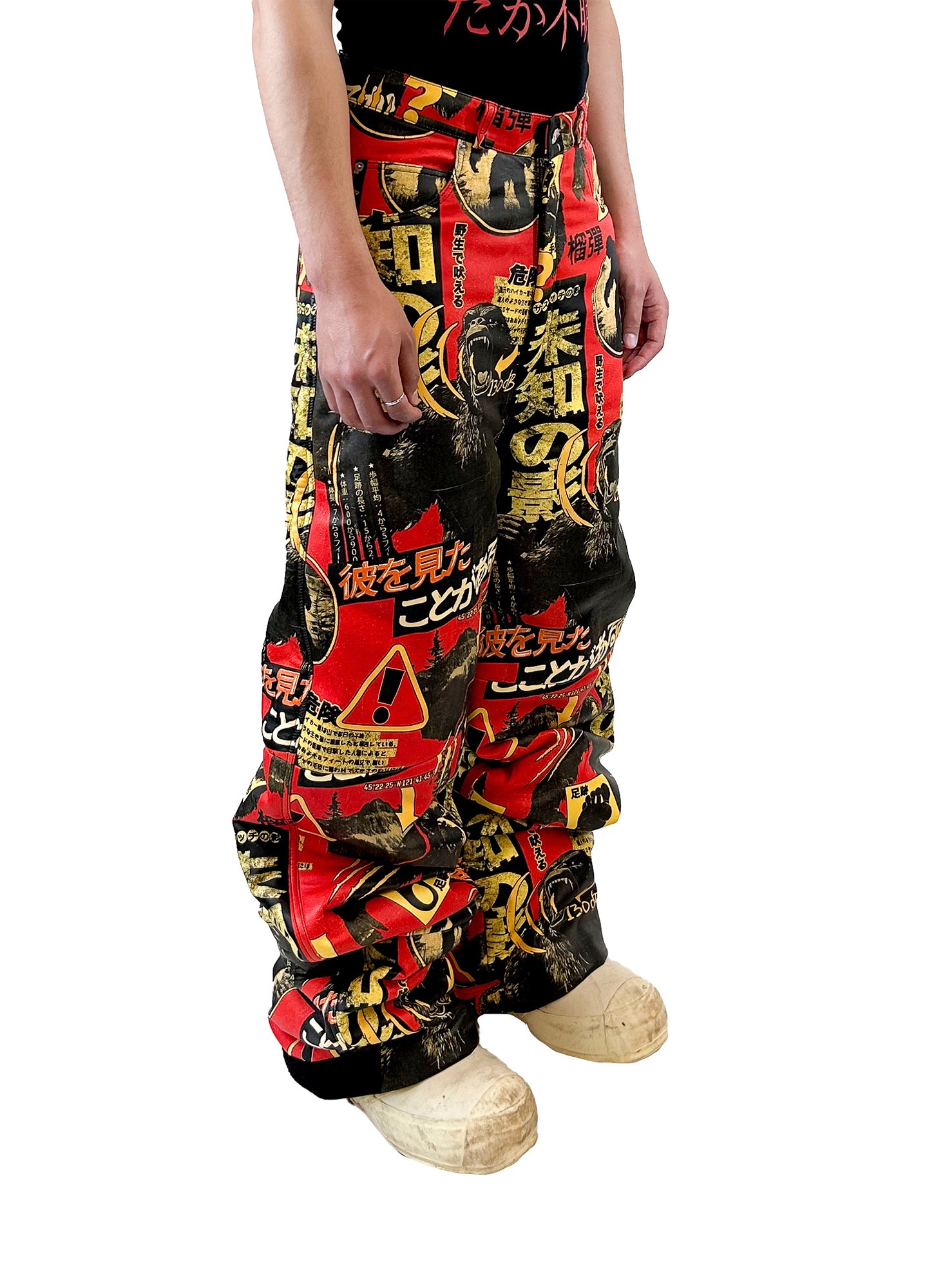 CRAFTED IN PRINTED NAPPA LEATHER WITH A SUBTLE GRAIN THAT CATCHES LIGHT LIKE A BURNER LEFT ON A TABLE. CUT LONG AND STACKED FOR A SLICK, SYNDICATE SILHOUETTE. THE WEIGHT FEELS AUTHORITATIVE, THE PRINT RUNS LIKE A LOWLIFE MAP—CODED, SLIGHTLY OFF, INTENTIONALLY SHARP. MODEL WEARS SAMPLE SIZE 32.