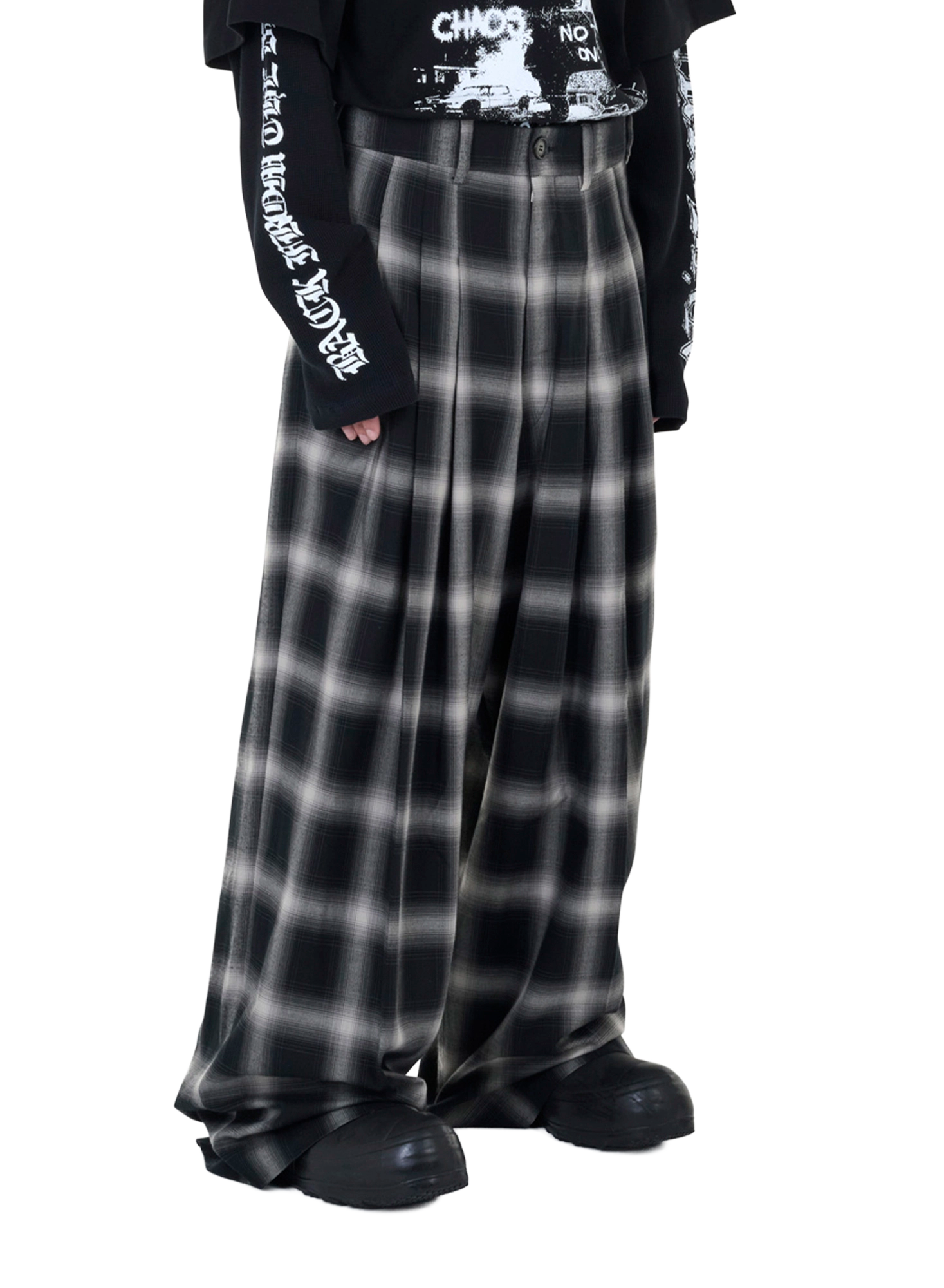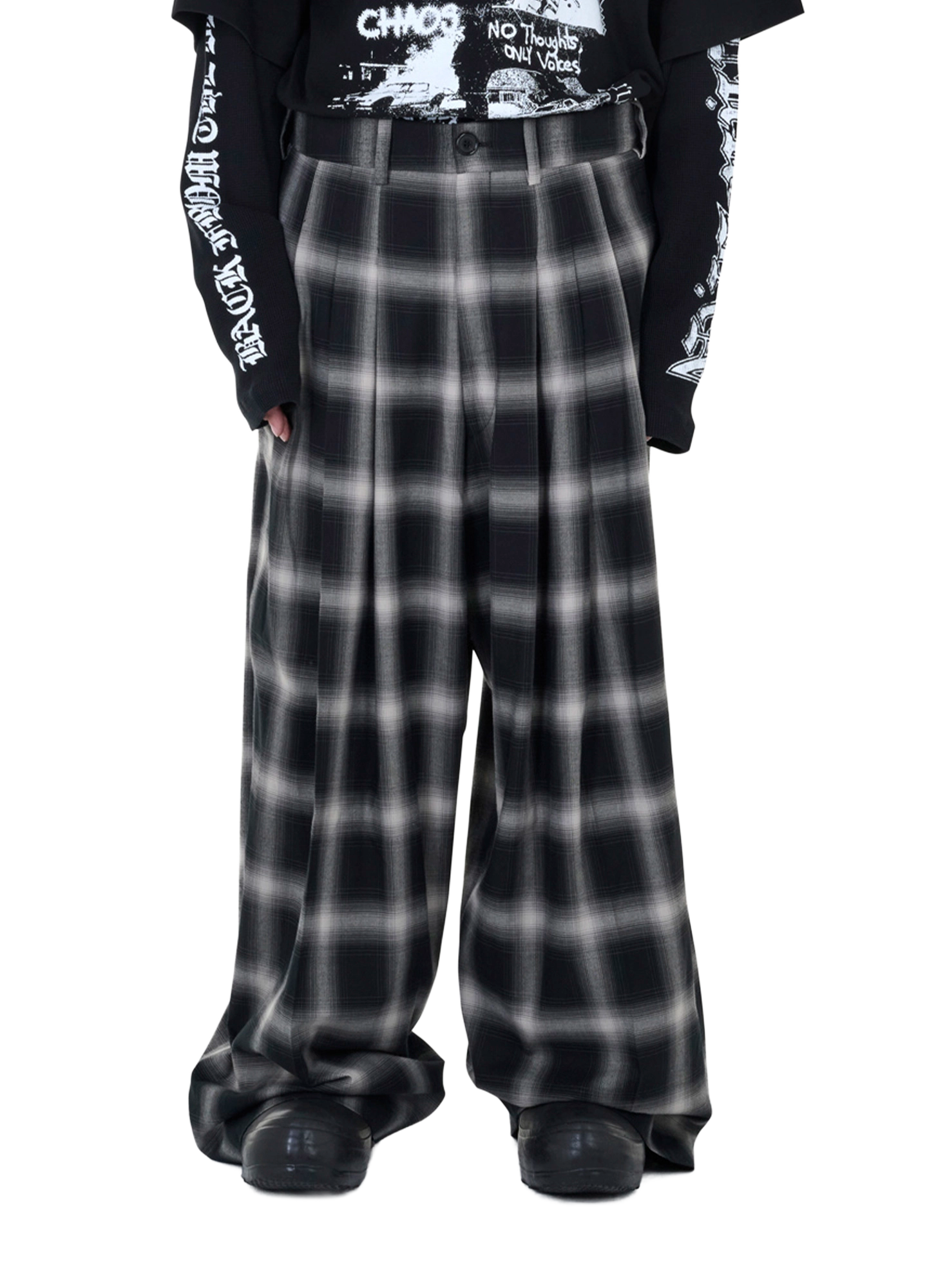 A TAILORED SILHOUETTE EXAGGERATED THROUGH VOLUME AND PATTERN. TRIPLE FRONT PLEATS INTRODUCE MOVEMENT AND WEIGHT, WHILE THE OMBRE CHECK FINISH GIVES THE TROUSERS A WORN, ALMOST CINEMATIC DEPTH. MODEL WEARS SIZE 50.