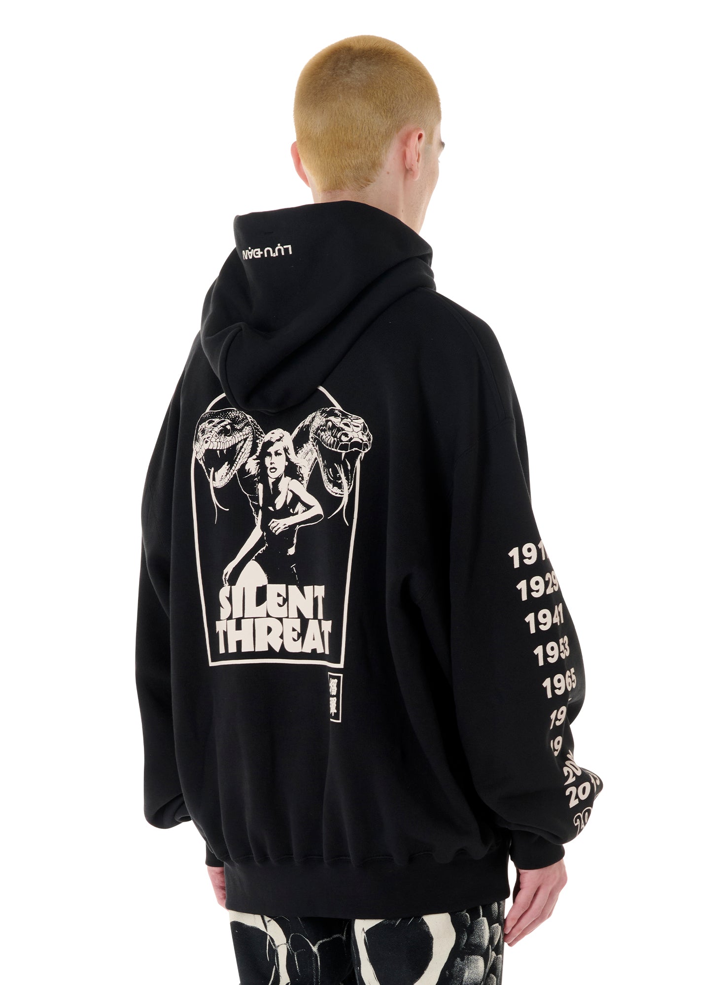 OVERSIZED AND COMFORTABLE THIS HOODIE CHANNELS THE YOUTHFUL SPIRIT OF 90’S STREETWEAR. FEATURING A DRAWSTRING HOOD, FRONT POCKET AND OF COURSE THE ICONIC ’SILENT THREAT DAMSEL’ GRAPHIC, IT LOOKS GREAT WITH ANY PANT COMBO. MODEL WEARS A SIZE M.